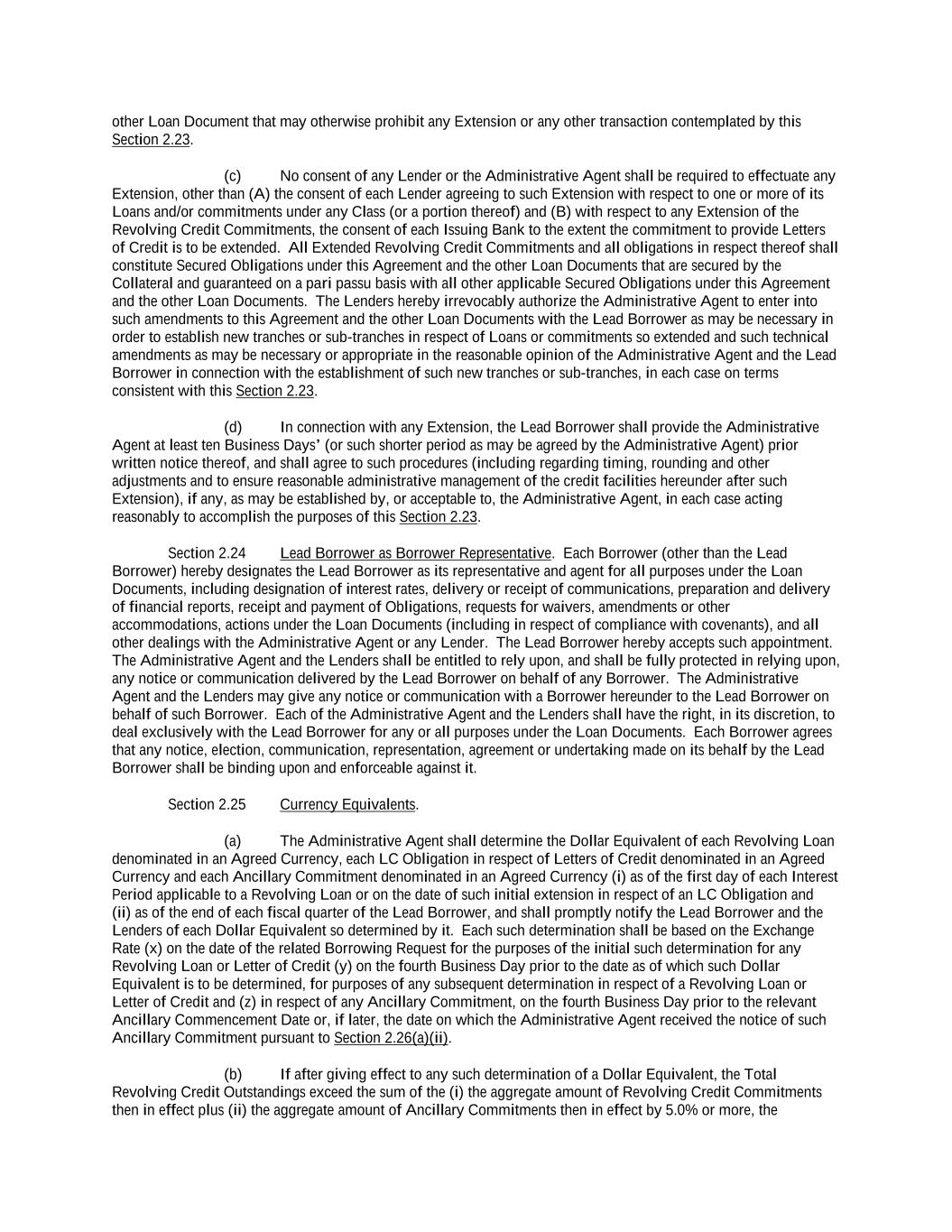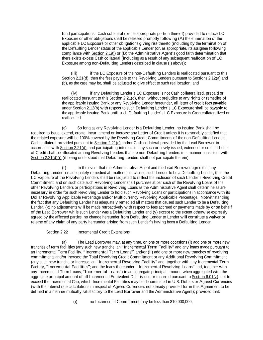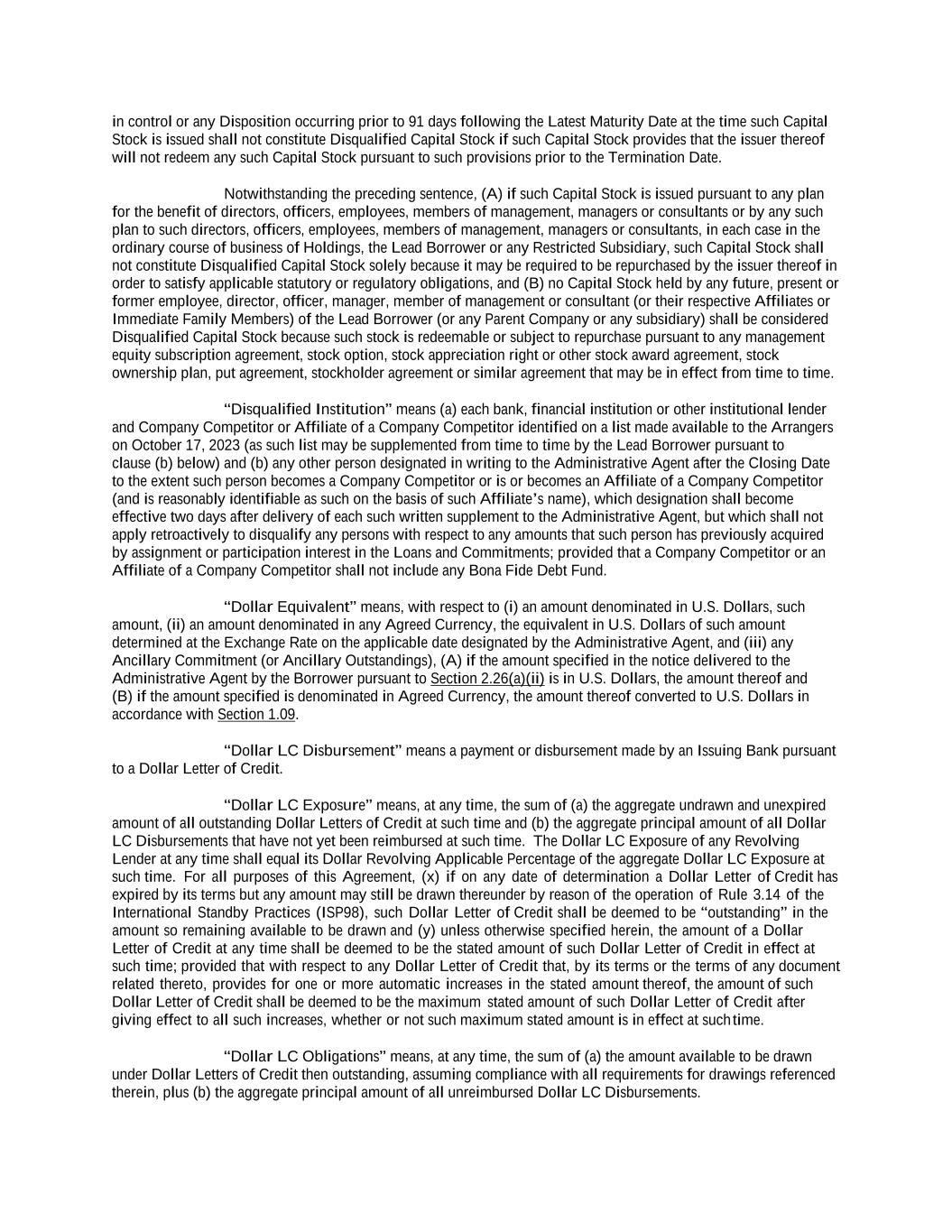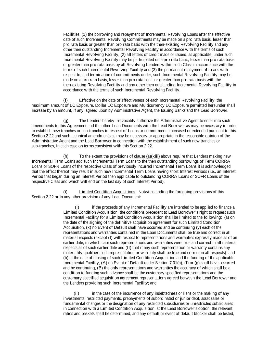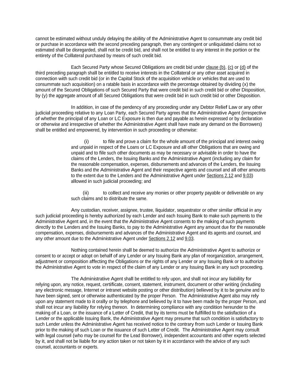 -ii- 61234327 #97236474v29 Section 2.17 Taxes. ............................................................................................................................................ 88 Section 2.18 Payments Generally; Allocation of Proceeds; Sharing of Payments. ............................................ 91 Section 2.19 Mitigation Obligations; Replacement of Lenders. ........................................................................ 93 Section 2.20 Illegality. ....................................................................................................................................... 94 Section 2.21 Defaulting Lenders ........................................................................................................................ 95 Section 2.22 Incremental Credit Extensions. ..................................................................................................... 97 Section 2.23 Extensions of Loans and Revolving Commitments. ................................................................... 102 Section 2.24 Lead Borrower as Borrower Representative ............................................................................... 104 Section 2.25 Currency Equivalents. ................................................................................................................. 104 Section 2.26 Ancillary Facilities. ..................................................................................................................... 105 Section 2.27 Benchmark Replacement. ........................................................................................................... 109 Section 2.28 Canadian Benchmark Replacement Setting. ............................................................................... 111 ARTICLE 3 REPRESENTATIONS AND WARRANTIES Section 3.01 Organization; Powers .................................................................................................................. 112 Section 3.02 Authorization; Enforceability...................................................................................................... 113 Section 3.03 Governmental Approvals; No Conflicts ...................................................................................... 113 Section 3.04 Financial Condition; No Material Adverse Effect. ..................................................................... 113 Section 3.05 Properties; Intellectual Property. ................................................................................................. 113 Section 3.06 Litigation and Environmental Matters. ....................................................................................... 114 Section 3.07 Compliance with Laws ................................................................................................................ 114 Section 3.08 Investment Company Status ........................................................................................................ 114 Section 3.09 Taxes ........................................................................................................................................... 114 Section 3.10 ERISA. ........................................................................................................................................ 114 Section 3.11 Disclosure. .................................................................................................................................. 114 Section 3.12 Solvency ...................................................................................................................................... 115 Section 3.13 Capitalization and Subsidiaries ................................................................................................... 115 Section 3.14 Security Interest in Collateral...................................................................................................... 115 Section 3.15 Labor Disputes ............................................................................................................................ 115 Section 3.16 Federal Reserve Regulations. ...................................................................................................... 115 Section 3.17 Economic and Trade Sanctions and Anti-Corruption Laws. ....................................................... 116 Section 3.18 Senior Indebtedness .................................................................................................................... 116 Section 3.19 Use of Proceeds ........................................................................................................................... 116 Section 3.20 Insurance ..................................................................................................................................... 116 Section 3.21 Central Administration; COMI ................................................................................................... 116