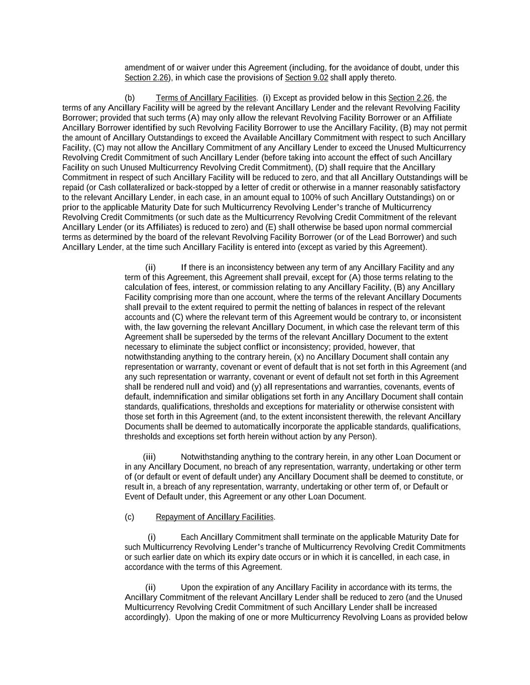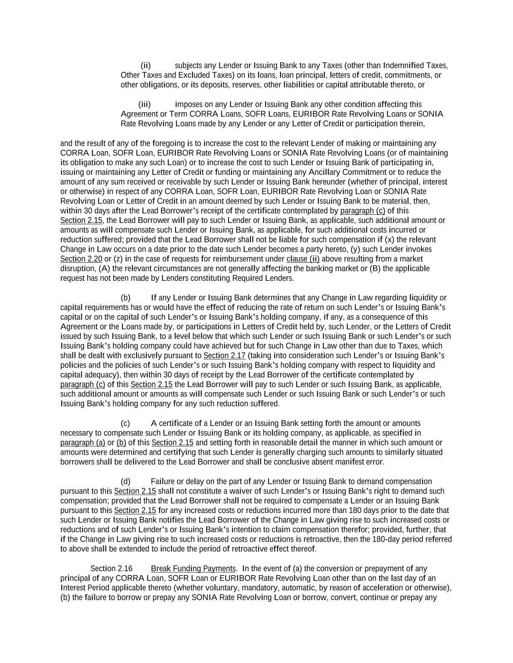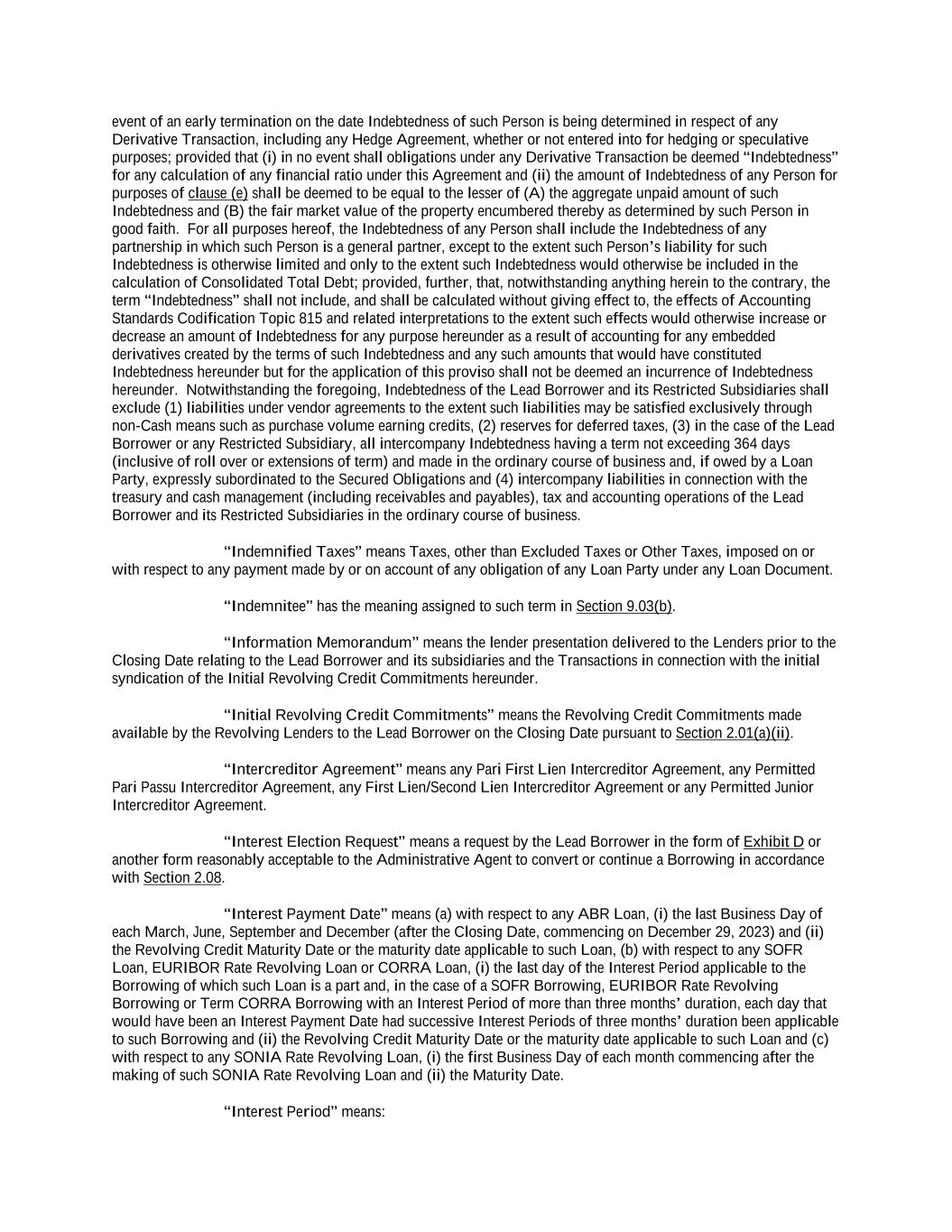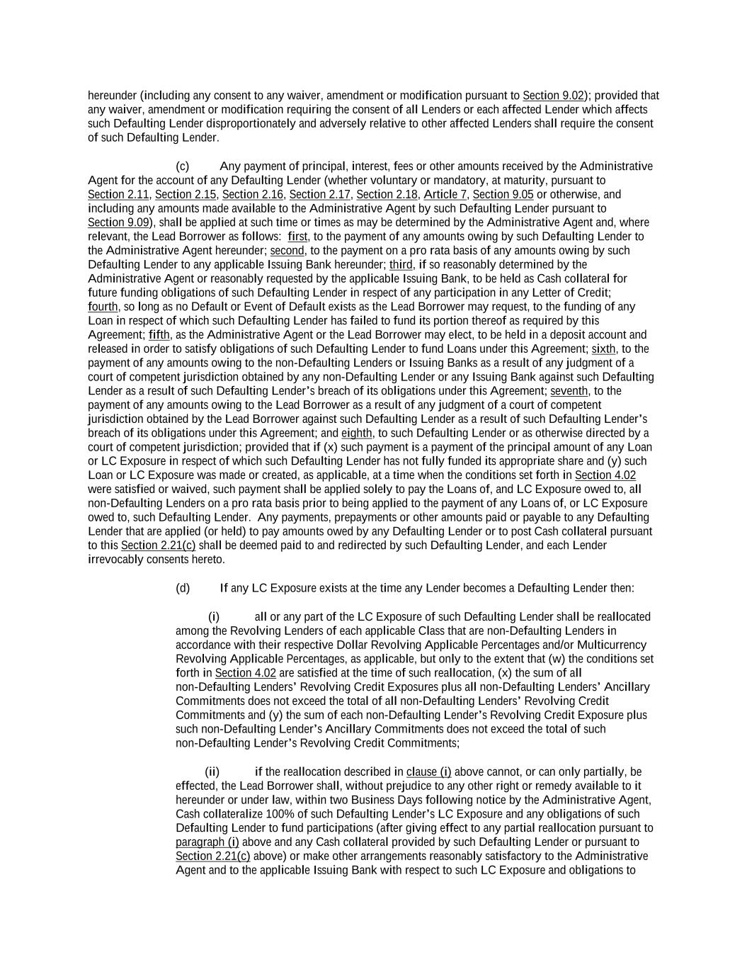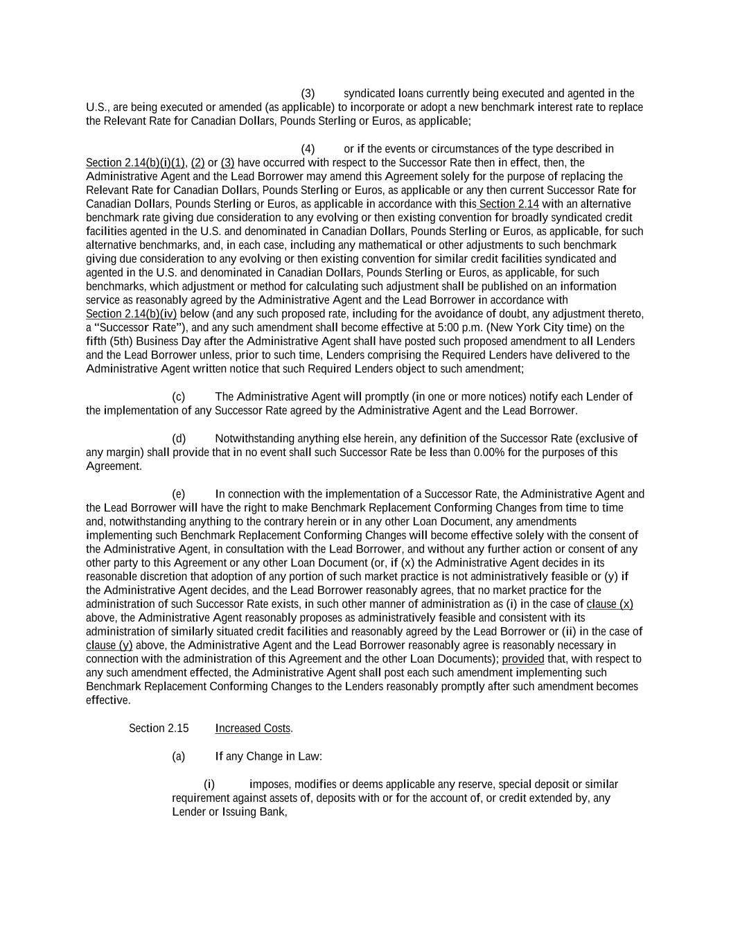 -ii- 61234327 #97236474v29 Section 2.17 Taxes. ............................................................................................................................................ 88 Section 2.18 Payments Generally; Allocation of Proceeds; Sharing of Payments. ............................................ 91 Section 2.19 Mitigation Obligations; Replacement of Lenders. ........................................................................ 93 Section 2.20 Illegality. ....................................................................................................................................... 94 Section 2.21 Defaulting Lenders ........................................................................................................................ 95 Section 2.22 Incremental Credit Extensions. ..................................................................................................... 97 Section 2.23 Extensions of Loans and Revolving Commitments. ................................................................... 102 Section 2.24 Lead Borrower as Borrower Representative ............................................................................... 104 Section 2.25 Currency Equivalents. ................................................................................................................. 104 Section 2.26 Ancillary Facilities. ..................................................................................................................... 105 Section 2.27 Benchmark Replacement. ........................................................................................................... 109 Section 2.28 Canadian Benchmark Replacement Setting. ............................................................................... 111 ARTICLE 3 REPRESENTATIONS AND WARRANTIES Section 3.01 Organization; Powers .................................................................................................................. 112 Section 3.02 Authorization; Enforceability...................................................................................................... 113 Section 3.03 Governmental Approvals; No Conflicts ...................................................................................... 113 Section 3.04 Financial Condition; No Material Adverse Effect. ..................................................................... 113 Section 3.05 Properties; Intellectual Property. ................................................................................................. 113 Section 3.06 Litigation and Environmental Matters. ....................................................................................... 114 Section 3.07 Compliance with Laws ................................................................................................................ 114 Section 3.08 Investment Company Status ........................................................................................................ 114 Section 3.09 Taxes ........................................................................................................................................... 114 Section 3.10 ERISA. ........................................................................................................................................ 114 Section 3.11 Disclosure. .................................................................................................................................. 114 Section 3.12 Solvency ...................................................................................................................................... 115 Section 3.13 Capitalization and Subsidiaries ................................................................................................... 115 Section 3.14 Security Interest in Collateral...................................................................................................... 115 Section 3.15 Labor Disputes ............................................................................................................................ 115 Section 3.16 Federal Reserve Regulations. ...................................................................................................... 115 Section 3.17 Economic and Trade Sanctions and Anti-Corruption Laws. ....................................................... 116 Section 3.18 Senior Indebtedness .................................................................................................................... 116 Section 3.19 Use of Proceeds ........................................................................................................................... 116 Section 3.20 Insurance ..................................................................................................................................... 116 Section 3.21 Central Administration; COMI ................................................................................................... 116
