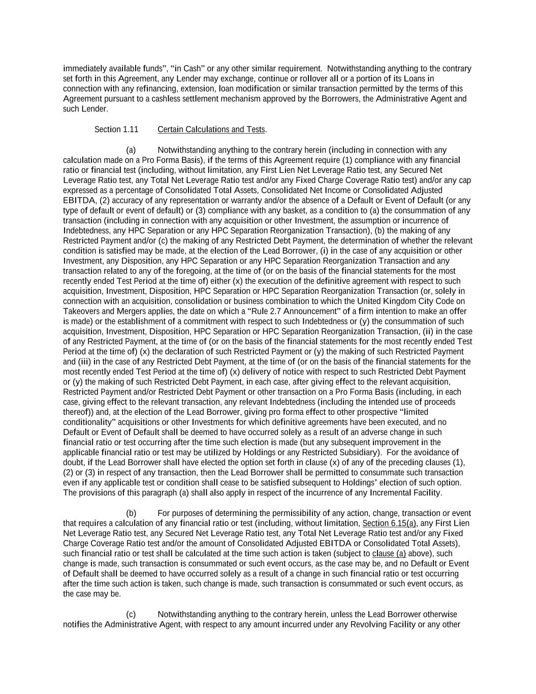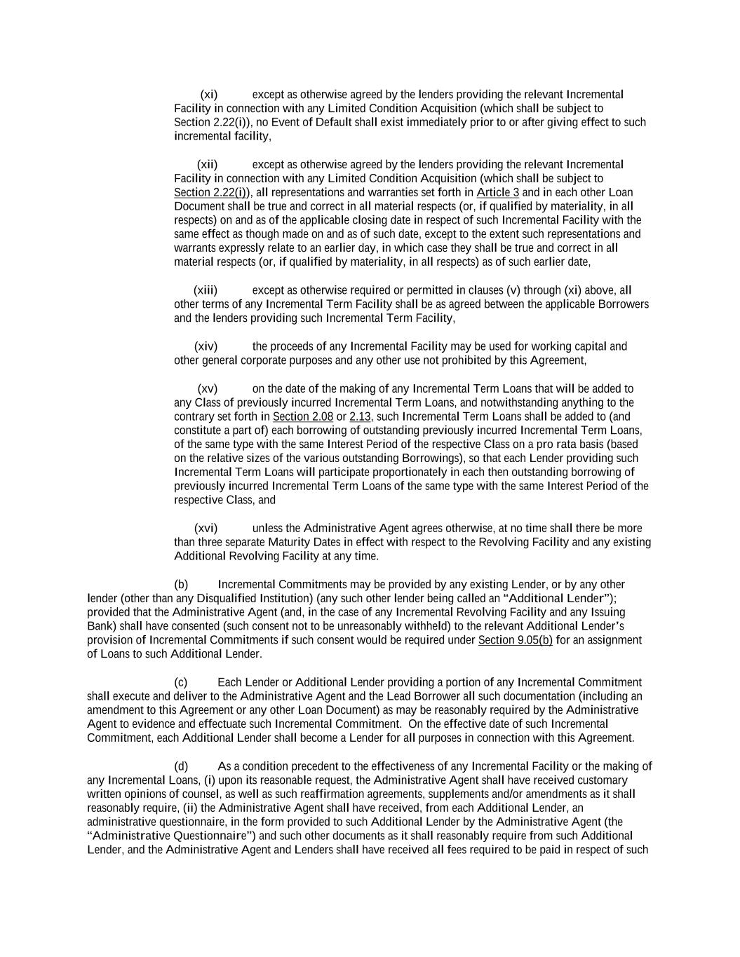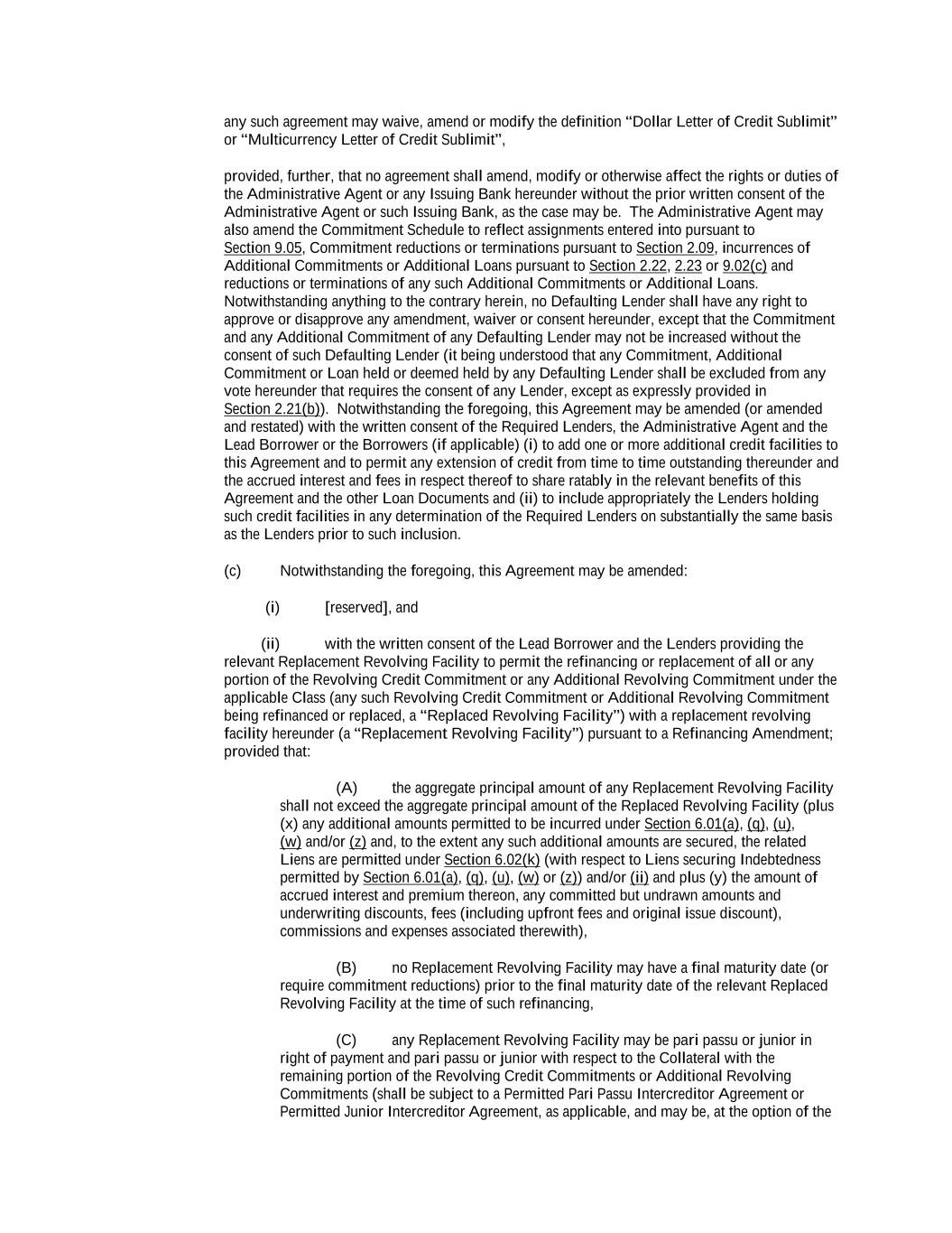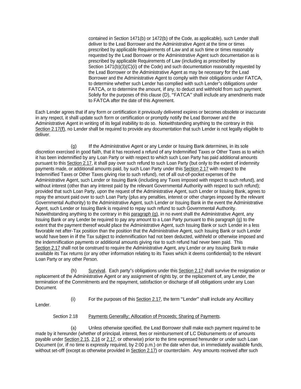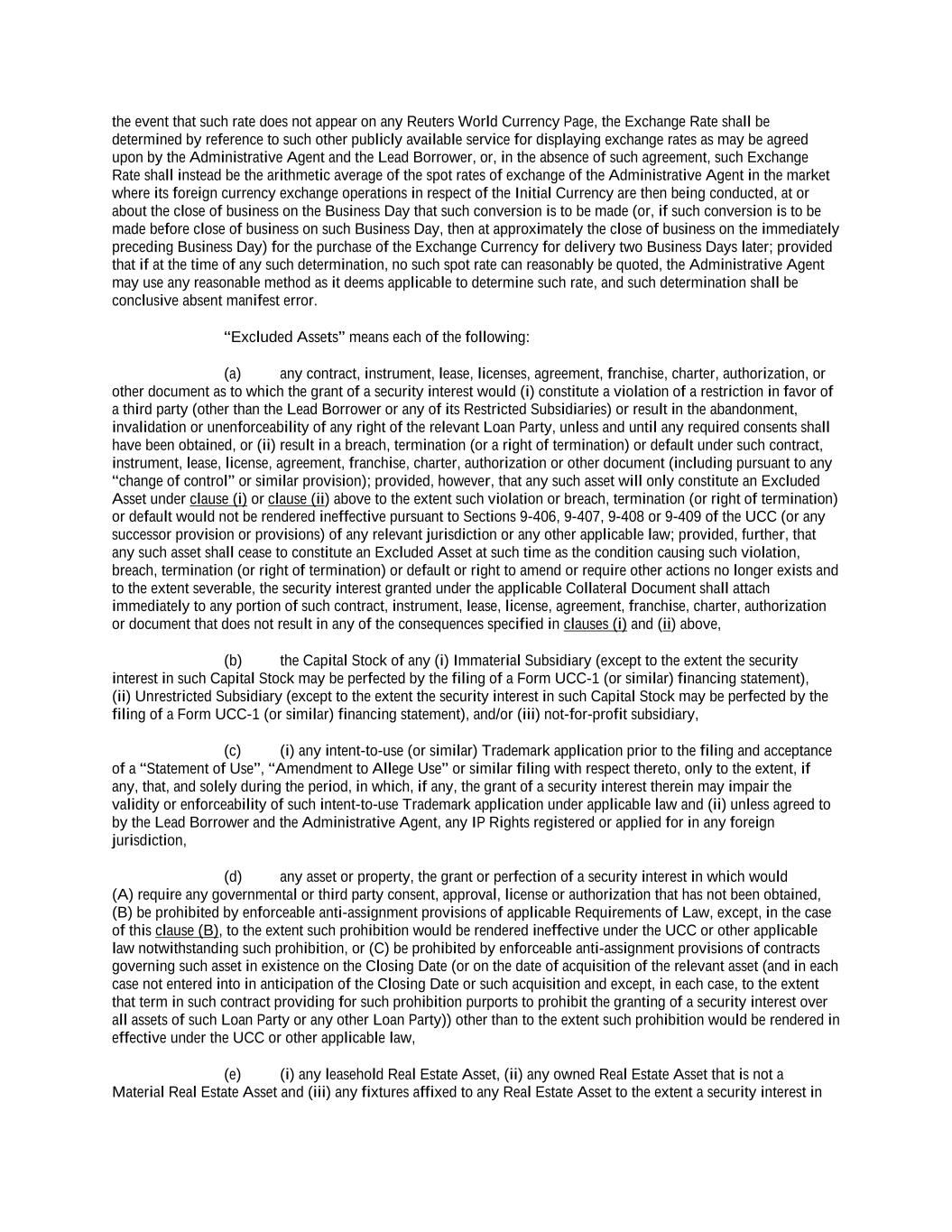 -ii- 61234327 #97236474v29 Section 2.17 Taxes. ............................................................................................................................................ 88 Section 2.18 Payments Generally; Allocation of Proceeds; Sharing of Payments. ............................................ 91 Section 2.19 Mitigation Obligations; Replacement of Lenders. ........................................................................ 93 Section 2.20 Illegality. ....................................................................................................................................... 94 Section 2.21 Defaulting Lenders ........................................................................................................................ 95 Section 2.22 Incremental Credit Extensions. ..................................................................................................... 97 Section 2.23 Extensions of Loans and Revolving Commitments. ................................................................... 102 Section 2.24 Lead Borrower as Borrower Representative ............................................................................... 104 Section 2.25 Currency Equivalents. ................................................................................................................. 104 Section 2.26 Ancillary Facilities. ..................................................................................................................... 105 Section 2.27 Benchmark Replacement. ........................................................................................................... 109 Section 2.28 Canadian Benchmark Replacement Setting. ............................................................................... 111 ARTICLE 3 REPRESENTATIONS AND WARRANTIES Section 3.01 Organization; Powers .................................................................................................................. 112 Section 3.02 Authorization; Enforceability...................................................................................................... 113 Section 3.03 Governmental Approvals; No Conflicts ...................................................................................... 113 Section 3.04 Financial Condition; No Material Adverse Effect. ..................................................................... 113 Section 3.05 Properties; Intellectual Property. ................................................................................................. 113 Section 3.06 Litigation and Environmental Matters. ....................................................................................... 114 Section 3.07 Compliance with Laws ................................................................................................................ 114 Section 3.08 Investment Company Status ........................................................................................................ 114 Section 3.09 Taxes ........................................................................................................................................... 114 Section 3.10 ERISA. ........................................................................................................................................ 114 Section 3.11 Disclosure. .................................................................................................................................. 114 Section 3.12 Solvency ...................................................................................................................................... 115 Section 3.13 Capitalization and Subsidiaries ................................................................................................... 115 Section 3.14 Security Interest in Collateral...................................................................................................... 115 Section 3.15 Labor Disputes ............................................................................................................................ 115 Section 3.16 Federal Reserve Regulations. ...................................................................................................... 115 Section 3.17 Economic and Trade Sanctions and Anti-Corruption Laws. ....................................................... 116 Section 3.18 Senior Indebtedness .................................................................................................................... 116 Section 3.19 Use of Proceeds ........................................................................................................................... 116 Section 3.20 Insurance ..................................................................................................................................... 116 Section 3.21 Central Administration; COMI ................................................................................................... 116