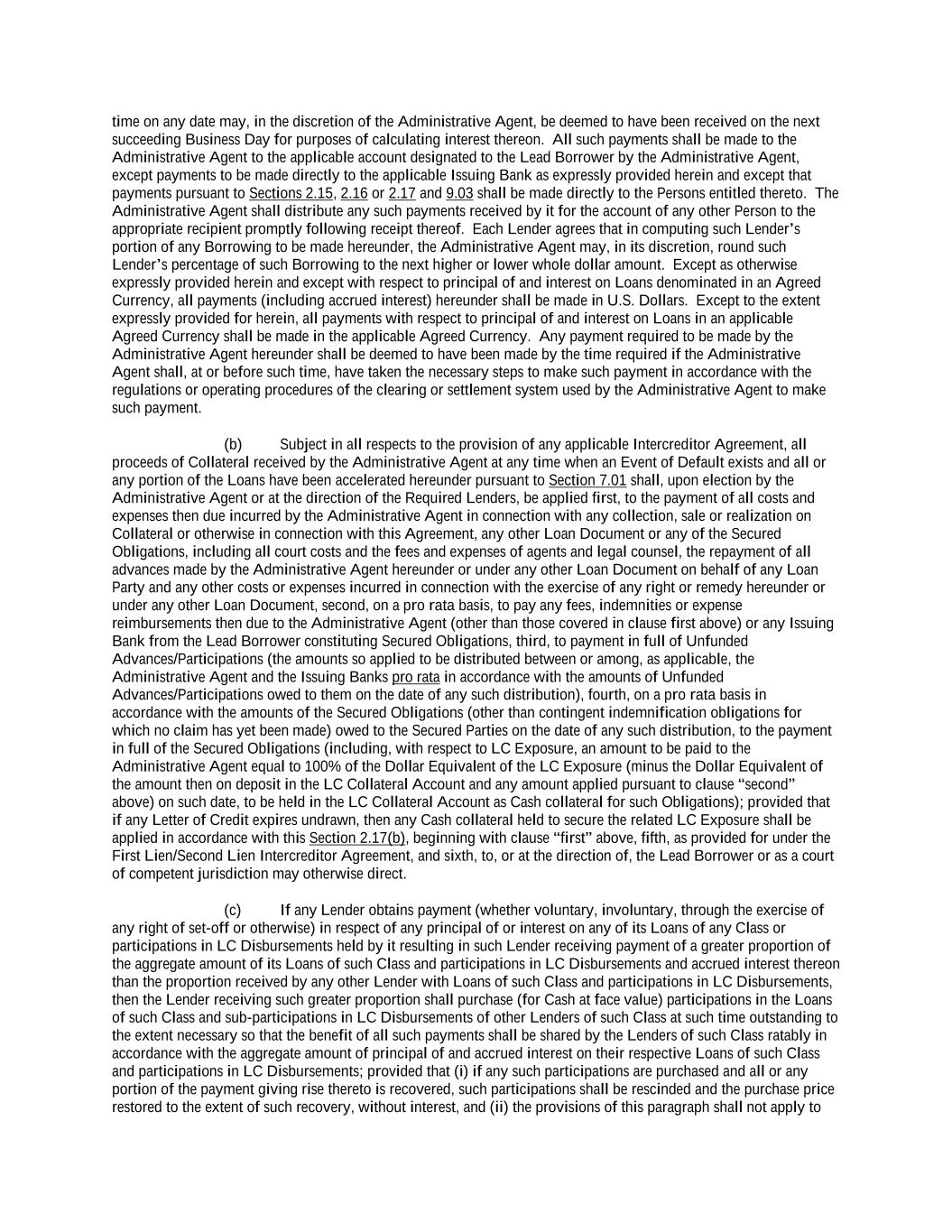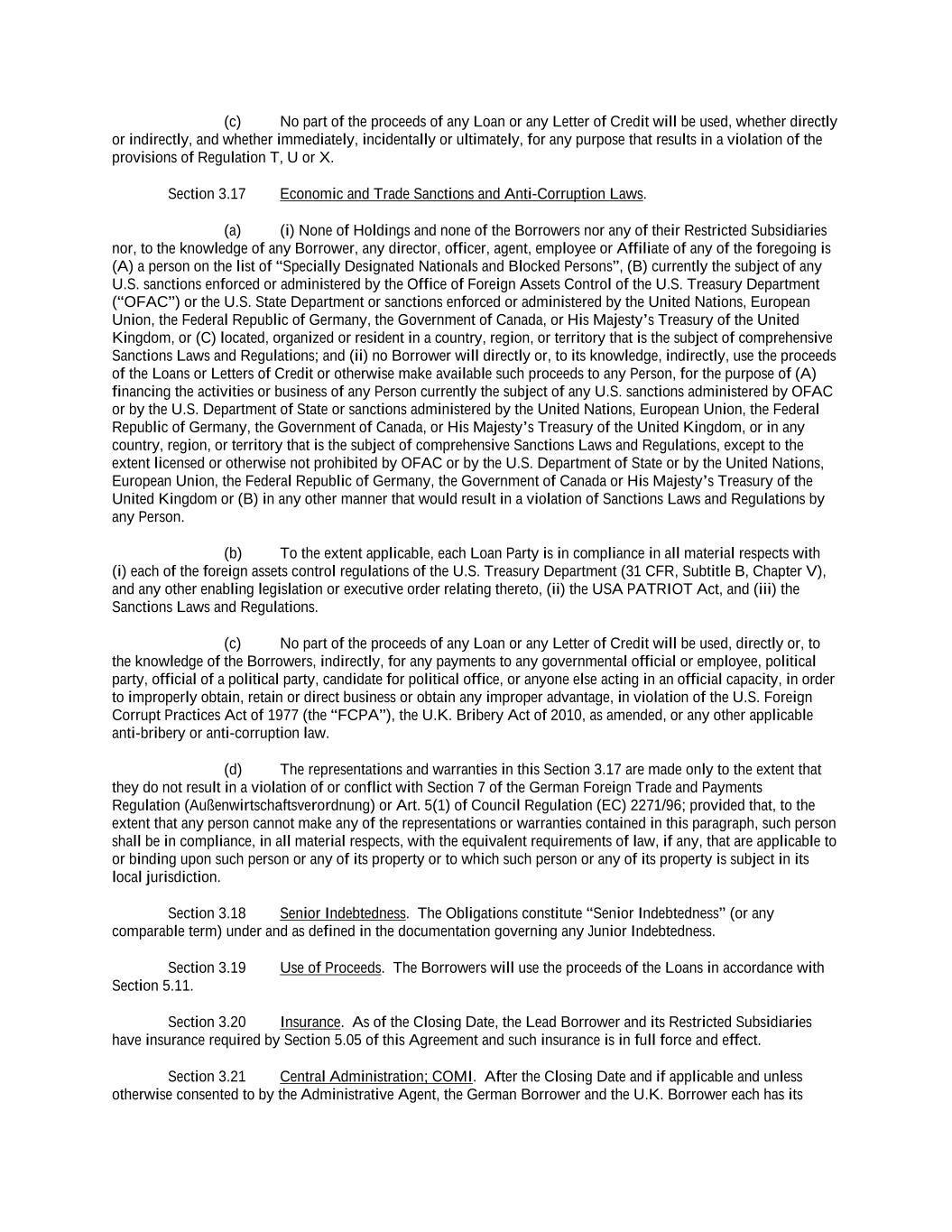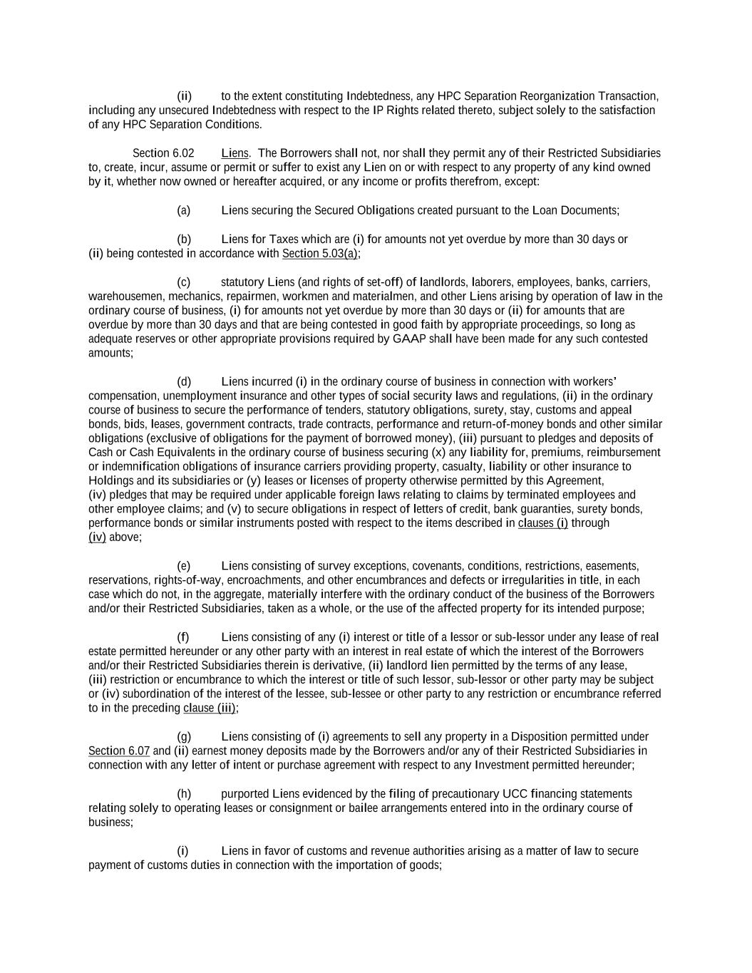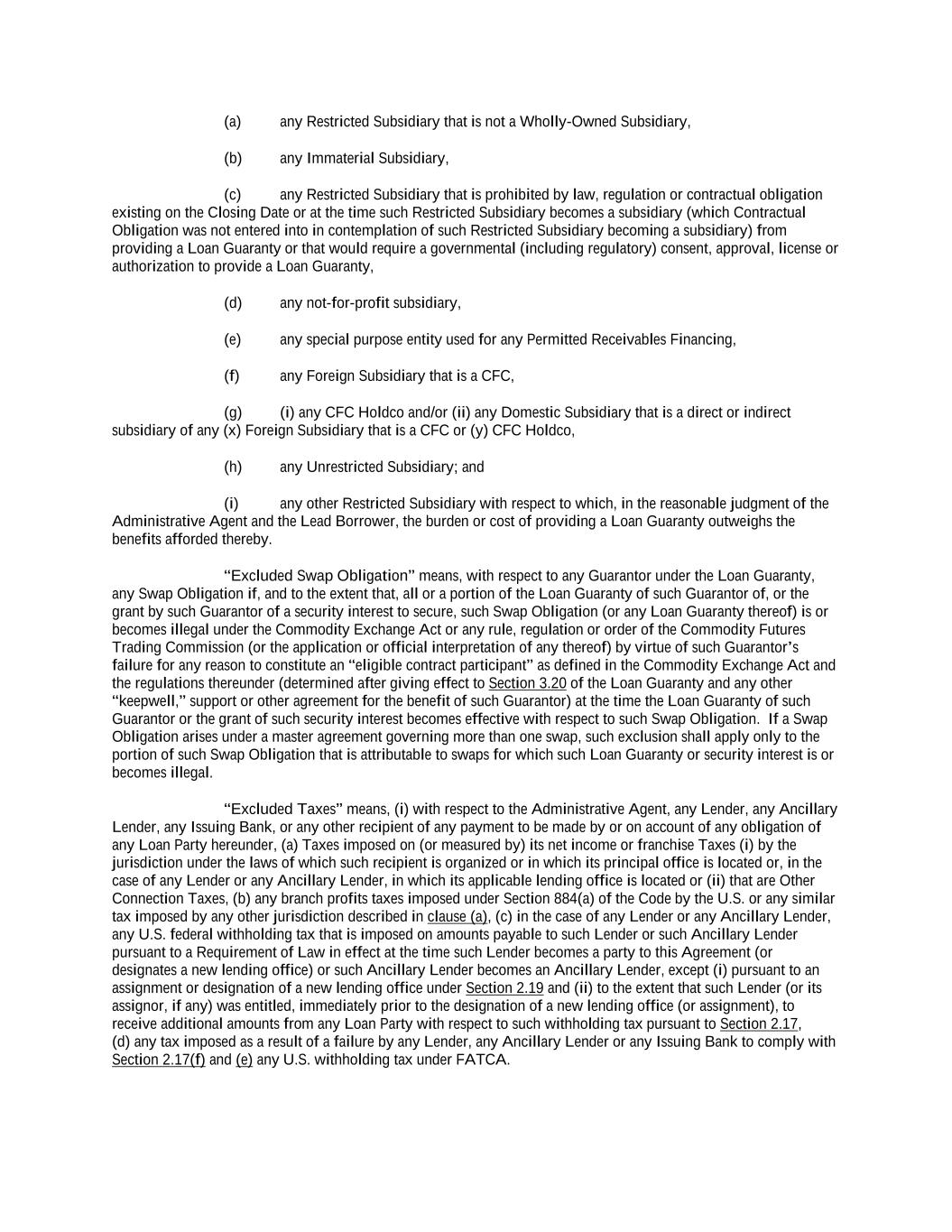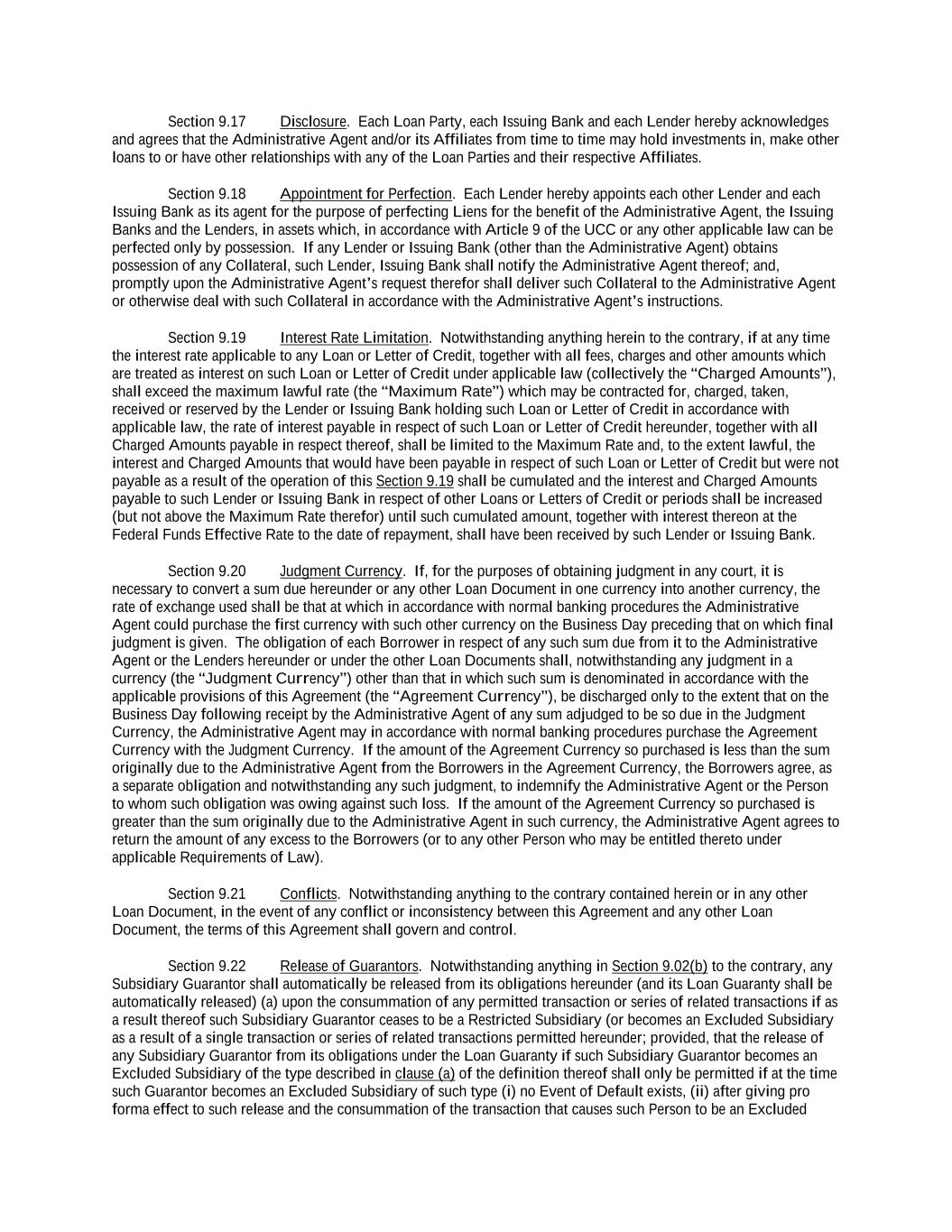 -ii- 61234327 #97236474v29 Section 2.17 Taxes. ............................................................................................................................................ 88 Section 2.18 Payments Generally; Allocation of Proceeds; Sharing of Payments. ............................................ 91 Section 2.19 Mitigation Obligations; Replacement of Lenders. ........................................................................ 93 Section 2.20 Illegality. ....................................................................................................................................... 94 Section 2.21 Defaulting Lenders ........................................................................................................................ 95 Section 2.22 Incremental Credit Extensions. ..................................................................................................... 97 Section 2.23 Extensions of Loans and Revolving Commitments. ................................................................... 102 Section 2.24 Lead Borrower as Borrower Representative ............................................................................... 104 Section 2.25 Currency Equivalents. ................................................................................................................. 104 Section 2.26 Ancillary Facilities. ..................................................................................................................... 105 Section 2.27 Benchmark Replacement. ........................................................................................................... 109 Section 2.28 Canadian Benchmark Replacement Setting. ............................................................................... 111 ARTICLE 3 REPRESENTATIONS AND WARRANTIES Section 3.01 Organization; Powers .................................................................................................................. 112 Section 3.02 Authorization; Enforceability...................................................................................................... 113 Section 3.03 Governmental Approvals; No Conflicts ...................................................................................... 113 Section 3.04 Financial Condition; No Material Adverse Effect. ..................................................................... 113 Section 3.05 Properties; Intellectual Property. ................................................................................................. 113 Section 3.06 Litigation and Environmental Matters. ....................................................................................... 114 Section 3.07 Compliance with Laws ................................................................................................................ 114 Section 3.08 Investment Company Status ........................................................................................................ 114 Section 3.09 Taxes ........................................................................................................................................... 114 Section 3.10 ERISA. ........................................................................................................................................ 114 Section 3.11 Disclosure. .................................................................................................................................. 114 Section 3.12 Solvency ...................................................................................................................................... 115 Section 3.13 Capitalization and Subsidiaries ................................................................................................... 115 Section 3.14 Security Interest in Collateral...................................................................................................... 115 Section 3.15 Labor Disputes ............................................................................................................................ 115 Section 3.16 Federal Reserve Regulations. ...................................................................................................... 115 Section 3.17 Economic and Trade Sanctions and Anti-Corruption Laws. ....................................................... 116 Section 3.18 Senior Indebtedness .................................................................................................................... 116 Section 3.19 Use of Proceeds ........................................................................................................................... 116 Section 3.20 Insurance ..................................................................................................................................... 116 Section 3.21 Central Administration; COMI ................................................................................................... 116