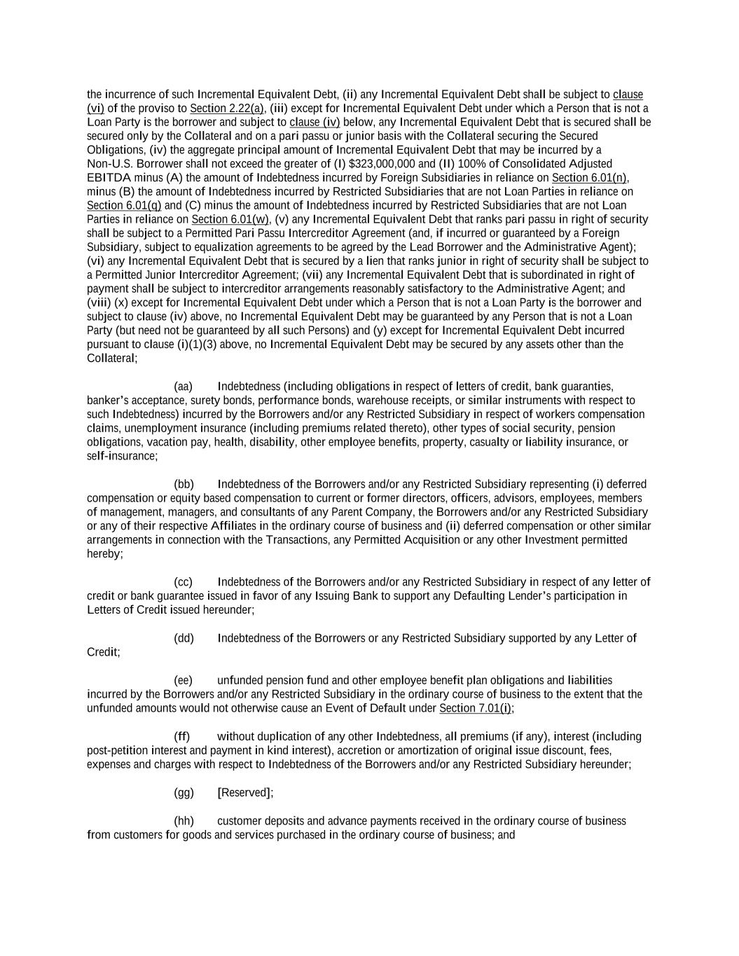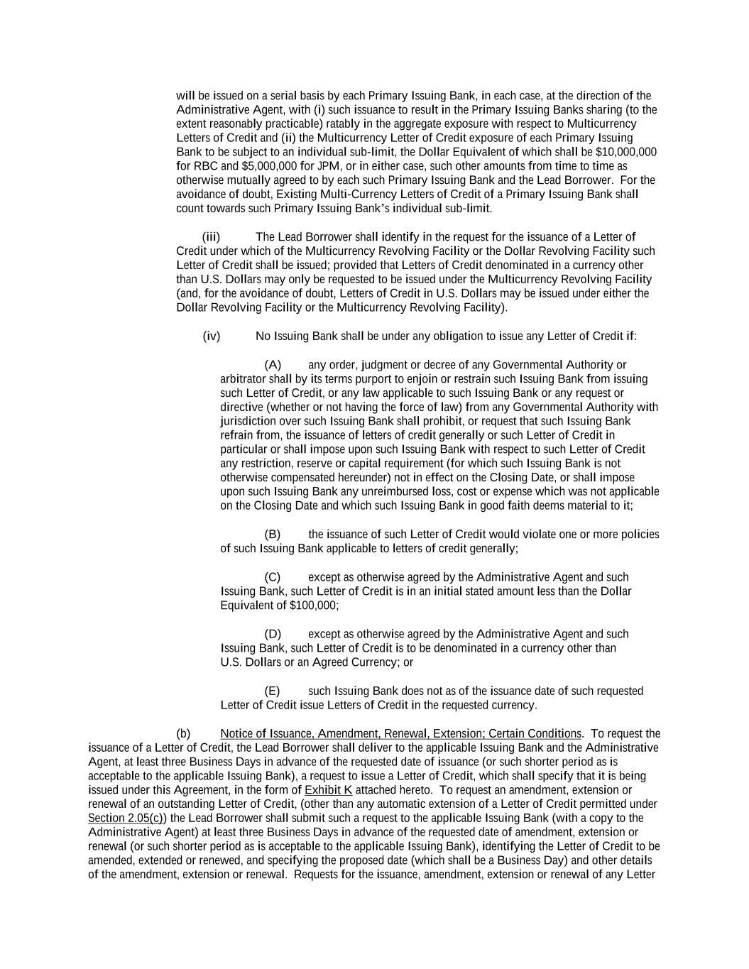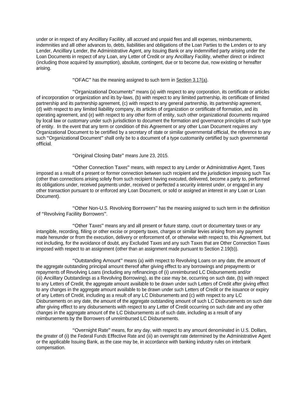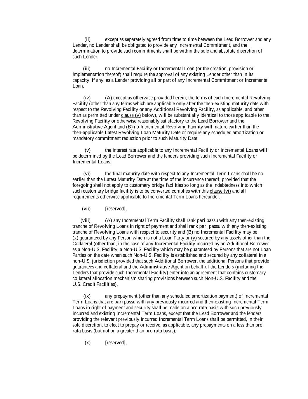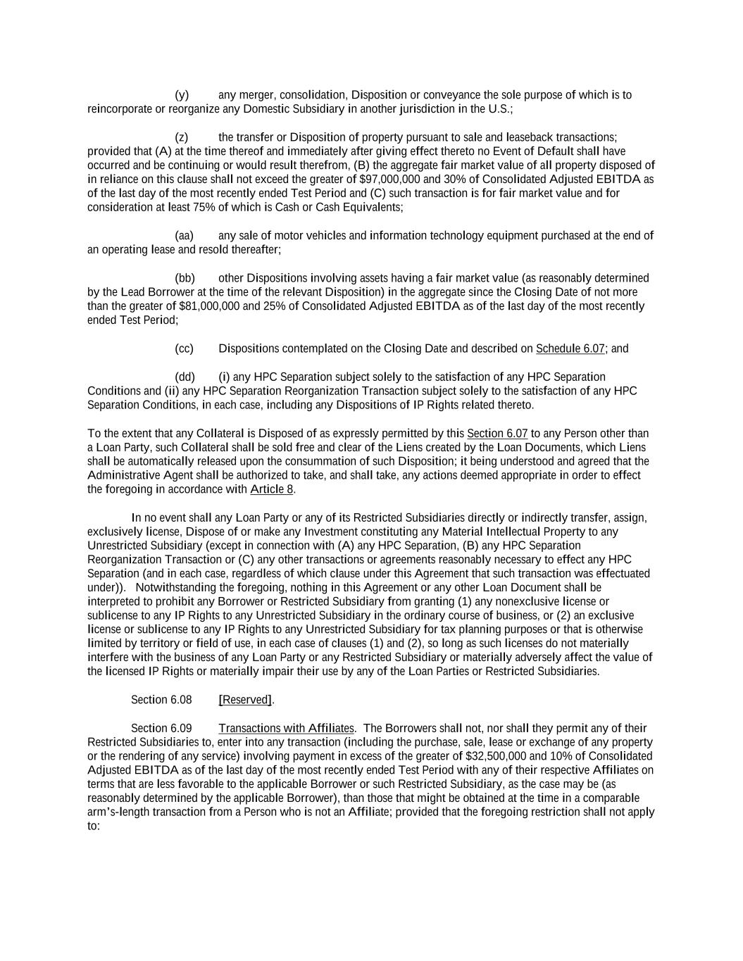 -ii- 61234327 #97236474v29 Section 2.17 Taxes. ............................................................................................................................................ 88 Section 2.18 Payments Generally; Allocation of Proceeds; Sharing of Payments. ............................................ 91 Section 2.19 Mitigation Obligations; Replacement of Lenders. ........................................................................ 93 Section 2.20 Illegality. ....................................................................................................................................... 94 Section 2.21 Defaulting Lenders ........................................................................................................................ 95 Section 2.22 Incremental Credit Extensions. ..................................................................................................... 97 Section 2.23 Extensions of Loans and Revolving Commitments. ................................................................... 102 Section 2.24 Lead Borrower as Borrower Representative ............................................................................... 104 Section 2.25 Currency Equivalents. ................................................................................................................. 104 Section 2.26 Ancillary Facilities. ..................................................................................................................... 105 Section 2.27 Benchmark Replacement. ........................................................................................................... 109 Section 2.28 Canadian Benchmark Replacement Setting. ............................................................................... 111 ARTICLE 3 REPRESENTATIONS AND WARRANTIES Section 3.01 Organization; Powers .................................................................................................................. 112 Section 3.02 Authorization; Enforceability...................................................................................................... 113 Section 3.03 Governmental Approvals; No Conflicts ...................................................................................... 113 Section 3.04 Financial Condition; No Material Adverse Effect. ..................................................................... 113 Section 3.05 Properties; Intellectual Property. ................................................................................................. 113 Section 3.06 Litigation and Environmental Matters. ....................................................................................... 114 Section 3.07 Compliance with Laws ................................................................................................................ 114 Section 3.08 Investment Company Status ........................................................................................................ 114 Section 3.09 Taxes ........................................................................................................................................... 114 Section 3.10 ERISA. ........................................................................................................................................ 114 Section 3.11 Disclosure. .................................................................................................................................. 114 Section 3.12 Solvency ...................................................................................................................................... 115 Section 3.13 Capitalization and Subsidiaries ................................................................................................... 115 Section 3.14 Security Interest in Collateral...................................................................................................... 115 Section 3.15 Labor Disputes ............................................................................................................................ 115 Section 3.16 Federal Reserve Regulations. ...................................................................................................... 115 Section 3.17 Economic and Trade Sanctions and Anti-Corruption Laws. ....................................................... 116 Section 3.18 Senior Indebtedness .................................................................................................................... 116 Section 3.19 Use of Proceeds ........................................................................................................................... 116 Section 3.20 Insurance ..................................................................................................................................... 116 Section 3.21 Central Administration; COMI ................................................................................................... 116