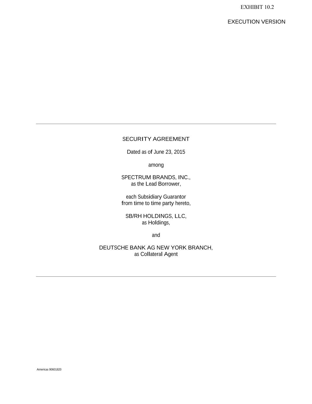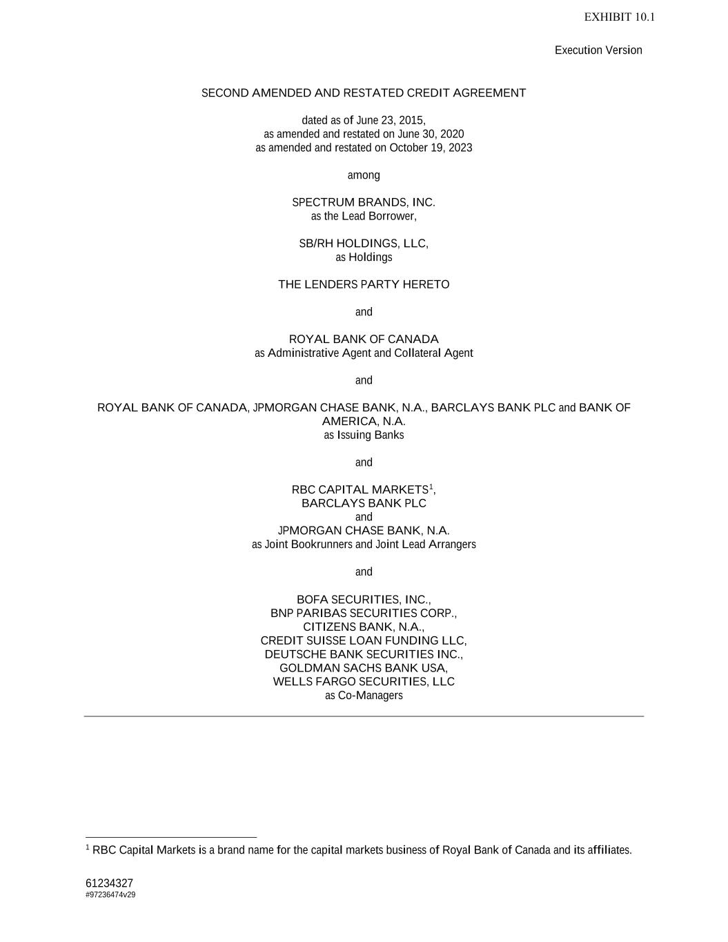 Execution Version 61234327 #97236474v29 SECOND AMENDED AND RESTATED CREDIT AGREEMENT dated as of June 23, 2015, as amended and restated on June 30, 2020 as amended and restated on October 19, 2023 among SPECTRUM BRANDS, INC. as the Lead Borrower, SB/RH HOLDINGS, LLC, as Holdings THE LENDERS PARTY HERETO and ROYAL BANK OF CANADA as Administrative Agent and Collateral Agent and ROYAL BANK OF CANADA, JPMORGAN CHASE BANK, N.A., BARCLAYS BANK PLC and BANK OF AMERICA, N.A. as Issuing Banks and RBC CAPITAL MARKETS1, BARCLAYS BANK PLC and JPMORGAN CHASE BANK, N.A. as Joint Bookrunners and Joint Lead Arrangers and BOFA SECURITIES, INC., BNP PARIBAS SECURITIES CORP., CITIZENS BANK, N.A., CREDIT SUISSE LOAN FUNDING LLC, DEUTSCHE BANK SECURITIES INC., GOLDMAN SACHS BANK USA, WELLS FARGO SECURITIES, LLC as Co-Managers 1 RBC Capital Markets is a brand name for the capital markets business of Royal Bank of Canada and its affiliates. EXHIBIT 10.1