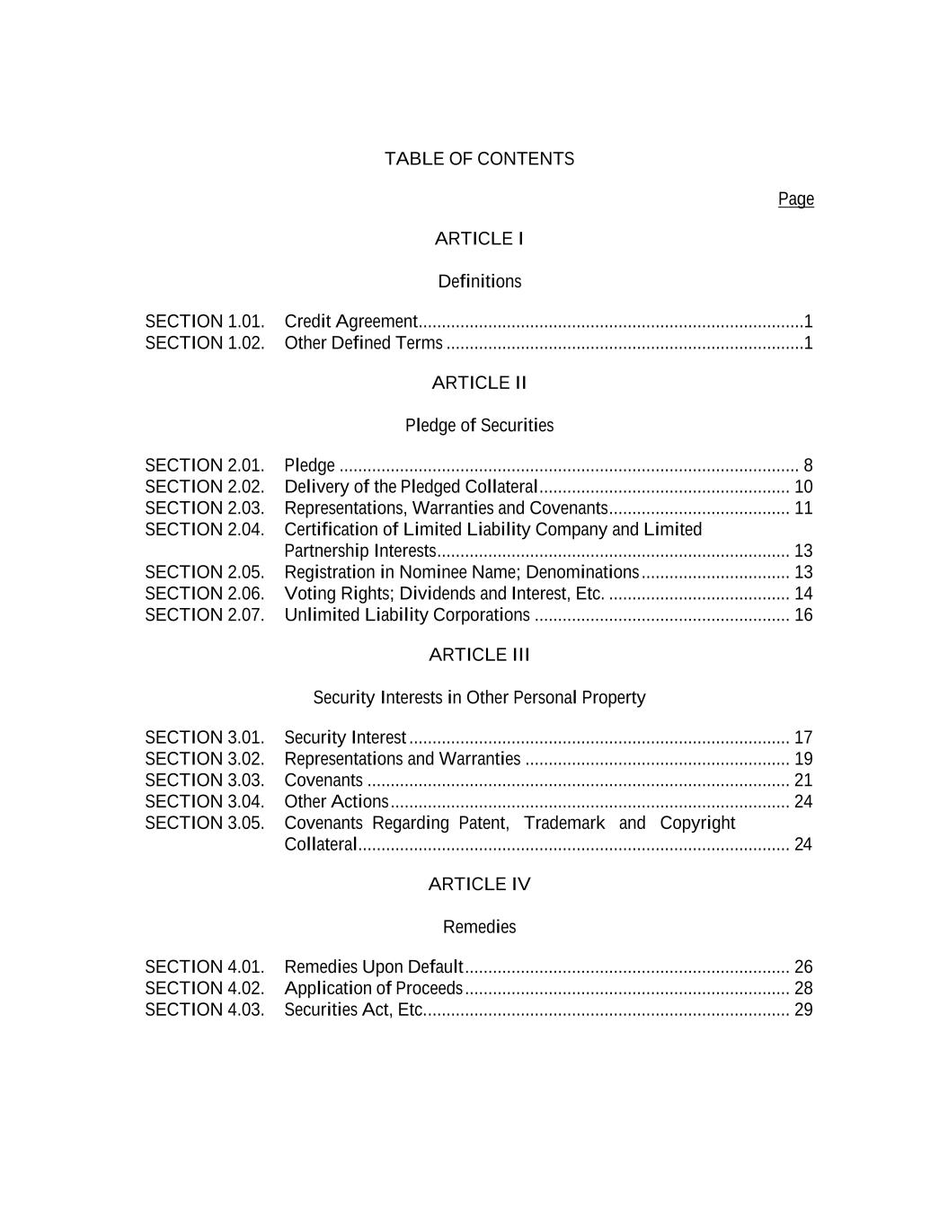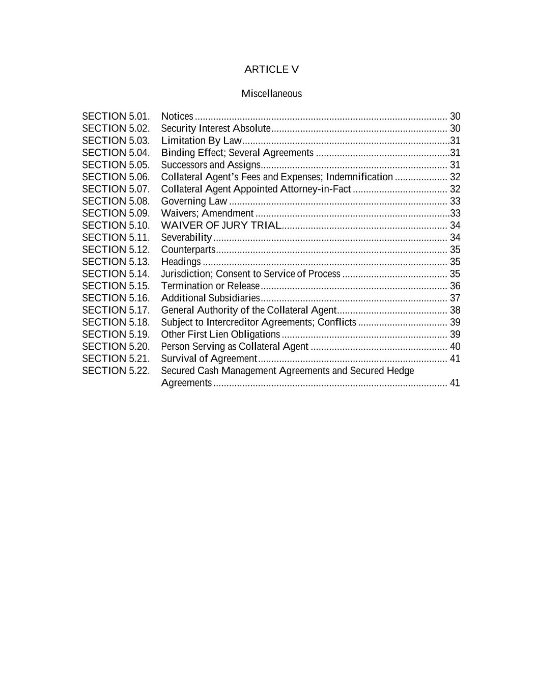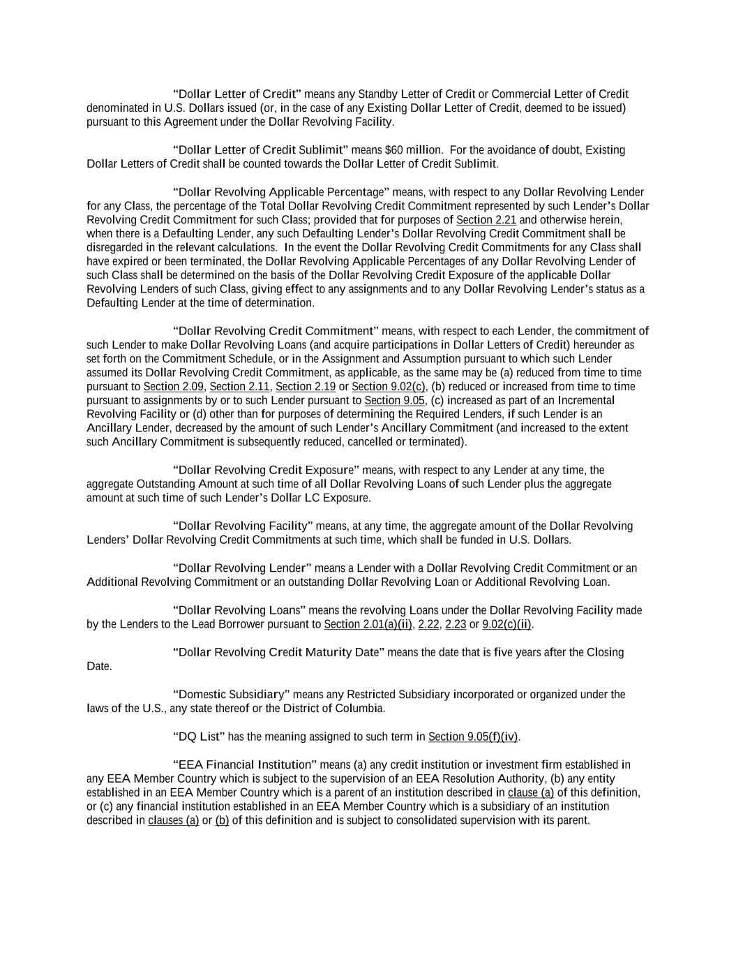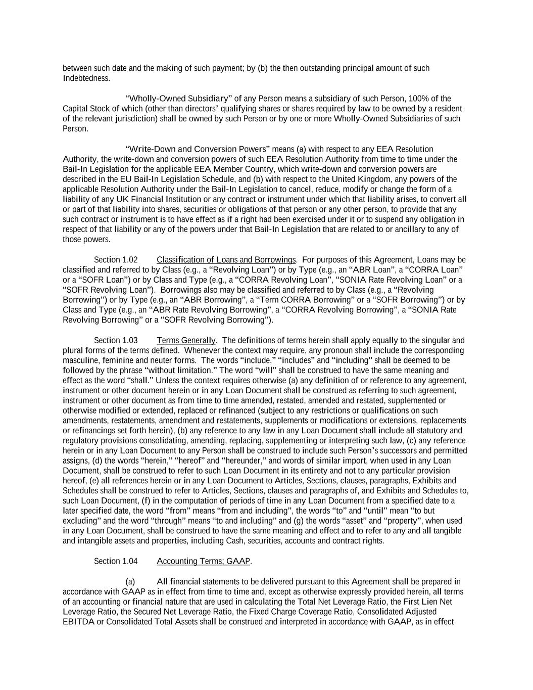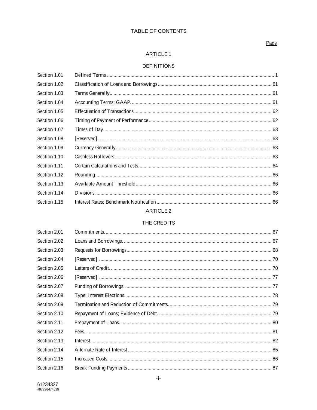 TABLE OF CONTENTS Page -i- 61234327 #97236474v29 ARTICLE 1 DEFINITIONS Section 1.01 Defined Terms ................................................................................................................................ 1 Section 1.02 Classification of Loans and Borrowings ....................................................................................... 61 Section 1.03 Terms Generally ............................................................................................................................ 61 Section 1.04 Accounting Terms; GAAP. ........................................................................................................... 61 Section 1.05 Effectuation of Transactions ......................................................................................................... 62 Section 1.06 Timing of Payment of Performance .............................................................................................. 62 Section 1.07 Times of Day ................................................................................................................................. 63 Section 1.08 [Reserved]. .................................................................................................................................... 63 Section 1.09 Currency Generally. ...................................................................................................................... 63 Section 1.10 Cashless Rollovers ........................................................................................................................ 63 Section 1.11 Certain Calculations and Tests. ..................................................................................................... 64 Section 1.12 Rounding ....................................................................................................................................... 66 Section 1.13 Available Amount Threshold ........................................................................................................ 66 Section 1.14 Divisions ....................................................................................................................................... 66 Section 1.15 Interest Rates; Benchmark Notification ........................................................................................ 66 ARTICLE 2 THE CREDITS Section 2.01 Commitments. ............................................................................................................................... 67 Section 2.02 Loans and Borrowings. ................................................................................................................. 67 Section 2.03 Requests for Borrowings ............................................................................................................... 68 Section 2.04 [Reserved]. .................................................................................................................................... 70 Section 2.05 Letters of Credit. ........................................................................................................................... 70 Section 2.06 [Reserved]. .................................................................................................................................... 77 Section 2.07 Funding of Borrowings. ................................................................................................................ 77 Section 2.08 Type; Interest Elections. ............................................................................................................... 78 Section 2.09 Termination and Reduction of Commitments. .............................................................................. 79 Section 2.10 Repayment of Loans; Evidence of Debt. ...................................................................................... 79 Section 2.11 Prepayment of Loans. ................................................................................................................... 80 Section 2.12 Fees. .............................................................................................................................................. 81 Section 2.13 Interest. ......................................................................................................................................... 82 Section 2.14 Alternate Rate of Interest .............................................................................................................. 85 Section 2.15 Increased Costs. ............................................................................................................................ 86 Section 2.16 Break Funding Payments .............................................................................................................. 87