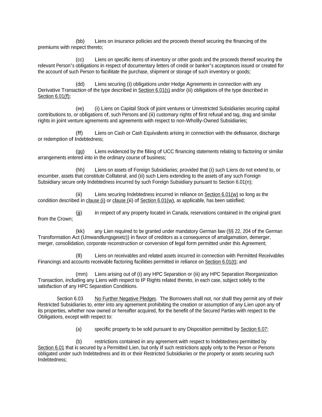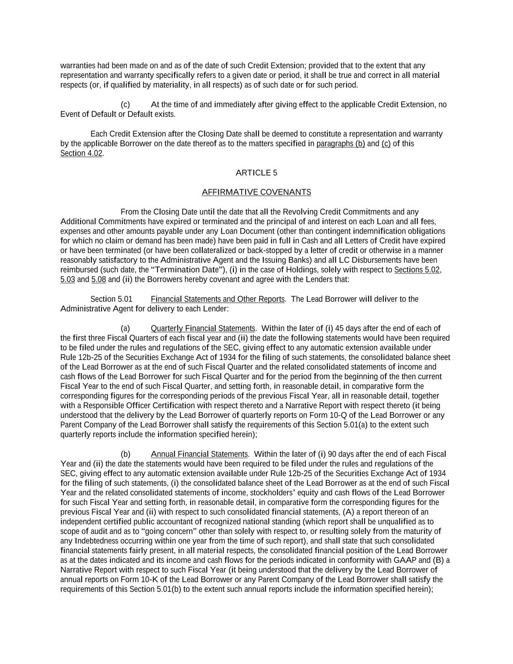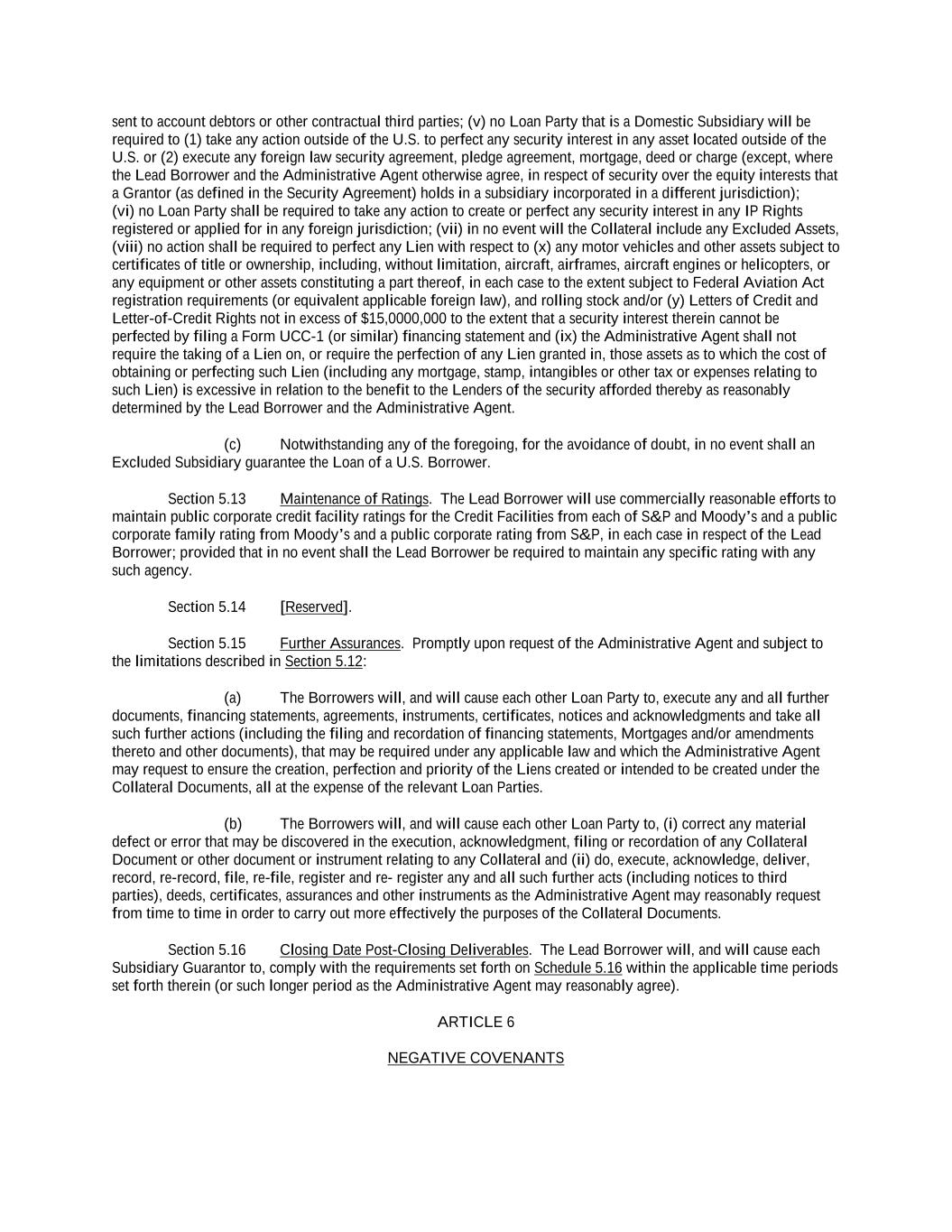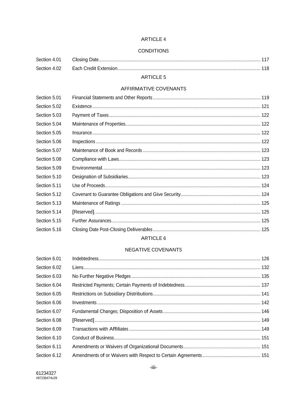 -iii- 61234327 #97236474v29 ARTICLE 4 CONDITIONS Section 4.01 Closing Date ................................................................................................................................ 117 Section 4.02 Each Credit Extension ................................................................................................................. 118 ARTICLE 5 AFFIRMATIVE COVENANTS Section 5.01 Financial Statements and Other Reports ..................................................................................... 119 Section 5.02 Existence ..................................................................................................................................... 121 Section 5.03 Payment of Taxes ........................................................................................................................ 122 Section 5.04 Maintenance of Properties........................................................................................................... 122 Section 5.05 Insurance ..................................................................................................................................... 122 Section 5.06 Inspections .................................................................................................................................. 122 Section 5.07 Maintenance of Book and Records ............................................................................................. 123 Section 5.08 Compliance with Laws ................................................................................................................ 123 Section 5.09 Environmental. ............................................................................................................................ 123 Section 5.10 Designation of Subsidiaries......................................................................................................... 123 Section 5.11 Use of Proceeds ........................................................................................................................... 124 Section 5.12 Covenant to Guarantee Obligations and Give Security. .............................................................. 124 Section 5.13 Maintenance of Ratings .............................................................................................................. 125 Section 5.14 [Reserved]. .................................................................................................................................. 125 Section 5.15 Further Assurances ...................................................................................................................... 125 Section 5.16 Closing Date Post-Closing Deliverables ..................................................................................... 125 ARTICLE 6 NEGATIVE COVENANTS Section 6.01 Indebtedness ................................................................................................................................ 126 Section 6.02 Liens ............................................................................................................................................ 132 Section 6.03 No Further Negative Pledges ...................................................................................................... 135 Section 6.04 Restricted Payments; Certain Payments of Indebtedness. ........................................................... 137 Section 6.05 Restrictions on Subsidiary Distributions ..................................................................................... 141 Section 6.06 Investments ................................................................................................................................. 142 Section 6.07 Fundamental Changes; Disposition of Assets ............................................................................. 146 Section 6.08 [Reserved] ................................................................................................................................... 149 Section 6.09 Transactions with Affiliates ........................................................................................................ 149 Section 6.10 Conduct of Business.................................................................................................................... 151 Section 6.11 Amendments or Waivers of Organizational Documents ............................................................. 151 Section 6.12 Amendments of or Waivers with Respect to Certain Agreements .............................................. 151