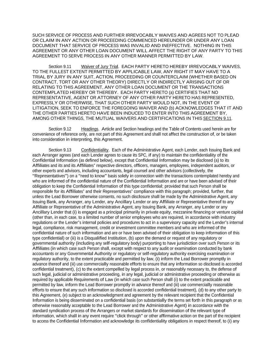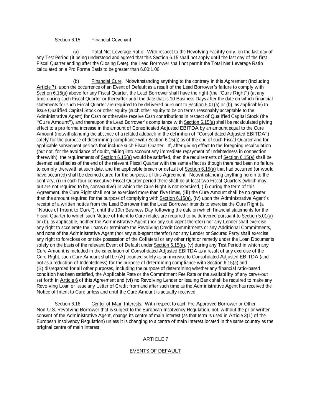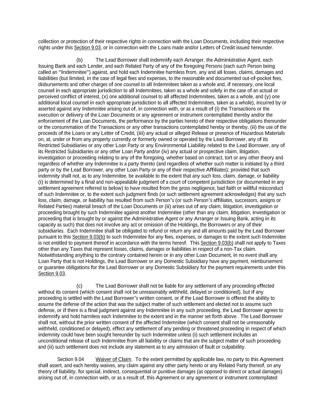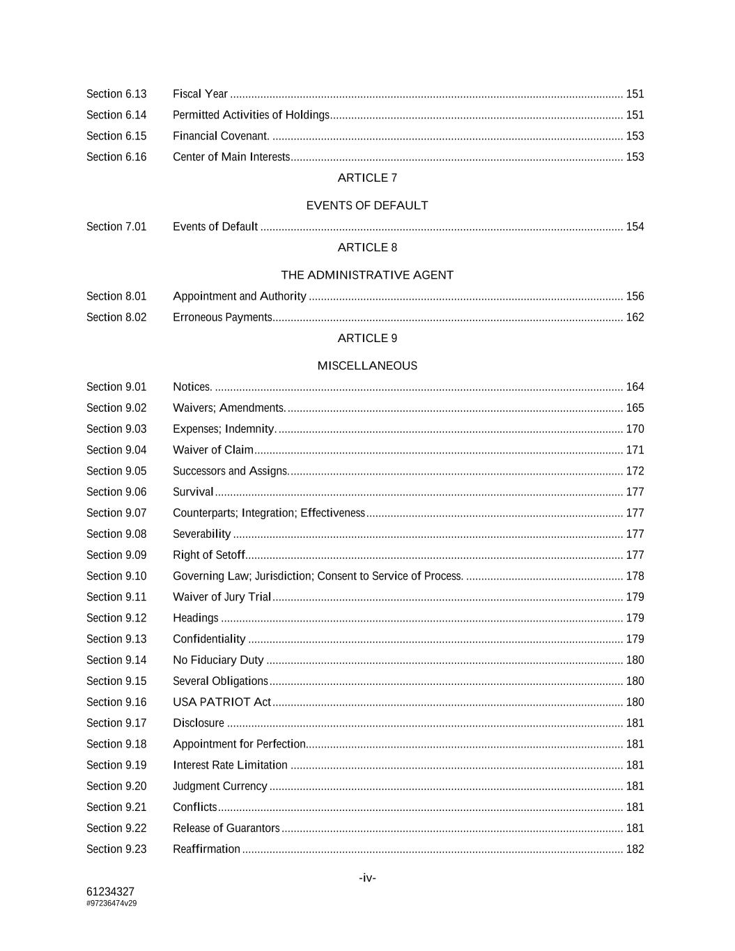 -iv- 61234327 #97236474v29 Section 6.13 Fiscal Year .................................................................................................................................. 151 Section 6.14 Permitted Activities of Holdings ................................................................................................. 151 Section 6.15 Financial Covenant. .................................................................................................................... 153 Section 6.16 Center of Main Interests .............................................................................................................. 153 ARTICLE 7 EVENTS OF DEFAULT Section 7.01 Events of Default ........................................................................................................................ 154 ARTICLE 8 THE ADMINISTRATIVE AGENT Section 8.01 Appointment and Authority ........................................................................................................ 156 Section 8.02 Erroneous Payments .................................................................................................................... 162 ARTICLE 9 MISCELLANEOUS Section 9.01 Notices. ....................................................................................................................................... 164 Section 9.02 Waivers; Amendments. ............................................................................................................... 165 Section 9.03 Expenses; Indemnity. .................................................................................................................. 170 Section 9.04 Waiver of Claim .......................................................................................................................... 171 Section 9.05 Successors and Assigns. .............................................................................................................. 172 Section 9.06 Survival ....................................................................................................................................... 177 Section 9.07 Counterparts; Integration; Effectiveness ..................................................................................... 177 Section 9.08 Severability ................................................................................................................................. 177 Section 9.09 Right of Setoff ............................................................................................................................. 177 Section 9.10 Governing Law; Jurisdiction; Consent to Service of Process. .................................................... 178 Section 9.11 Waiver of Jury Trial .................................................................................................................... 179 Section 9.12 Headings ..................................................................................................................................... 179 Section 9.13 Confidentiality ............................................................................................................................ 179 Section 9.14 No Fiduciary Duty ...................................................................................................................... 180 Section 9.15 Several Obligations ..................................................................................................................... 180 Section 9.16 USA PATRIOT Act .................................................................................................................... 180 Section 9.17 Disclosure ................................................................................................................................... 181 Section 9.18 Appointment for Perfection......................................................................................................... 181 Section 9.19 Interest Rate Limitation .............................................................................................................. 181 Section 9.20 Judgment Currency ..................................................................................................................... 181 Section 9.21 Conflicts ...................................................................................................................................... 181 Section 9.22 Release of Guarantors ................................................................................................................. 181 Section 9.23 Reaffirmation .............................................................................................................................. 182
