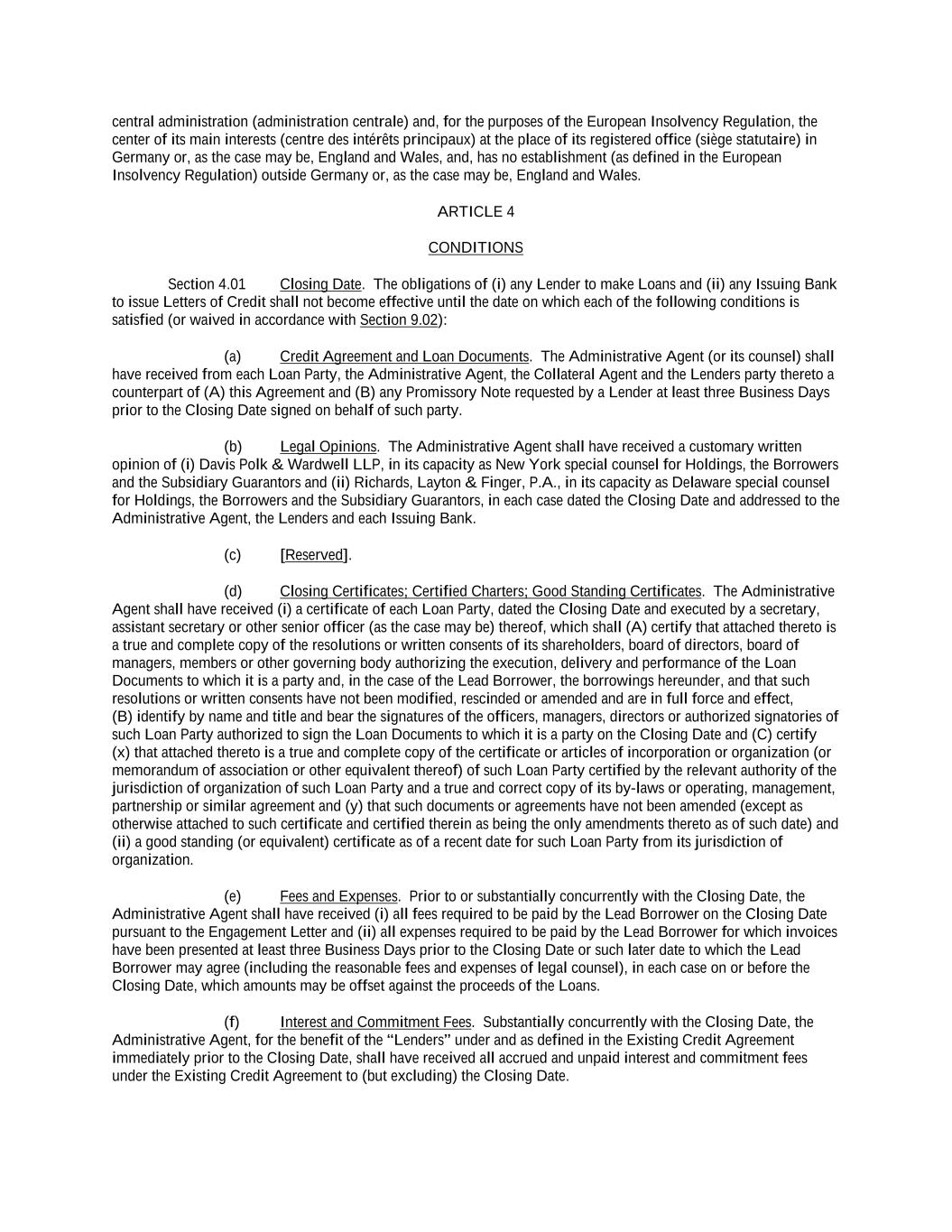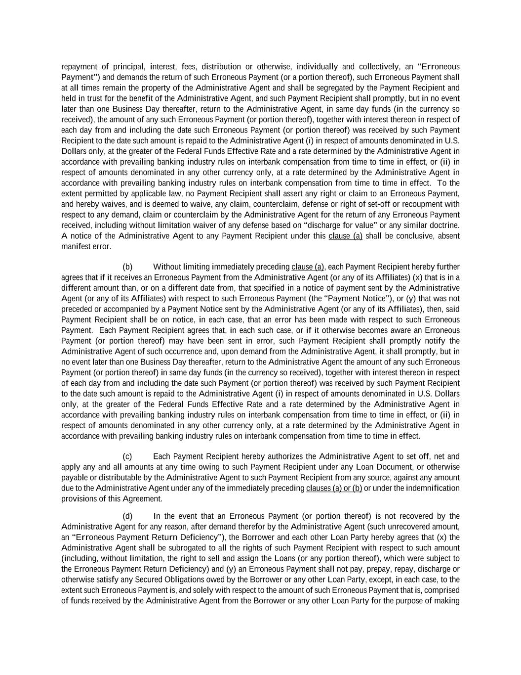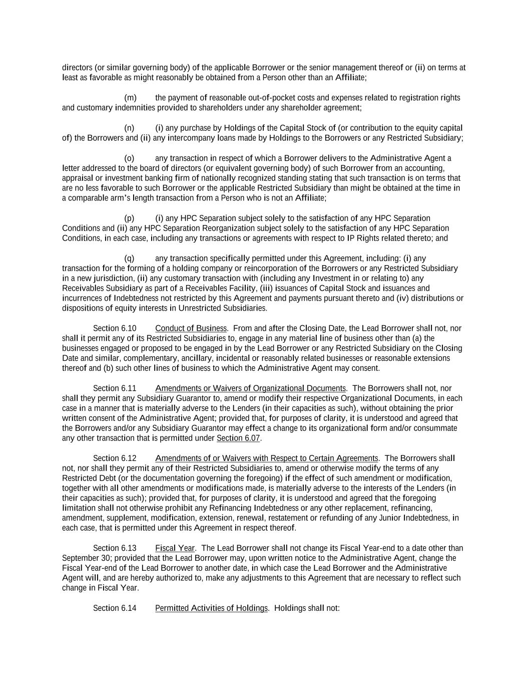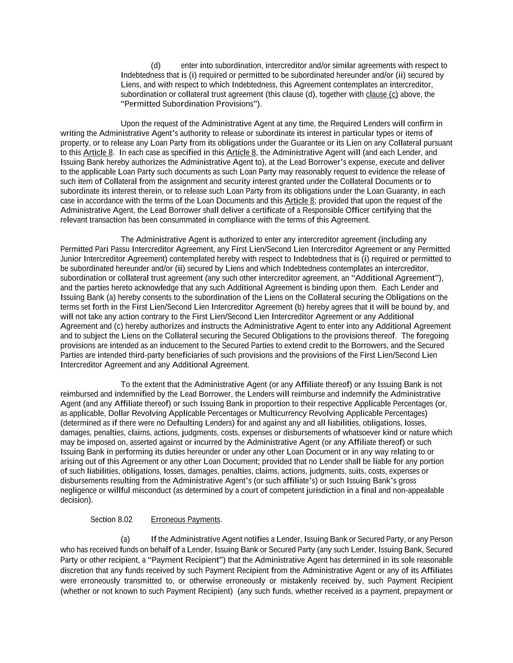 -iv- 61234327 #97236474v29 Section 6.13 Fiscal Year .................................................................................................................................. 151 Section 6.14 Permitted Activities of Holdings ................................................................................................. 151 Section 6.15 Financial Covenant. .................................................................................................................... 153 Section 6.16 Center of Main Interests .............................................................................................................. 153 ARTICLE 7 EVENTS OF DEFAULT Section 7.01 Events of Default ........................................................................................................................ 154 ARTICLE 8 THE ADMINISTRATIVE AGENT Section 8.01 Appointment and Authority ........................................................................................................ 156 Section 8.02 Erroneous Payments .................................................................................................................... 162 ARTICLE 9 MISCELLANEOUS Section 9.01 Notices. ....................................................................................................................................... 164 Section 9.02 Waivers; Amendments. ............................................................................................................... 165 Section 9.03 Expenses; Indemnity. .................................................................................................................. 170 Section 9.04 Waiver of Claim .......................................................................................................................... 171 Section 9.05 Successors and Assigns. .............................................................................................................. 172 Section 9.06 Survival ....................................................................................................................................... 177 Section 9.07 Counterparts; Integration; Effectiveness ..................................................................................... 177 Section 9.08 Severability ................................................................................................................................. 177 Section 9.09 Right of Setoff ............................................................................................................................. 177 Section 9.10 Governing Law; Jurisdiction; Consent to Service of Process. .................................................... 178 Section 9.11 Waiver of Jury Trial .................................................................................................................... 179 Section 9.12 Headings ..................................................................................................................................... 179 Section 9.13 Confidentiality ............................................................................................................................ 179 Section 9.14 No Fiduciary Duty ...................................................................................................................... 180 Section 9.15 Several Obligations ..................................................................................................................... 180 Section 9.16 USA PATRIOT Act .................................................................................................................... 180 Section 9.17 Disclosure ................................................................................................................................... 181 Section 9.18 Appointment for Perfection......................................................................................................... 181 Section 9.19 Interest Rate Limitation .............................................................................................................. 181 Section 9.20 Judgment Currency ..................................................................................................................... 181 Section 9.21 Conflicts ...................................................................................................................................... 181 Section 9.22 Release of Guarantors ................................................................................................................. 181 Section 9.23 Reaffirmation .............................................................................................................................. 182