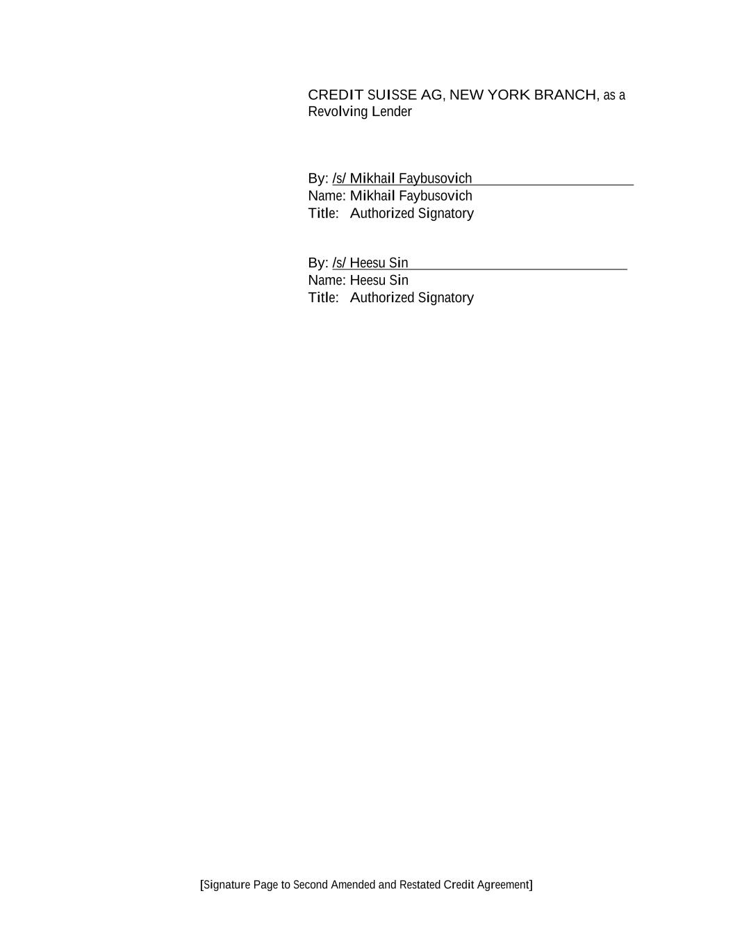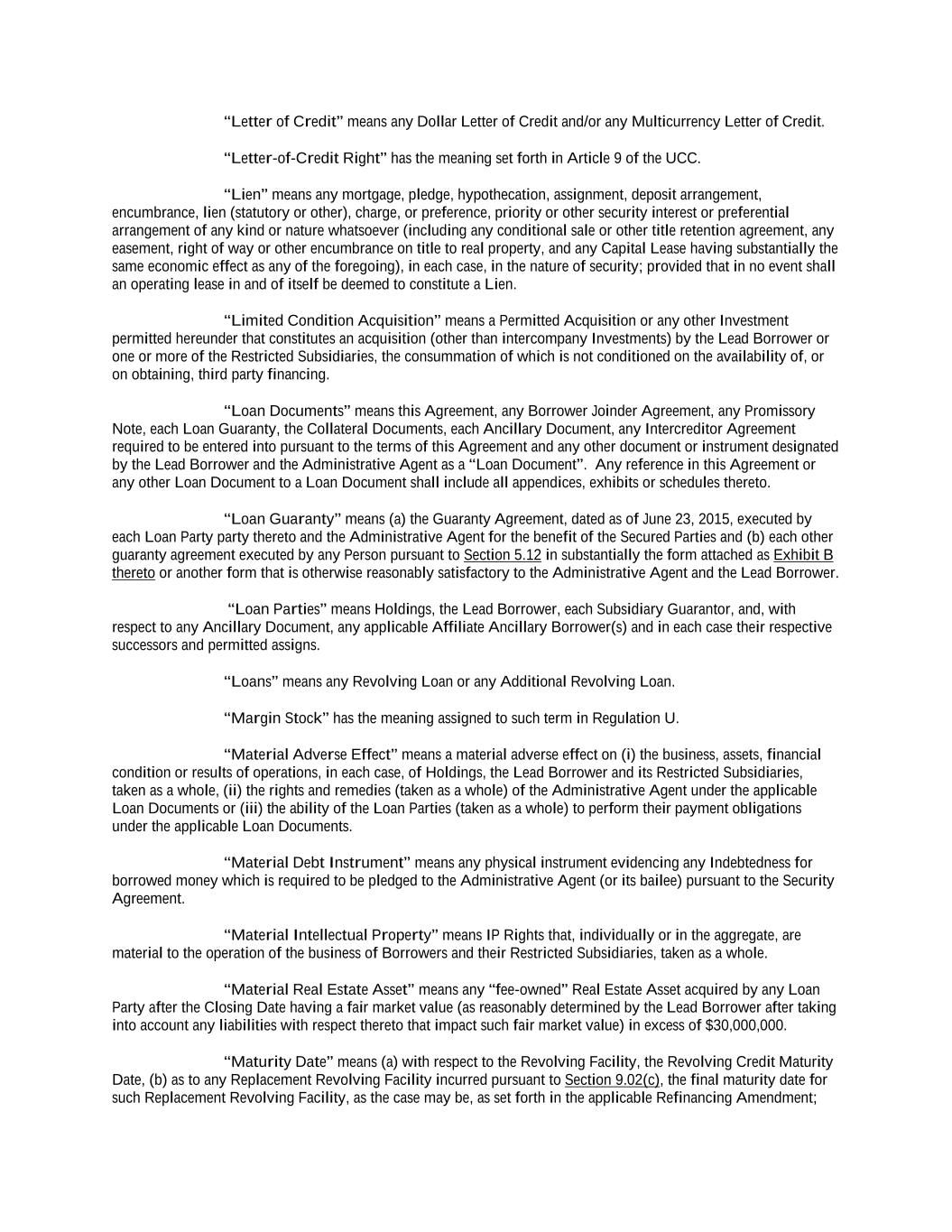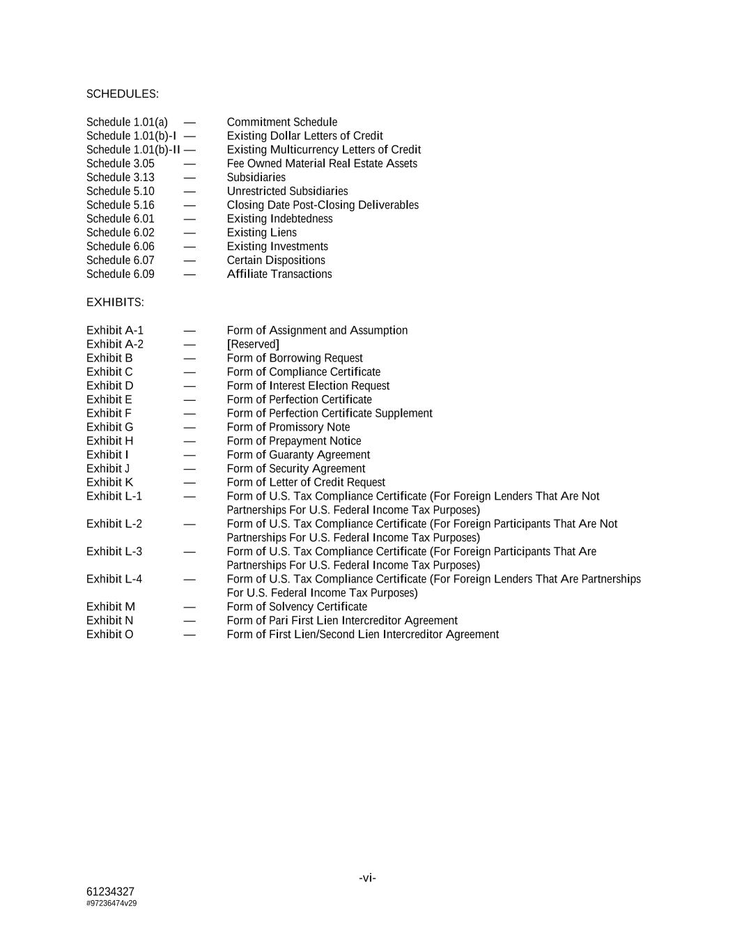 -vi- 61234327 #97236474v29 SCHEDULES: Schedule 1.01(a) — Commitment Schedule Schedule 1.01(b)-I — Existing Dollar Letters of Credit Schedule 1.01(b)-II — Existing Multicurrency Letters of Credit Schedule 3.05 — Fee Owned Material Real Estate Assets Schedule 3.13 — Subsidiaries Schedule 5.10 — Unrestricted Subsidiaries Schedule 5.16 — Closing Date Post-Closing Deliverables Schedule 6.01 — Existing Indebtedness Schedule 6.02 — Existing Liens Schedule 6.06 — Existing Investments Schedule 6.07 — Certain Dispositions Schedule 6.09 — Affiliate Transactions EXHIBITS: Exhibit A-1 — Form of Assignment and Assumption Exhibit A-2 — [Reserved] Exhibit B — Form of Borrowing Request Exhibit C — Form of Compliance Certificate Exhibit D — Form of Interest Election Request Exhibit E — Form of Perfection Certificate Exhibit F — Form of Perfection Certificate Supplement Exhibit G — Form of Promissory Note Exhibit H — Form of Prepayment Notice Exhibit I — Form of Guaranty Agreement Exhibit J — Form of Security Agreement Exhibit K — Form of Letter of Credit Request Exhibit L-1 — Form of U.S. Tax Compliance Certificate (For Foreign Lenders That Are Not Partnerships For U.S. Federal Income Tax Purposes) Exhibit L-2 — Form of U.S. Tax Compliance Certificate (For Foreign Participants That Are Not Partnerships For U.S. Federal Income Tax Purposes) Exhibit L-3 — Form of U.S. Tax Compliance Certificate (For Foreign Participants That Are Partnerships For U.S. Federal Income Tax Purposes) Exhibit L-4 — Form of U.S. Tax Compliance Certificate (For Foreign Lenders That Are Partnerships For U.S. Federal Income Tax Purposes) Exhibit M — Form of Solvency Certificate Exhibit N — Form of Pari First Lien Intercreditor Agreement Exhibit O — Form of First Lien/Second Lien Intercreditor Agreement