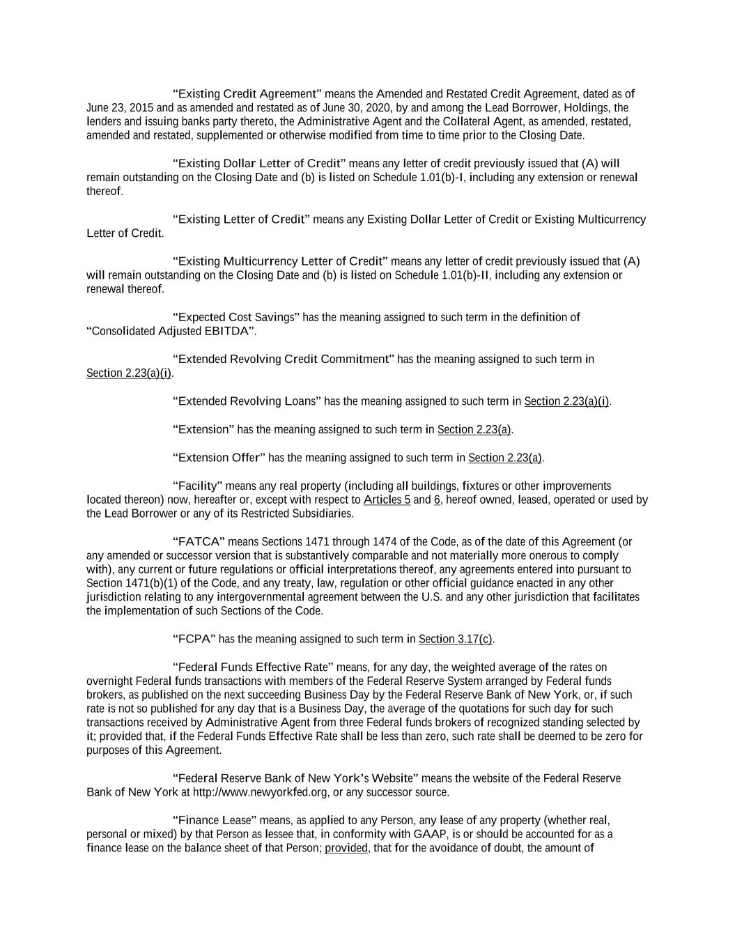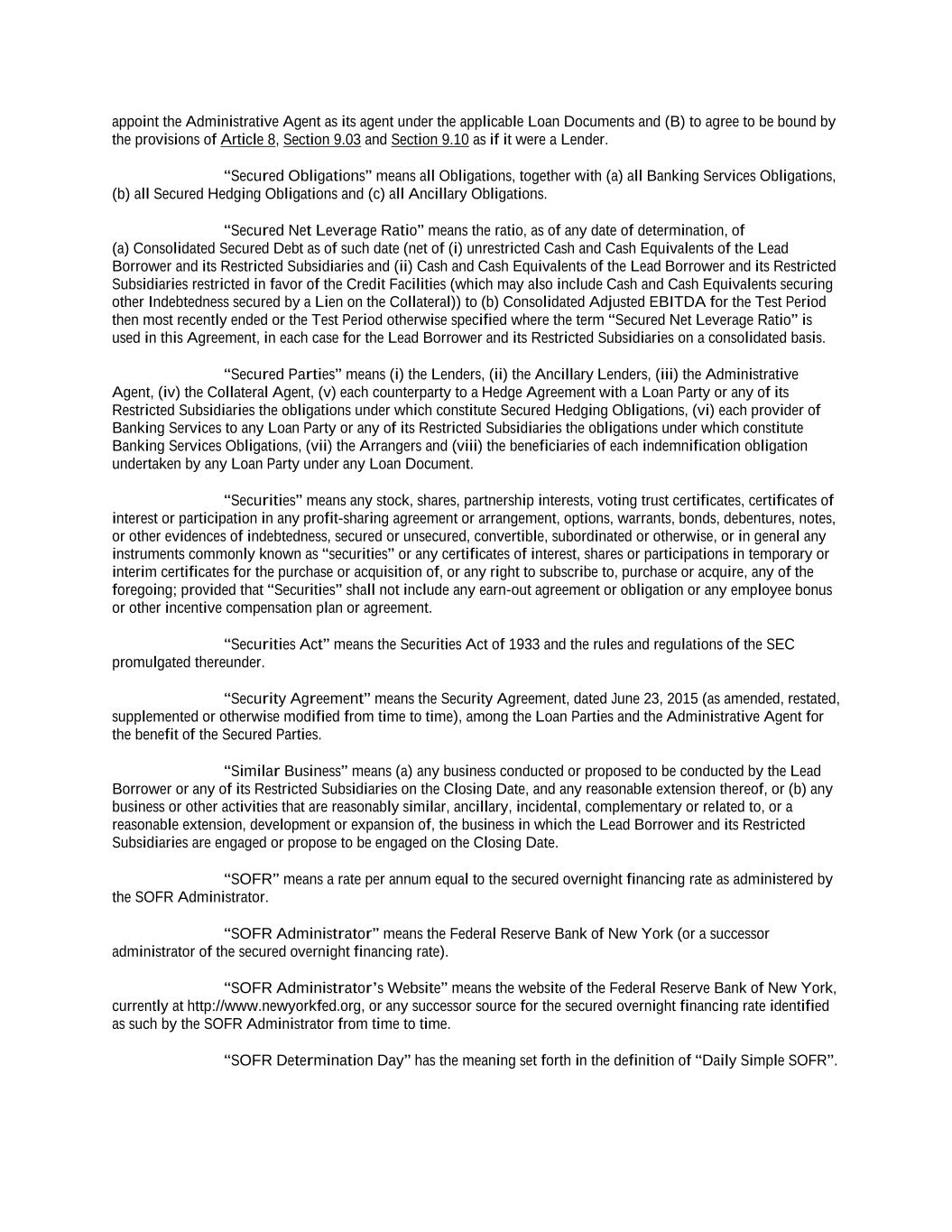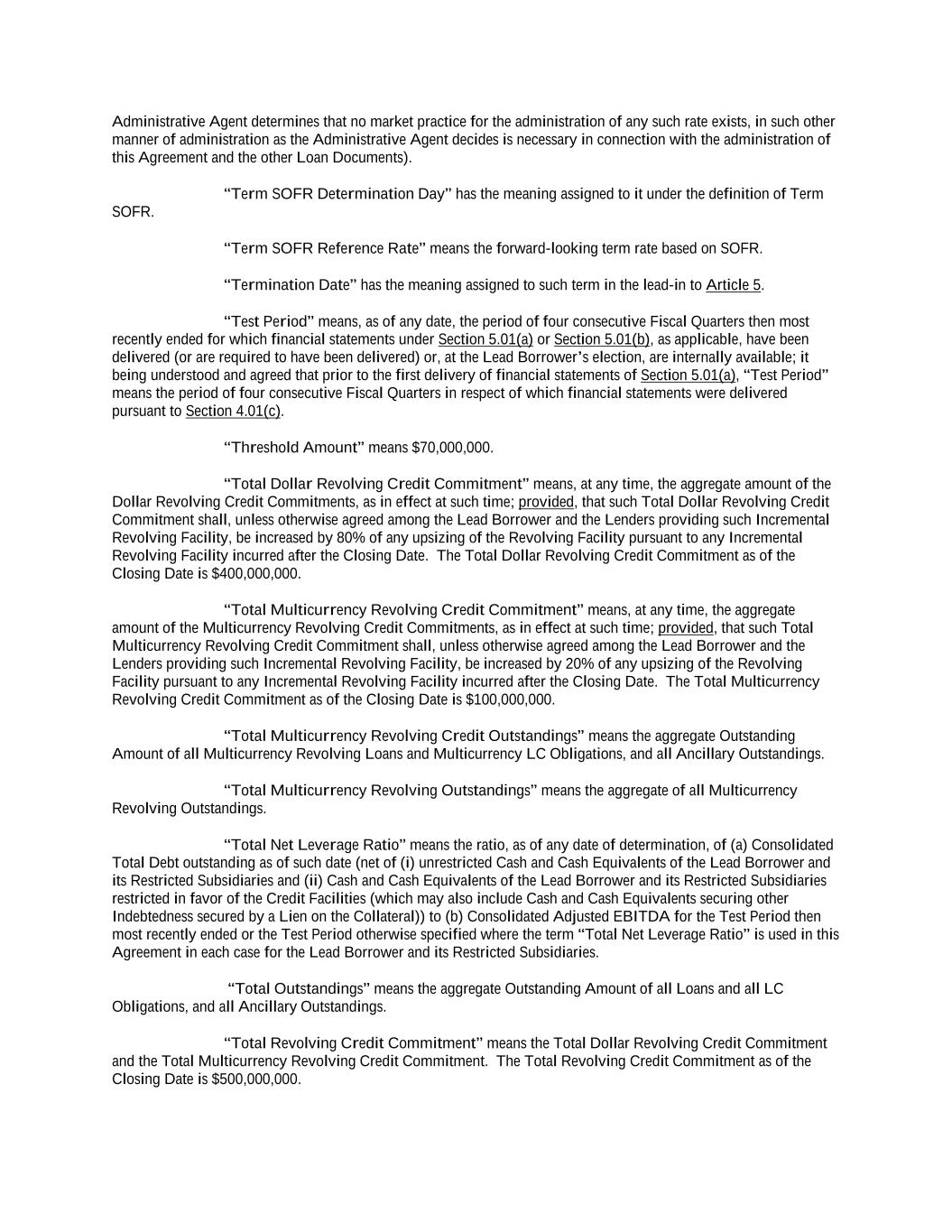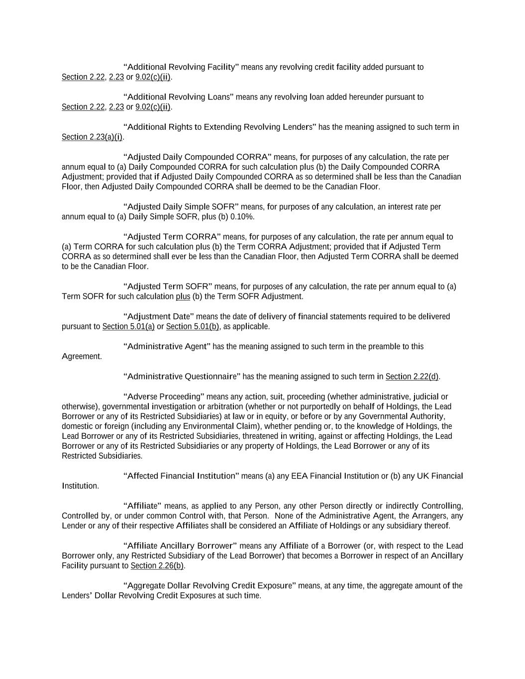 “Additional Revolving Facility” means any revolving credit facility added pursuant to Section 2.22, 2.23 or 9.02(c)(ii). “Additional Revolving Loans” means any revolving loan added hereunder pursuant to Section 2.22, 2.23 or 9.02(c)(ii). “Additional Rights to Extending Revolving Lenders” has the meaning assigned to such term in Section 2.23(a)(i). “Adjusted Daily Compounded CORRA” means, for purposes of any calculation, the rate per annum equal to (a) Daily Compounded CORRA for such calculation plus (b) the Daily Compounded CORRA Adjustment; provided that if Adjusted Daily Compounded CORRA as so determined shall be less than the Canadian Floor, then Adjusted Daily Compounded CORRA shall be deemed to be the Canadian Floor. “Adjusted Daily Simple SOFR” means, for purposes of any calculation, an interest rate per annum equal to (a) Daily Simple SOFR, plus (b) 0.10%. “Adjusted Term CORRA” means, for purposes of any calculation, the rate per annum equal to (a) Term CORRA for such calculation plus (b) the Term CORRA Adjustment; provided that if Adjusted Term CORRA as so determined shall ever be less than the Canadian Floor, then Adjusted Term CORRA shall be deemed to be the Canadian Floor. “Adjusted Term SOFR” means, for purposes of any calculation, the rate per annum equal to (a) Term SOFR for such calculation plus (b) the Term SOFR Adjustment. “Adjustment Date” means the date of delivery of financial statements required to be delivered pursuant to Section 5.01(a) or Section 5.01(b), as applicable. “Administrative Agent” has the meaning assigned to such term in the preamble to this Agreement. “Administrative Questionnaire” has the meaning assigned to such term in Section 2.22(d). “Adverse Proceeding” means any action, suit, proceeding (whether administrative, judicial or otherwise), governmental investigation or arbitration (whether or not purportedly on behalf of Holdings, the Lead Borrower or any of its Restricted Subsidiaries) at law or in equity, or before or by any Governmental Authority, domestic or foreign (including any Environmental Claim), whether pending or, to the knowledge of Holdings, the Lead Borrower or any of its Restricted Subsidiaries, threatened in writing, against or affecting Holdings, the Lead Borrower or any of its Restricted Subsidiaries or any property of Holdings, the Lead Borrower or any of its Restricted Subsidiaries. “Affected Financial Institution” means (a) any EEA Financial Institution or (b) any UK Financial Institution. “Affiliate” means, as applied to any Person, any other Person directly or indirectly Controlling, Controlled by, or under common Control with, that Person. None of the Administrative Agent, the Arrangers, any Lender or any of their respective Affiliates shall be considered an Affiliate of Holdings or any subsidiary thereof. “Affiliate Ancillary Borrower” means any Affiliate of a Borrower (or, with respect to the Lead Borrower only, any Restricted Subsidiary of the Lead Borrower) that becomes a Borrower in respect of an Ancillary Facility pursuant to Section 2.26(b). “Aggregate Dollar Revolving Credit Exposure” means, at any time, the aggregate amount of the Lenders’ Dollar Revolving Credit Exposures at such time.
