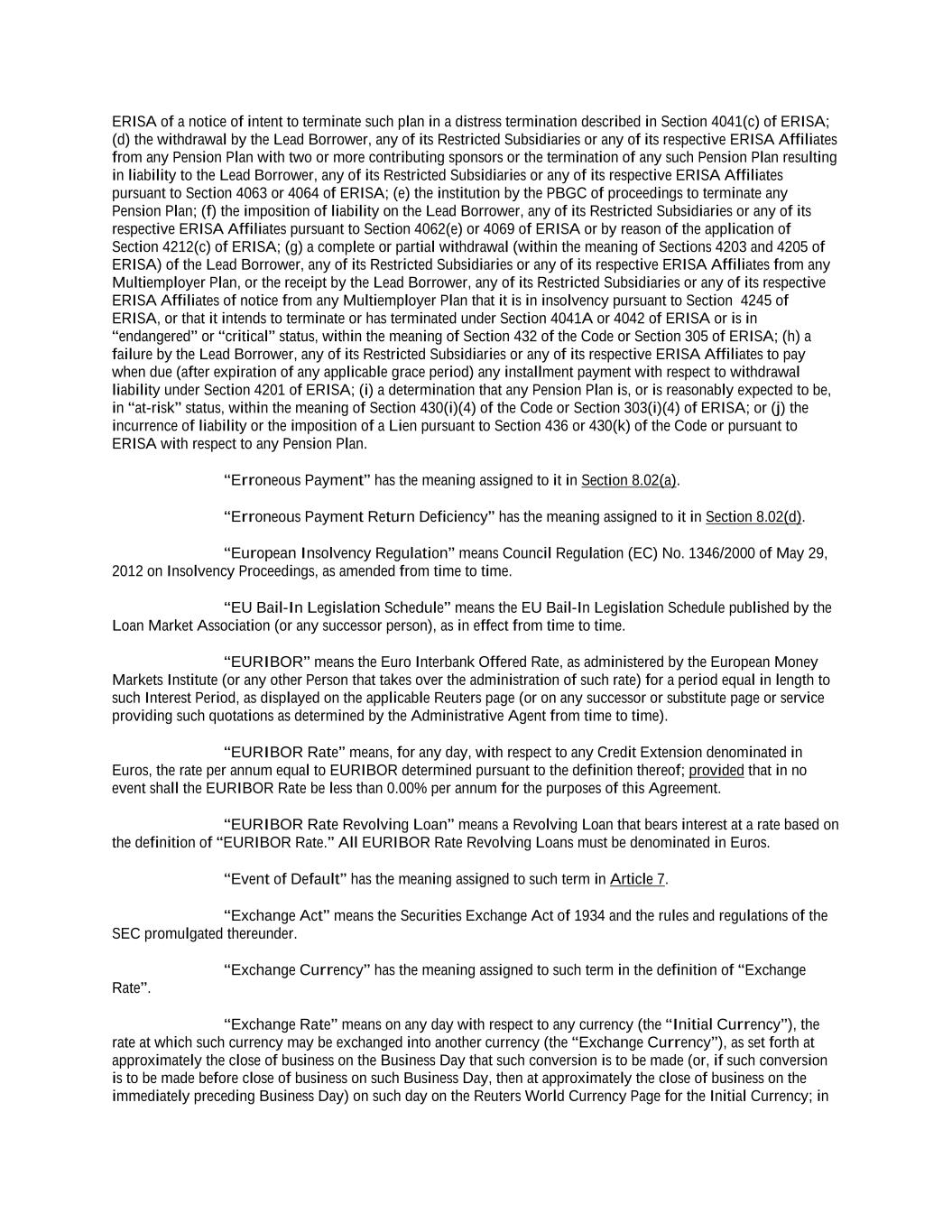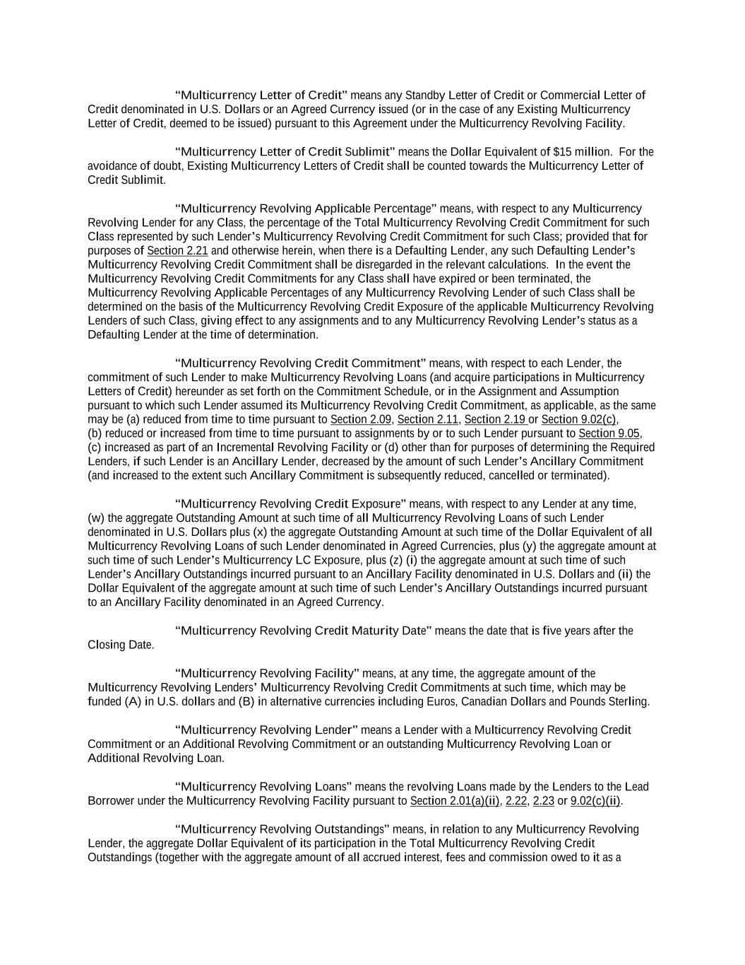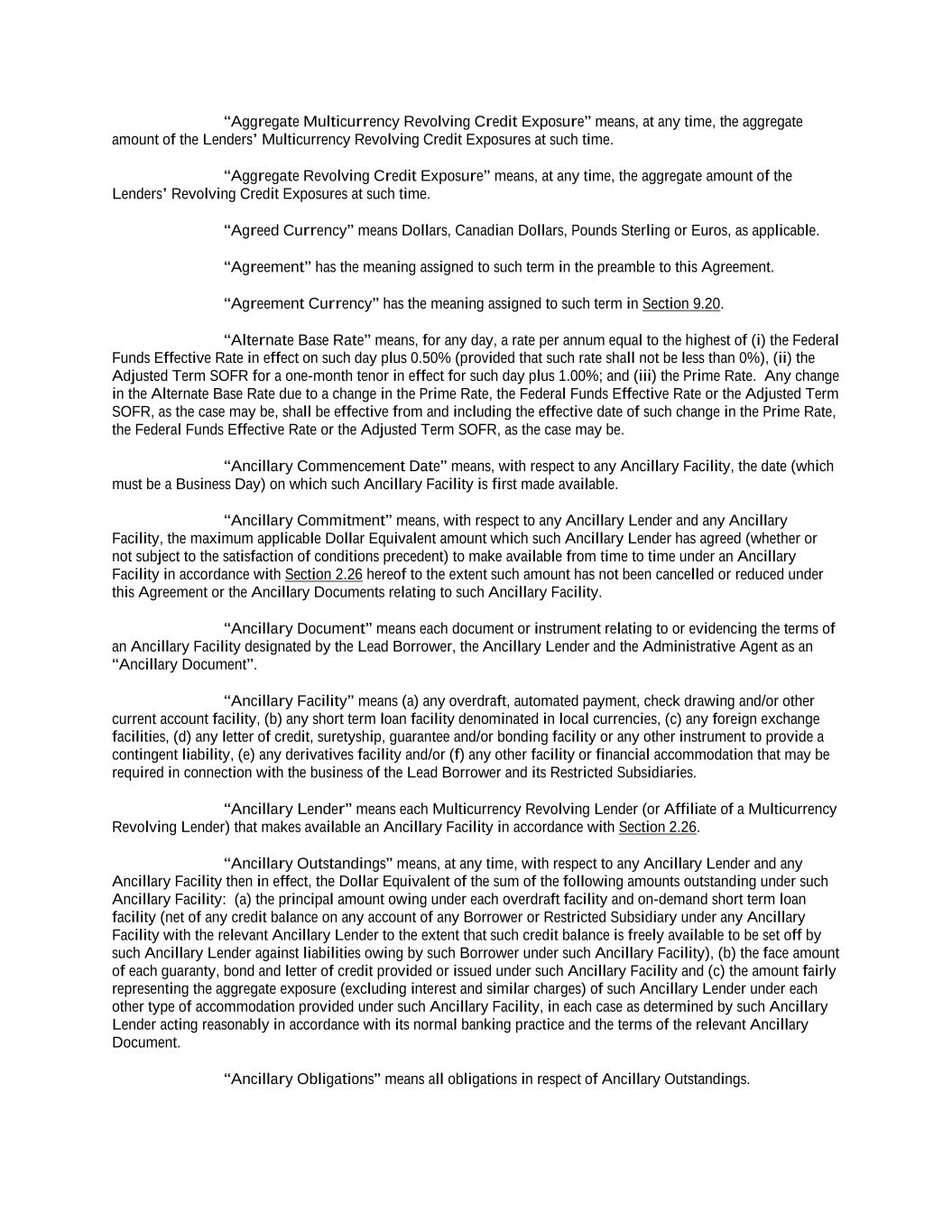 “Aggregate Multicurrency Revolving Credit Exposure” means, at any time, the aggregate amount of the Lenders’ Multicurrency Revolving Credit Exposures at such time. “Aggregate Revolving Credit Exposure” means, at any time, the aggregate amount of the Lenders’ Revolving Credit Exposures at such time. “Agreed Currency” means Dollars, Canadian Dollars, Pounds Sterling or Euros, as applicable. “Agreement” has the meaning assigned to such term in the preamble to this Agreement. “Agreement Currency” has the meaning assigned to such term in Section 9.20. “Alternate Base Rate” means, for any day, a rate per annum equal to the highest of (i) the Federal Funds Effective Rate in effect on such day plus 0.50% (provided that such rate shall not be less than 0%), (ii) the Adjusted Term SOFR for a one-month tenor in effect for such day plus 1.00%; and (iii) the Prime Rate. Any change in the Alternate Base Rate due to a change in the Prime Rate, the Federal Funds Effective Rate or the Adjusted Term SOFR, as the case may be, shall be effective from and including the effective date of such change in the Prime Rate, the Federal Funds Effective Rate or the Adjusted Term SOFR, as the case may be. “Ancillary Commencement Date” means, with respect to any Ancillary Facility, the date (which must be a Business Day) on which such Ancillary Facility is first made available. “Ancillary Commitment” means, with respect to any Ancillary Lender and any Ancillary Facility, the maximum applicable Dollar Equivalent amount which such Ancillary Lender has agreed (whether or not subject to the satisfaction of conditions precedent) to make available from time to time under an Ancillary Facility in accordance with Section 2.26 hereof to the extent such amount has not been cancelled or reduced under this Agreement or the Ancillary Documents relating to such Ancillary Facility. “Ancillary Document” means each document or instrument relating to or evidencing the terms of an Ancillary Facility designated by the Lead Borrower, the Ancillary Lender and the Administrative Agent as an “Ancillary Document”. “Ancillary Facility” means (a) any overdraft, automated payment, check drawing and/or other current account facility, (b) any short term loan facility denominated in local currencies, (c) any foreign exchange facilities, (d) any letter of credit, suretyship, guarantee and/or bonding facility or any other instrument to provide a contingent liability, (e) any derivatives facility and/or (f) any other facility or financial accommodation that may be required in connection with the business of the Lead Borrower and its Restricted Subsidiaries. “Ancillary Lender” means each Multicurrency Revolving Lender (or Affiliate of a Multicurrency Revolving Lender) that makes available an Ancillary Facility in accordance with Section 2.26. “Ancillary Outstandings” means, at any time, with respect to any Ancillary Lender and any Ancillary Facility then in effect, the Dollar Equivalent of the sum of the following amounts outstanding under such Ancillary Facility: (a) the principal amount owing under each overdraft facility and on-demand short term loan facility (net of any credit balance on any account of any Borrower or Restricted Subsidiary under any Ancillary Facility with the relevant Ancillary Lender to the extent that such credit balance is freely available to be set off by such Ancillary Lender against liabilities owing by such Borrower under such Ancillary Facility), (b) the face amount of each guaranty, bond and letter of credit provided or issued under such Ancillary Facility and (c) the amount fairly representing the aggregate exposure (excluding interest and similar charges) of such Ancillary Lender under each other type of accommodation provided under such Ancillary Facility, in each case as determined by such Ancillary Lender acting reasonably in accordance with its normal banking practice and the terms of the relevant Ancillary Document. “Ancillary Obligations” means all obligations in respect of Ancillary Outstandings.