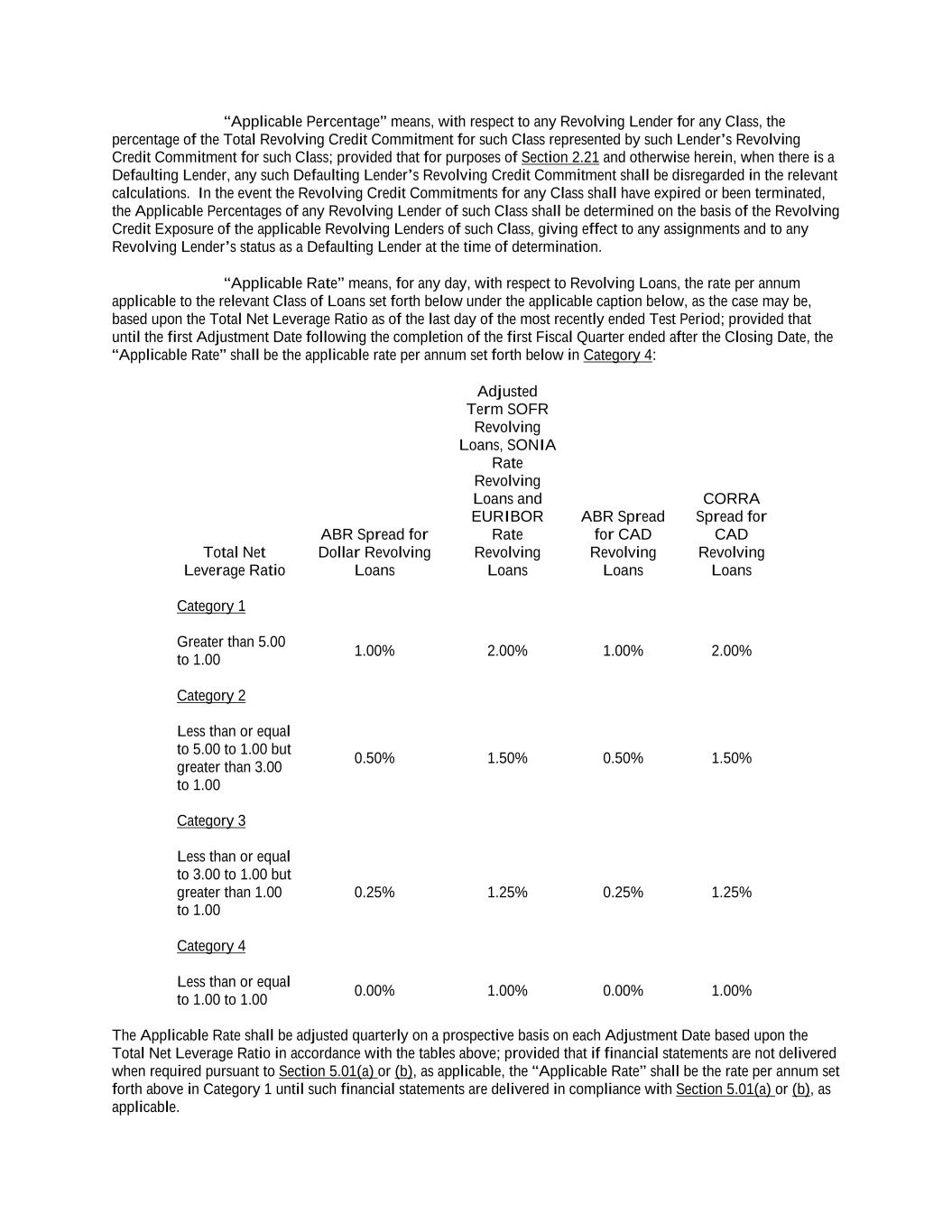 “Applicable Percentage” means, with respect to any Revolving Lender for any Class, the percentage of the Total Revolving Credit Commitment for such Class represented by such Lender’s Revolving Credit Commitment for such Class; provided that for purposes of Section 2.21 and otherwise herein, when there is a Defaulting Lender, any such Defaulting Lender’s Revolving Credit Commitment shall be disregarded in the relevant calculations. In the event the Revolving Credit Commitments for any Class shall have expired or been terminated, the Applicable Percentages of any Revolving Lender of such Class shall be determined on the basis of the Revolving Credit Exposure of the applicable Revolving Lenders of such Class, giving effect to any assignments and to any Revolving Lender’s status as a Defaulting Lender at the time of determination. “Applicable Rate” means, for any day, with respect to Revolving Loans, the rate per annum applicable to the relevant Class of Loans set forth below under the applicable caption below, as the case may be, based upon the Total Net Leverage Ratio as of the last day of the most recently ended Test Period; provided that until the first Adjustment Date following the completion of the first Fiscal Quarter ended after the Closing Date, the “Applicable Rate” shall be the applicable rate per annum set forth below in Category 4: Total Net Leverage Ratio ABR Spread for Dollar Revolving Loans Adjusted Term SOFR Revolving Loans, SONIA Rate Revolving Loans and EURIBOR Rate Revolving Loans ABR Spread for CAD Revolving Loans CORRA Spread for CAD Revolving Loans Category 1 Greater than 5.00 to 1.00 1.00% 2.00% 1.00% 2.00% Category 2 Less than or equal to 5.00 to 1.00 but greater than 3.00 to 1.00 0.50% 1.50% 0.50% 1.50% Category 3 Less than or equal to 3.00 to 1.00 but greater than 1.00 to 1.00 0.25% 1.25% 0.25% 1.25% Category 4 Less than or equal to 1.00 to 1.00 0.00% 1.00% 0.00% 1.00% The Applicable Rate shall be adjusted quarterly on a prospective basis on each Adjustment Date based upon the Total Net Leverage Ratio in accordance with the tables above; provided that if financial statements are not delivered when required pursuant to Section 5.01(a) or (b), as applicable, the “Applicable Rate” shall be the rate per annum set forth above in Category 1 until such financial statements are delivered in compliance with Section 5.01(a) or (b), as applicable.