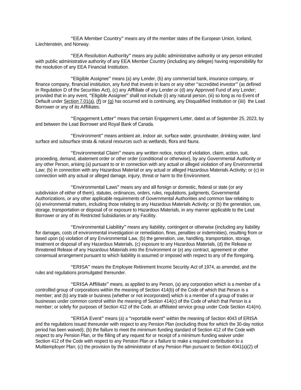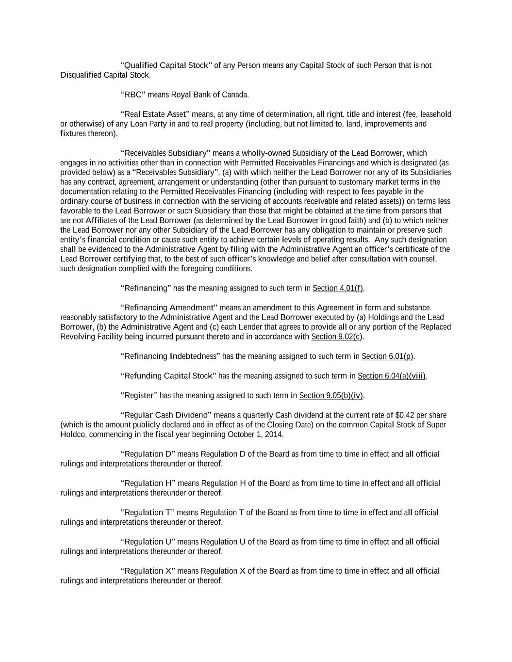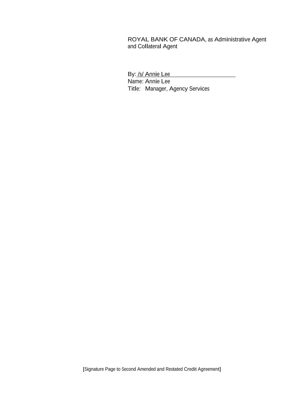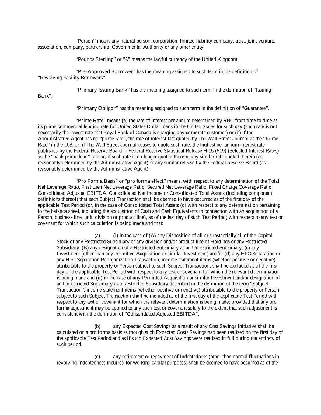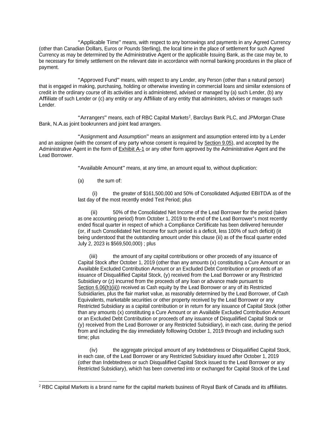 “Applicable Time” means, with respect to any borrowings and payments in any Agreed Currency (other than Canadian Dollars, Euros or Pounds Sterling), the local time in the place of settlement for such Agreed Currency as may be determined by the Administrative Agent or the applicable Issuing Bank, as the case may be, to be necessary for timely settlement on the relevant date in accordance with normal banking procedures in the place of payment. “Approved Fund” means, with respect to any Lender, any Person (other than a natural person) that is engaged in making, purchasing, holding or otherwise investing in commercial loans and similar extensions of credit in the ordinary course of its activities and is administered, advised or managed by (a) such Lender, (b) any Affiliate of such Lender or (c) any entity or any Affiliate of any entity that administers, advises or manages such Lender. “Arrangers” means, each of RBC Capital Markets2, Barclays Bank PLC, and JPMorgan Chase Bank, N.A.as joint bookrunners and joint lead arrangers. “Assignment and Assumption” means an assignment and assumption entered into by a Lender and an assignee (with the consent of any party whose consent is required by Section 9.05), and accepted by the Administrative Agent in the form of Exhibit A-1 or any other form approved by the Administrative Agent and the Lead Borrower. “Available Amount” means, at any time, an amount equal to, without duplication: (a) the sum of: (i) the greater of $161,500,000 and 50% of Consolidated Adjusted EBITDA as of the last day of the most recently ended Test Period; plus (ii) 50% of the Consolidated Net Income of the Lead Borrower for the period (taken as one accounting period) from October 1, 2019 to the end of the Lead Borrower’s most recently ended fiscal quarter in respect of which a Compliance Certificate has been delivered hereunder (or, if such Consolidated Net Income for such period is a deficit, less 100% of such deficit) (it being understood that the outstanding amount under this clause (ii) as of the fiscal quarter ended July 2, 2023 is $569,500,000) ; plus (iii) the amount of any capital contributions or other proceeds of any issuance of Capital Stock after October 1, 2019 (other than any amounts (x) constituting a Cure Amount or an Available Excluded Contribution Amount or an Excluded Debt Contribution or proceeds of an issuance of Disqualified Capital Stock, (y) received from the Lead Borrower or any Restricted Subsidiary or (z) incurred from the proceeds of any loan or advance made pursuant to Section 6.06(h)(ii)) received as Cash equity by the Lead Borrower or any of its Restricted Subsidiaries, plus the fair market value, as reasonably determined by the Lead Borrower, of Cash Equivalents, marketable securities or other property received by the Lead Borrower or any Restricted Subsidiary as a capital contribution or in return for any issuance of Capital Stock (other than any amounts (x) constituting a Cure Amount or an Available Excluded Contribution Amount or an Excluded Debt Contribution or proceeds of any issuance of Disqualified Capital Stock or (y) received from the Lead Borrower or any Restricted Subsidiary), in each case, during the period from and including the day immediately following October 1, 2019 through and including such time; plus (iv) the aggregate principal amount of any Indebtedness or Disqualified Capital Stock, in each case, of the Lead Borrower or any Restricted Subsidiary issued after October 1, 2019 (other than Indebtedness or such Disqualified Capital Stock issued to the Lead Borrower or any Restricted Subsidiary), which has been converted into or exchanged for Capital Stock of the Lead 2 RBC Capital Markets is a brand name for the capital markets business of Royal Bank of Canada and its affiliates.