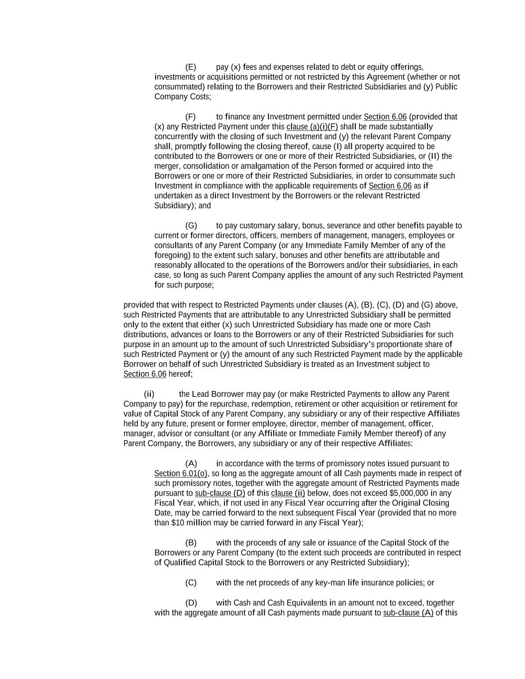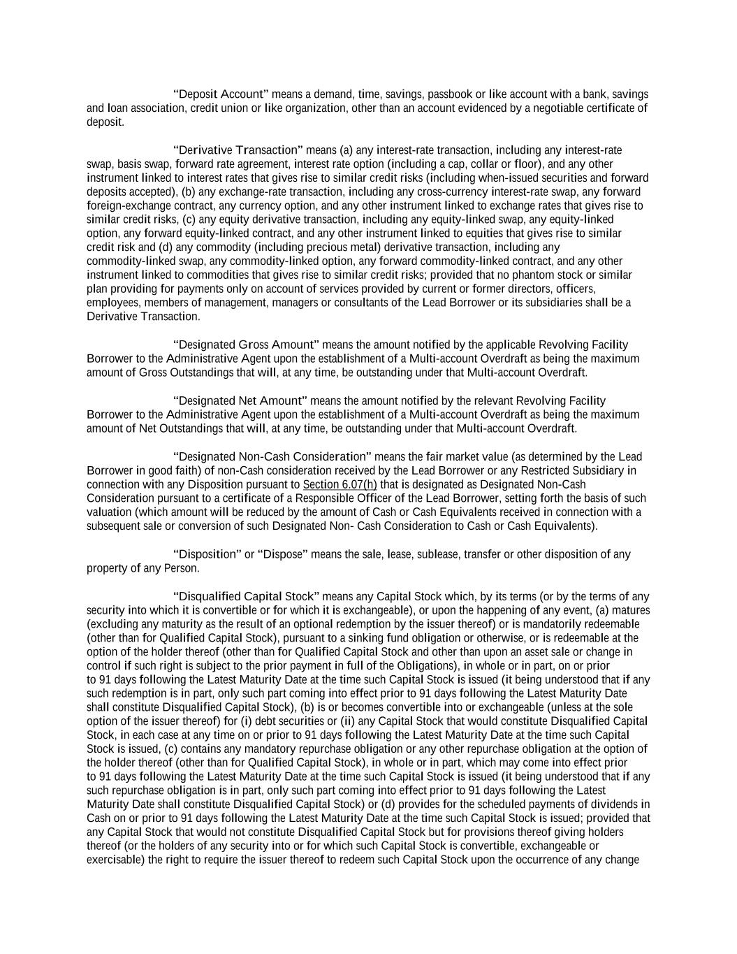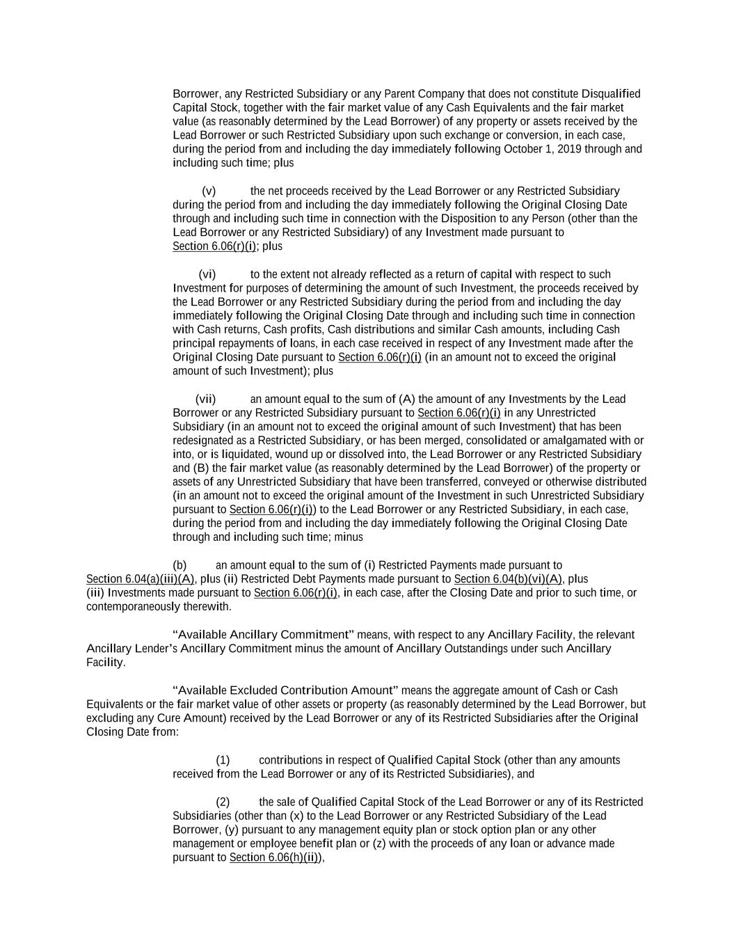 Borrower, any Restricted Subsidiary or any Parent Company that does not constitute Disqualified Capital Stock, together with the fair market value of any Cash Equivalents and the fair market value (as reasonably determined by the Lead Borrower) of any property or assets received by the Lead Borrower or such Restricted Subsidiary upon such exchange or conversion, in each case, during the period from and including the day immediately following October 1, 2019 through and including such time; plus (v) the net proceeds received by the Lead Borrower or any Restricted Subsidiary during the period from and including the day immediately following the Original Closing Date through and including such time in connection with the Disposition to any Person (other than the Lead Borrower or any Restricted Subsidiary) of any Investment made pursuant to Section 6.06(r)(i); plus (vi) to the extent not already reflected as a return of capital with respect to such Investment for purposes of determining the amount of such Investment, the proceeds received by the Lead Borrower or any Restricted Subsidiary during the period from and including the day immediately following the Original Closing Date through and including such time in connection with Cash returns, Cash profits, Cash distributions and similar Cash amounts, including Cash principal repayments of loans, in each case received in respect of any Investment made after the Original Closing Date pursuant to Section 6.06(r)(i) (in an amount not to exceed the original amount of such Investment); plus (vii) an amount equal to the sum of (A) the amount of any Investments by the Lead Borrower or any Restricted Subsidiary pursuant to Section 6.06(r)(i) in any Unrestricted Subsidiary (in an amount not to exceed the original amount of such Investment) that has been redesignated as a Restricted Subsidiary, or has been merged, consolidated or amalgamated with or into, or is liquidated, wound up or dissolved into, the Lead Borrower or any Restricted Subsidiary and (B) the fair market value (as reasonably determined by the Lead Borrower) of the property or assets of any Unrestricted Subsidiary that have been transferred, conveyed or otherwise distributed (in an amount not to exceed the original amount of the Investment in such Unrestricted Subsidiary pursuant to Section 6.06(r)(i)) to the Lead Borrower or any Restricted Subsidiary, in each case, during the period from and including the day immediately following the Original Closing Date through and including such time; minus (b) an amount equal to the sum of (i) Restricted Payments made pursuant to Section 6.04(a)(iii)(A), plus (ii) Restricted Debt Payments made pursuant to Section 6.04(b)(vi)(A), plus (iii) Investments made pursuant to Section 6.06(r)(i), in each case, after the Closing Date and prior to such time, or contemporaneously therewith. “Available Ancillary Commitment” means, with respect to any Ancillary Facility, the relevant Ancillary Lender’s Ancillary Commitment minus the amount of Ancillary Outstandings under such Ancillary Facility. “Available Excluded Contribution Amount” means the aggregate amount of Cash or Cash Equivalents or the fair market value of other assets or property (as reasonably determined by the Lead Borrower, but excluding any Cure Amount) received by the Lead Borrower or any of its Restricted Subsidiaries after the Original Closing Date from: (1) contributions in respect of Qualified Capital Stock (other than any amounts received from the Lead Borrower or any of its Restricted Subsidiaries), and (2) the sale of Qualified Capital Stock of the Lead Borrower or any of its Restricted Subsidiaries (other than (x) to the Lead Borrower or any Restricted Subsidiary of the Lead Borrower, (y) pursuant to any management equity plan or stock option plan or any other management or employee benefit plan or (z) with the proceeds of any loan or advance made pursuant to Section 6.06(h)(ii)),