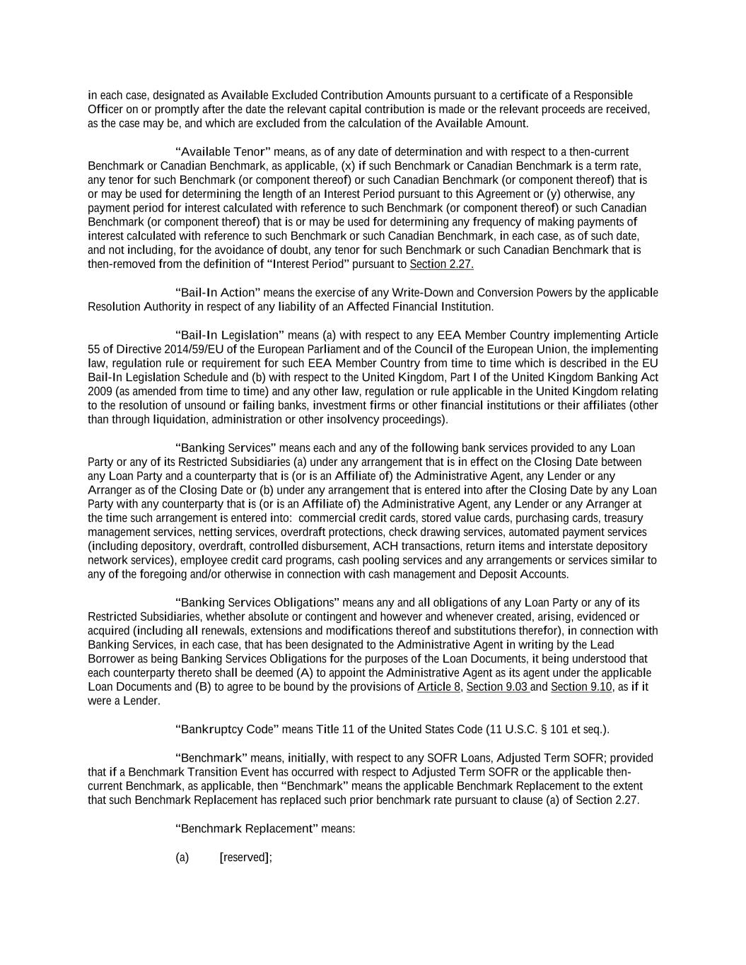 in each case, designated as Available Excluded Contribution Amounts pursuant to a certificate of a Responsible Officer on or promptly after the date the relevant capital contribution is made or the relevant proceeds are received, as the case may be, and which are excluded from the calculation of the Available Amount. “Available Tenor” means, as of any date of determination and with respect to a then-current Benchmark or Canadian Benchmark, as applicable, (x) if such Benchmark or Canadian Benchmark is a term rate, any tenor for such Benchmark (or component thereof) or such Canadian Benchmark (or component thereof) that is or may be used for determining the length of an Interest Period pursuant to this Agreement or (y) otherwise, any payment period for interest calculated with reference to such Benchmark (or component thereof) or such Canadian Benchmark (or component thereof) that is or may be used for determining any frequency of making payments of interest calculated with reference to such Benchmark or such Canadian Benchmark, in each case, as of such date, and not including, for the avoidance of doubt, any tenor for such Benchmark or such Canadian Benchmark that is then-removed from the definition of “Interest Period” pursuant to Section 2.27. “Bail-In Action” means the exercise of any Write-Down and Conversion Powers by the applicable Resolution Authority in respect of any liability of an Affected Financial Institution. “Bail-In Legislation” means (a) with respect to any EEA Member Country implementing Article 55 of Directive 2014/59/EU of the European Parliament and of the Council of the European Union, the implementing law, regulation rule or requirement for such EEA Member Country from time to time which is described in the EU Bail-In Legislation Schedule and (b) with respect to the United Kingdom, Part I of the United Kingdom Banking Act 2009 (as amended from time to time) and any other law, regulation or rule applicable in the United Kingdom relating to the resolution of unsound or failing banks, investment firms or other financial institutions or their affiliates (other than through liquidation, administration or other insolvency proceedings). “Banking Services” means each and any of the following bank services provided to any Loan Party or any of its Restricted Subsidiaries (a) under any arrangement that is in effect on the Closing Date between any Loan Party and a counterparty that is (or is an Affiliate of) the Administrative Agent, any Lender or any Arranger as of the Closing Date or (b) under any arrangement that is entered into after the Closing Date by any Loan Party with any counterparty that is (or is an Affiliate of) the Administrative Agent, any Lender or any Arranger at the time such arrangement is entered into: commercial credit cards, stored value cards, purchasing cards, treasury management services, netting services, overdraft protections, check drawing services, automated payment services (including depository, overdraft, controlled disbursement, ACH transactions, return items and interstate depository network services), employee credit card programs, cash pooling services and any arrangements or services similar to any of the foregoing and/or otherwise in connection with cash management and Deposit Accounts. “Banking Services Obligations” means any and all obligations of any Loan Party or any of its Restricted Subsidiaries, whether absolute or contingent and however and whenever created, arising, evidenced or acquired (including all renewals, extensions and modifications thereof and substitutions therefor), in connection with Banking Services, in each case, that has been designated to the Administrative Agent in writing by the Lead Borrower as being Banking Services Obligations for the purposes of the Loan Documents, it being understood that each counterparty thereto shall be deemed (A) to appoint the Administrative Agent as its agent under the applicable Loan Documents and (B) to agree to be bound by the provisions of Article 8, Section 9.03 and Section 9.10, as if it were a Lender. “Bankruptcy Code” means Title 11 of the United States Code (11 U.S.C. § 101 et seq.). “Benchmark” means, initially, with respect to any SOFR Loans, Adjusted Term SOFR; provided that if a Benchmark Transition Event has occurred with respect to Adjusted Term SOFR or the applicable then- current Benchmark, as applicable, then “Benchmark” means the applicable Benchmark Replacement to the extent that such Benchmark Replacement has replaced such prior benchmark rate pursuant to clause (a) of Section 2.27. “Benchmark Replacement” means: (a) [reserved];