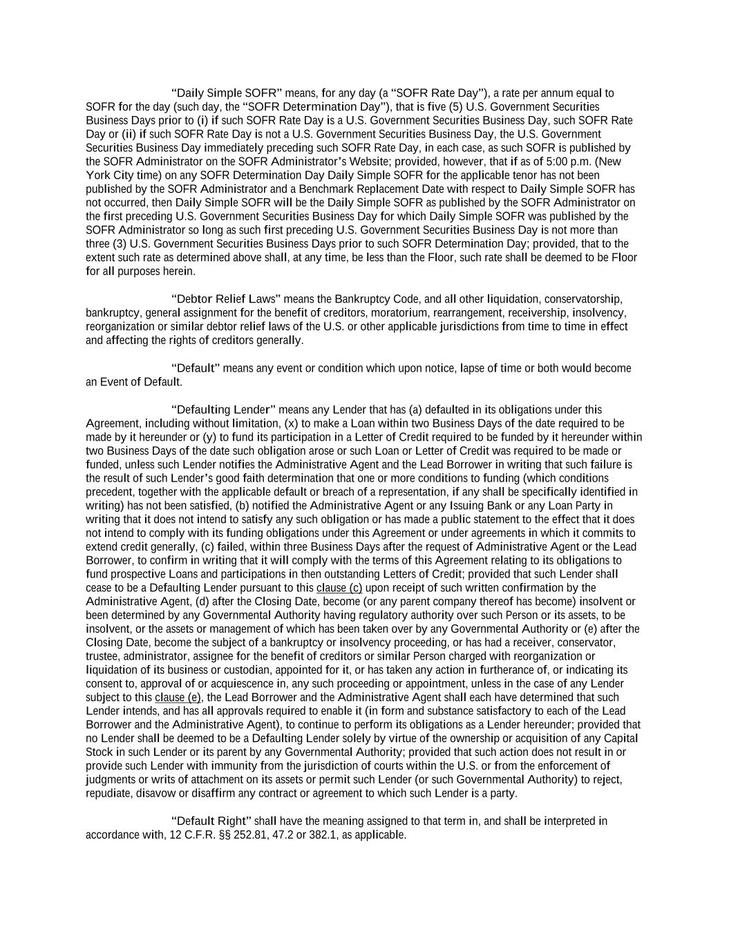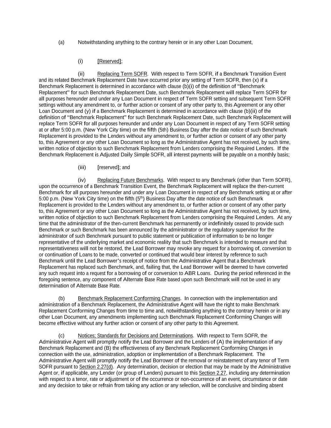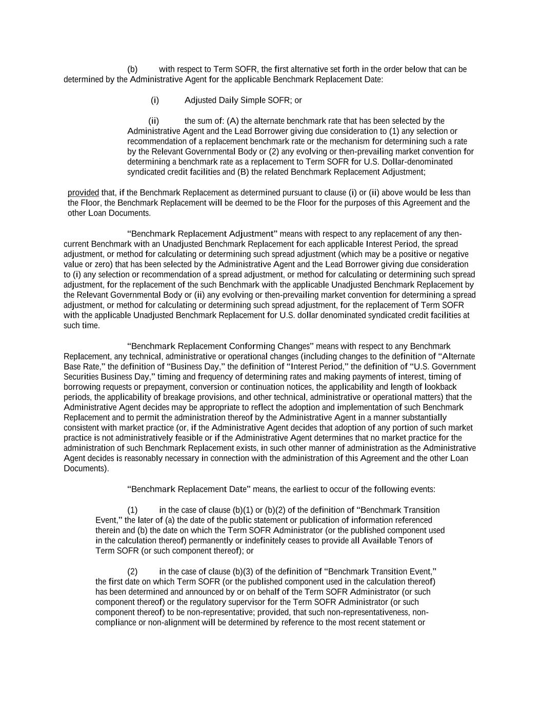 (b) with respect to Term SOFR, the first alternative set forth in the order below that can be determined by the Administrative Agent for the applicable Benchmark Replacement Date: (i) Adjusted Daily Simple SOFR; or (ii) the sum of: (A) the alternate benchmark rate that has been selected by the Administrative Agent and the Lead Borrower giving due consideration to (1) any selection or recommendation of a replacement benchmark rate or the mechanism for determining such a rate by the Relevant Governmental Body or (2) any evolving or then-prevailing market convention for determining a benchmark rate as a replacement to Term SOFR for U.S. Dollar-denominated syndicated credit facilities and (B) the related Benchmark Replacement Adjustment; provided that, if the Benchmark Replacement as determined pursuant to clause (i) or (ii) above would be less than the Floor, the Benchmark Replacement will be deemed to be the Floor for the purposes of this Agreement and the other Loan Documents. “Benchmark Replacement Adjustment” means with respect to any replacement of any then- current Benchmark with an Unadjusted Benchmark Replacement for each applicable Interest Period, the spread adjustment, or method for calculating or determining such spread adjustment (which may be a positive or negative value or zero) that has been selected by the Administrative Agent and the Lead Borrower giving due consideration to (i) any selection or recommendation of a spread adjustment, or method for calculating or determining such spread adjustment, for the replacement of the such Benchmark with the applicable Unadjusted Benchmark Replacement by the Relevant Governmental Body or (ii) any evolving or then-prevailing market convention for determining a spread adjustment, or method for calculating or determining such spread adjustment, for the replacement of Term SOFR with the applicable Unadjusted Benchmark Replacement for U.S. dollar denominated syndicated credit facilities at such time. “Benchmark Replacement Conforming Changes” means with respect to any Benchmark Replacement, any technical, administrative or operational changes (including changes to the definition of “Alternate Base Rate,” the definition of “Business Day,” the definition of “Interest Period,” the definition of “U.S. Government Securities Business Day,” timing and frequency of determining rates and making payments of interest, timing of borrowing requests or prepayment, conversion or continuation notices, the applicability and length of lookback periods, the applicability of breakage provisions, and other technical, administrative or operational matters) that the Administrative Agent decides may be appropriate to reflect the adoption and implementation of such Benchmark Replacement and to permit the administration thereof by the Administrative Agent in a manner substantially consistent with market practice (or, if the Administrative Agent decides that adoption of any portion of such market practice is not administratively feasible or if the Administrative Agent determines that no market practice for the administration of such Benchmark Replacement exists, in such other manner of administration as the Administrative Agent decides is reasonably necessary in connection with the administration of this Agreement and the other Loan Documents). “Benchmark Replacement Date” means, the earliest to occur of the following events: (1) in the case of clause (b)(1) or (b)(2) of the definition of “Benchmark Transition Event,” the later of (a) the date of the public statement or publication of information referenced therein and (b) the date on which the Term SOFR Administrator (or the published component used in the calculation thereof) permanently or indefinitely ceases to provide all Available Tenors of Term SOFR (or such component thereof); or (2) in the case of clause (b)(3) of the definition of “Benchmark Transition Event,” the first date on which Term SOFR (or the published component used in the calculation thereof) has been determined and announced by or on behalf of the Term SOFR Administrator (or such component thereof) or the regulatory supervisor for the Term SOFR Administrator (or such component thereof) to be non-representative; provided, that such non-representativeness, non- compliance or non-alignment will be determined by reference to the most recent statement or