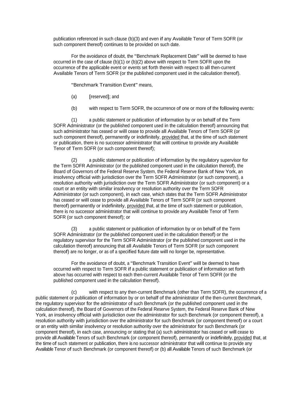 publication referenced in such clause (b)(3) and even if any Available Tenor of Term SOFR (or such component thereof) continues to be provided on such date. For the avoidance of doubt, the “Benchmark Replacement Date” will be deemed to have occurred in the case of clause (b)(1) or (b)(2) above with respect to Term SOFR upon the occurrence of the applicable event or events set forth therein with respect to all then-current Available Tenors of Term SOFR (or the published component used in the calculation thereof). “Benchmark Transition Event” means, (a) [reserved]; and (b) with respect to Term SOFR, the occurrence of one or more of the following events: (1) a public statement or publication of information by or on behalf of the Term SOFR Administrator (or the published component used in the calculation thereof) announcing that such administrator has ceased or will cease to provide all Available Tenors of Term SOFR (or such component thereof), permanently or indefinitely, provided that, at the time of such statement or publication, there is no successor administrator that will continue to provide any Available Tenor of Term SOFR (or such component thereof); (2) a public statement or publication of information by the regulatory supervisor for the Term SOFR Administrator (or the published component used in the calculation thereof), the Board of Governors of the Federal Reserve System, the Federal Reserve Bank of New York, an insolvency official with jurisdiction over the Term SOFR Administrator (or such component), a resolution authority with jurisdiction over the Term SOFR Administrator (or such component) or a court or an entity with similar insolvency or resolution authority over the Term SOFR Administrator (or such component), in each case, which states that the Term SOFR Administrator has ceased or will cease to provide all Available Tenors of Term SOFR (or such component thereof) permanently or indefinitely, provided that, at the time of such statement or publication, there is no successor administrator that will continue to provide any Available Tenor of Term SOFR (or such component thereof); or (3) a public statement or publication of information by or on behalf of the Term SOFR Administrator (or the published component used in the calculation thereof) or the regulatory supervisor for the Term SOFR Administrator (or the published component used in the calculation thereof) announcing that all Available Tenors of Term SOFR (or such component thereof) are no longer, or as of a specified future date will no longer be, representative. For the avoidance of doubt, a “Benchmark Transition Event” will be deemed to have occurred with respect to Term SOFR if a public statement or publication of information set forth above has occurred with respect to each then-current Available Tenor of Term SOFR (or the published component used in the calculation thereof). (c) with respect to any then-current Benchmark (other than Term SOFR), the occurrence of a public statement or publication of information by or on behalf of the administrator of the then-current Benchmark, the regulatory supervisor for the administrator of such Benchmark (or the published component used in the calculation thereof), the Board of Governors of the Federal Reserve System, the Federal Reserve Bank of New York, an insolvency official with jurisdiction over the administrator for such Benchmark (or component thereof), a resolution authority with jurisdiction over the administrator for such Benchmark (or component thereof) or a court or an entity with similar insolvency or resolution authority over the administrator for such Benchmark (or component thereof), in each case, announcing or stating that (a) such administrator has ceased or will cease to provide all Available Tenors of such Benchmark (or component thereof), permanently or indefinitely, provided that, at the time of such statement or publication, there is no successor administrator that will continue to provide any Available Tenor of such Benchmark (or component thereof) or (b) all Available Tenors of such Benchmark (or