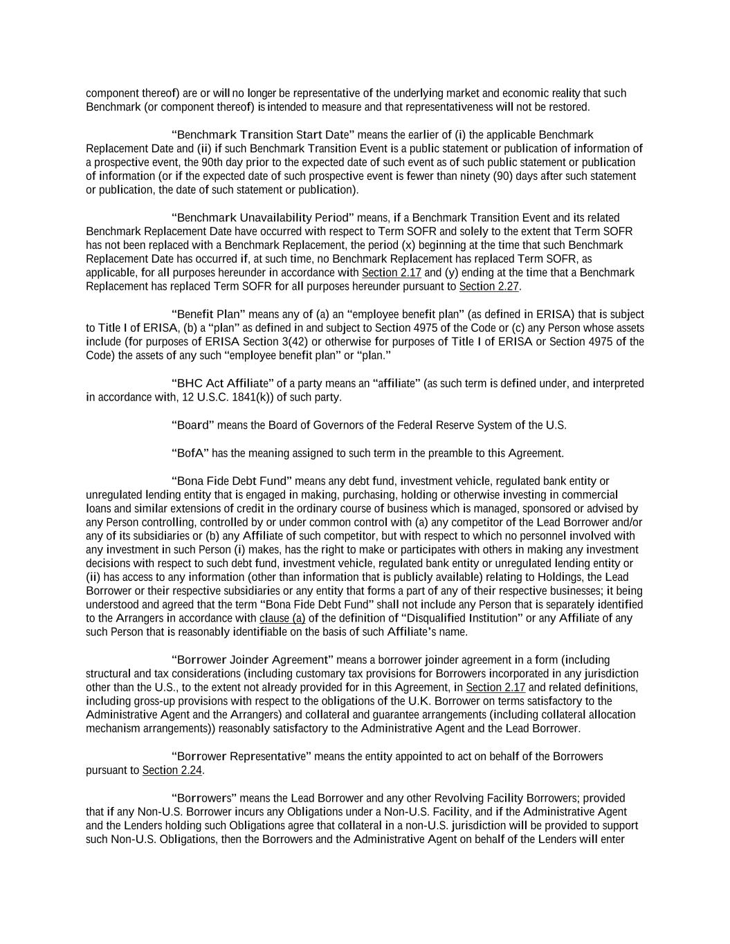 component thereof) are or will no longer be representative of the underlying market and economic reality that such Benchmark (or component thereof) is intended to measure and that representativeness will not be restored. “Benchmark Transition Start Date” means the earlier of (i) the applicable Benchmark Replacement Date and (ii) if such Benchmark Transition Event is a public statement or publication of information of a prospective event, the 90th day prior to the expected date of such event as of such public statement or publication of information (or if the expected date of such prospective event is fewer than ninety (90) days after such statement or publication, the date of such statement or publication). “Benchmark Unavailability Period” means, if a Benchmark Transition Event and its related Benchmark Replacement Date have occurred with respect to Term SOFR and solely to the extent that Term SOFR has not been replaced with a Benchmark Replacement, the period (x) beginning at the time that such Benchmark Replacement Date has occurred if, at such time, no Benchmark Replacement has replaced Term SOFR, as applicable, for all purposes hereunder in accordance with Section 2.17 and (y) ending at the time that a Benchmark Replacement has replaced Term SOFR for all purposes hereunder pursuant to Section 2.27. “Benefit Plan” means any of (a) an “employee benefit plan” (as defined in ERISA) that is subject to Title I of ERISA, (b) a “plan” as defined in and subject to Section 4975 of the Code or (c) any Person whose assets include (for purposes of ERISA Section 3(42) or otherwise for purposes of Title I of ERISA or Section 4975 of the Code) the assets of any such “employee benefit plan” or “plan.” “BHC Act Affiliate” of a party means an “affiliate” (as such term is defined under, and interpreted in accordance with, 12 U.S.C. 1841(k)) of such party. “Board” means the Board of Governors of the Federal Reserve System of the U.S. “BofA” has the meaning assigned to such term in the preamble to this Agreement. “Bona Fide Debt Fund” means any debt fund, investment vehicle, regulated bank entity or unregulated lending entity that is engaged in making, purchasing, holding or otherwise investing in commercial loans and similar extensions of credit in the ordinary course of business which is managed, sponsored or advised by any Person controlling, controlled by or under common control with (a) any competitor of the Lead Borrower and/or any of its subsidiaries or (b) any Affiliate of such competitor, but with respect to which no personnel involved with any investment in such Person (i) makes, has the right to make or participates with others in making any investment decisions with respect to such debt fund, investment vehicle, regulated bank entity or unregulated lending entity or (ii) has access to any information (other than information that is publicly available) relating to Holdings, the Lead Borrower or their respective subsidiaries or any entity that forms a part of any of their respective businesses; it being understood and agreed that the term “Bona Fide Debt Fund” shall not include any Person that is separately identified to the Arrangers in accordance with clause (a) of the definition of “Disqualified Institution” or any Affiliate of any such Person that is reasonably identifiable on the basis of such Affiliate’s name. “Borrower Joinder Agreement” means a borrower joinder agreement in a form (including structural and tax considerations (including customary tax provisions for Borrowers incorporated in any jurisdiction other than the U.S., to the extent not already provided for in this Agreement, in Section 2.17 and related definitions, including gross-up provisions with respect to the obligations of the U.K. Borrower on terms satisfactory to the Administrative Agent and the Arrangers) and collateral and guarantee arrangements (including collateral allocation mechanism arrangements)) reasonably satisfactory to the Administrative Agent and the Lead Borrower. “Borrower Representative” means the entity appointed to act on behalf of the Borrowers pursuant to Section 2.24. “Borrowers” means the Lead Borrower and any other Revolving Facility Borrowers; provided that if any Non-U.S. Borrower incurs any Obligations under a Non-U.S. Facility, and if the Administrative Agent and the Lenders holding such Obligations agree that collateral in a non-U.S. jurisdiction will be provided to support such Non-U.S. Obligations, then the Borrowers and the Administrative Agent on behalf of the Lenders will enter
