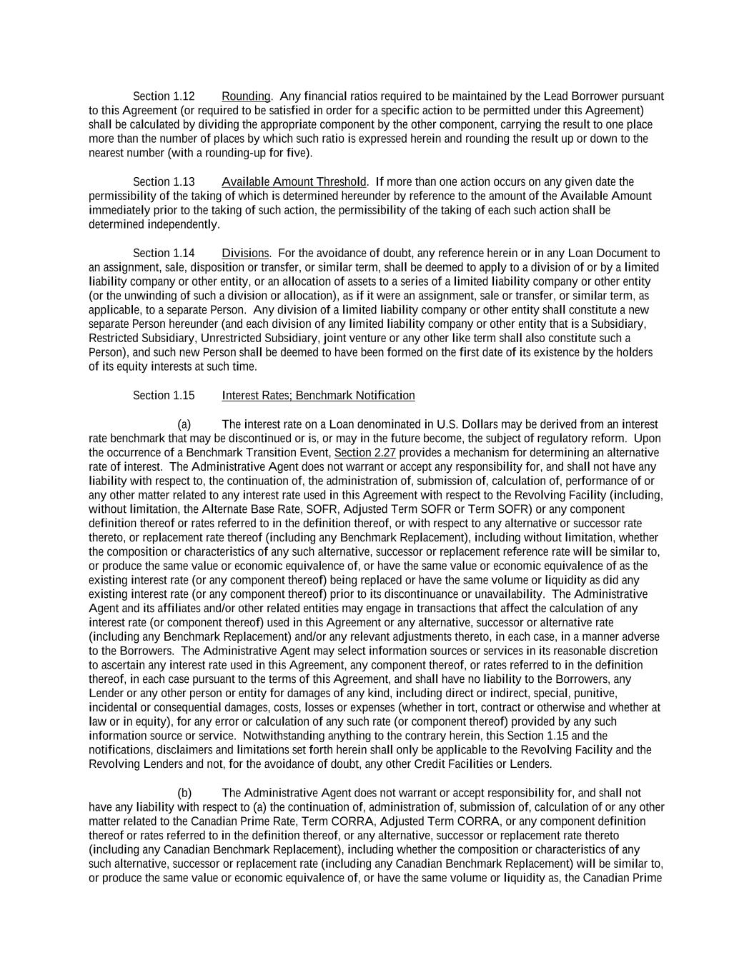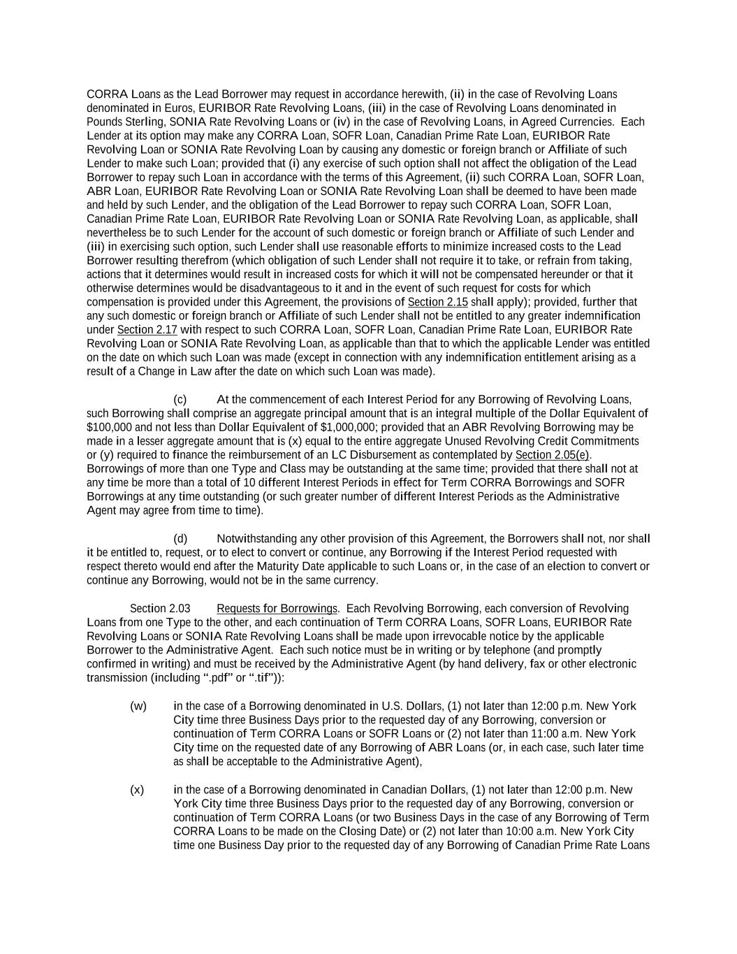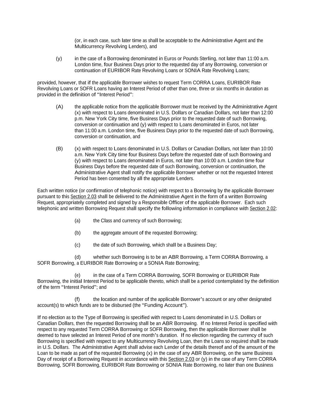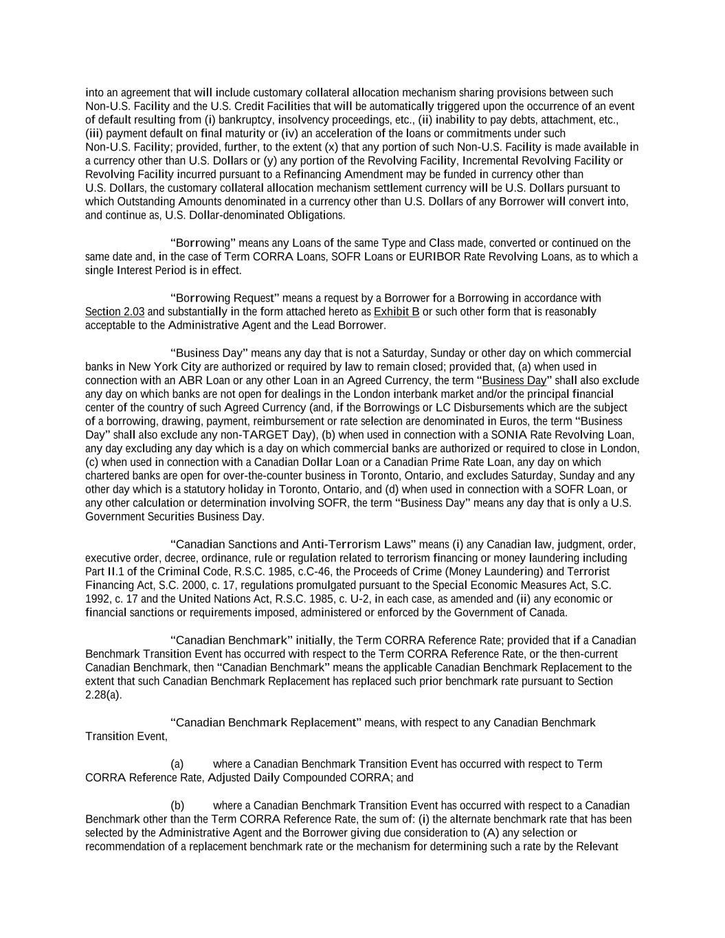 into an agreement that will include customary collateral allocation mechanism sharing provisions between such Non-U.S. Facility and the U.S. Credit Facilities that will be automatically triggered upon the occurrence of an event of default resulting from (i) bankruptcy, insolvency proceedings, etc., (ii) inability to pay debts, attachment, etc., (iii) payment default on final maturity or (iv) an acceleration of the loans or commitments under such Non-U.S. Facility; provided, further, to the extent (x) that any portion of such Non-U.S. Facility is made available in a currency other than U.S. Dollars or (y) any portion of the Revolving Facility, Incremental Revolving Facility or Revolving Facility incurred pursuant to a Refinancing Amendment may be funded in currency other than U.S. Dollars, the customary collateral allocation mechanism settlement currency will be U.S. Dollars pursuant to which Outstanding Amounts denominated in a currency other than U.S. Dollars of any Borrower will convert into, and continue as, U.S. Dollar-denominated Obligations. “Borrowing” means any Loans of the same Type and Class made, converted or continued on the same date and, in the case of Term CORRA Loans, SOFR Loans or EURIBOR Rate Revolving Loans, as to which a single Interest Period is in effect. “Borrowing Request” means a request by a Borrower for a Borrowing in accordance with Section 2.03 and substantially in the form attached hereto as Exhibit B or such other form that is reasonably acceptable to the Administrative Agent and the Lead Borrower. “Business Day” means any day that is not a Saturday, Sunday or other day on which commercial banks in New York City are authorized or required by law to remain closed; provided that, (a) when used in connection with an ABR Loan or any other Loan in an Agreed Currency, the term “Business Day” shall also exclude any day on which banks are not open for dealings in the London interbank market and/or the principal financial center of the country of such Agreed Currency (and, if the Borrowings or LC Disbursements which are the subject of a borrowing, drawing, payment, reimbursement or rate selection are denominated in Euros, the term “Business Day” shall also exclude any non-TARGET Day), (b) when used in connection with a SONIA Rate Revolving Loan, any day excluding any day which is a day on which commercial banks are authorized or required to close in London, (c) when used in connection with a Canadian Dollar Loan or a Canadian Prime Rate Loan, any day on which chartered banks are open for over-the-counter business in Toronto, Ontario, and excludes Saturday, Sunday and any other day which is a statutory holiday in Toronto, Ontario, and (d) when used in connection with a SOFR Loan, or any other calculation or determination involving SOFR, the term “Business Day” means any day that is only a U.S. Government Securities Business Day. “Canadian Sanctions and Anti-Terrorism Laws” means (i) any Canadian law, judgment, order, executive order, decree, ordinance, rule or regulation related to terrorism financing or money laundering including Part II.1 of the Criminal Code, R.S.C. 1985, c.C-46, the Proceeds of Crime (Money Laundering) and Terrorist Financing Act, S.C. 2000, c. 17, regulations promulgated pursuant to the Special Economic Measures Act, S.C. 1992, c. 17 and the United Nations Act, R.S.C. 1985, c. U-2, in each case, as amended and (ii) any economic or financial sanctions or requirements imposed, administered or enforced by the Government of Canada. “Canadian Benchmark” initially, the Term CORRA Reference Rate; provided that if a Canadian Benchmark Transition Event has occurred with respect to the Term CORRA Reference Rate, or the then-current Canadian Benchmark, then “Canadian Benchmark” means the applicable Canadian Benchmark Replacement to the extent that such Canadian Benchmark Replacement has replaced such prior benchmark rate pursuant to Section 2.28(a). “Canadian Benchmark Replacement” means, with respect to any Canadian Benchmark Transition Event, (a) where a Canadian Benchmark Transition Event has occurred with respect to Term CORRA Reference Rate, Adjusted Daily Compounded CORRA; and (b) where a Canadian Benchmark Transition Event has occurred with respect to a Canadian Benchmark other than the Term CORRA Reference Rate, the sum of: (i) the alternate benchmark rate that has been selected by the Administrative Agent and the Borrower giving due consideration to (A) any selection or recommendation of a replacement benchmark rate or the mechanism for determining such a rate by the Relevant