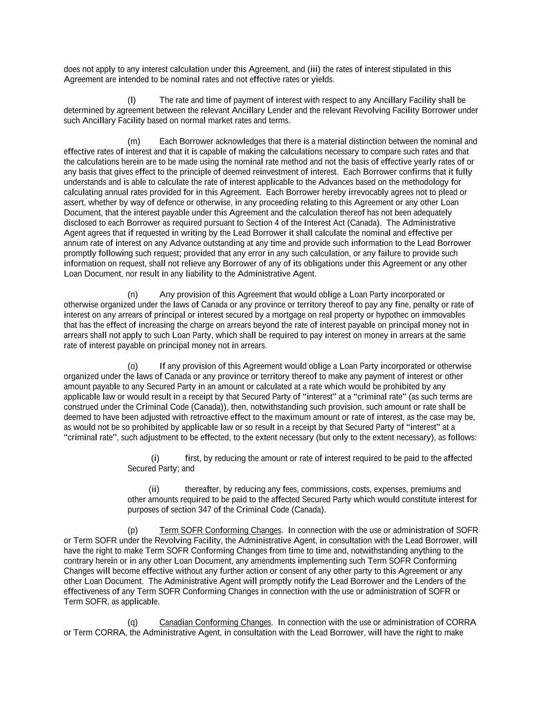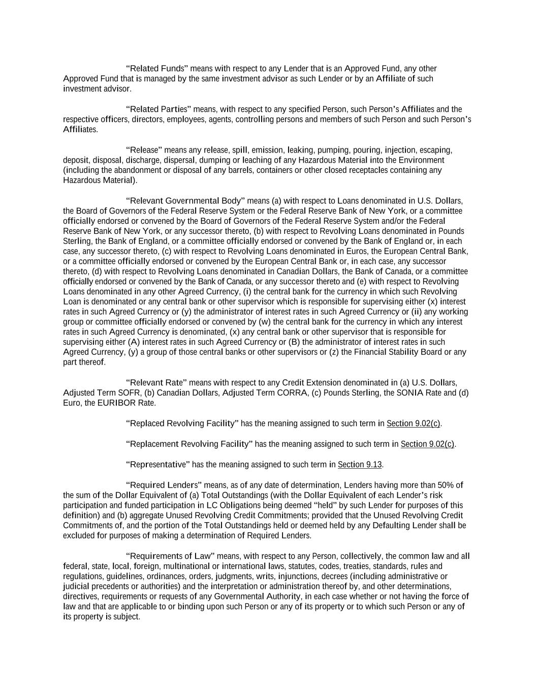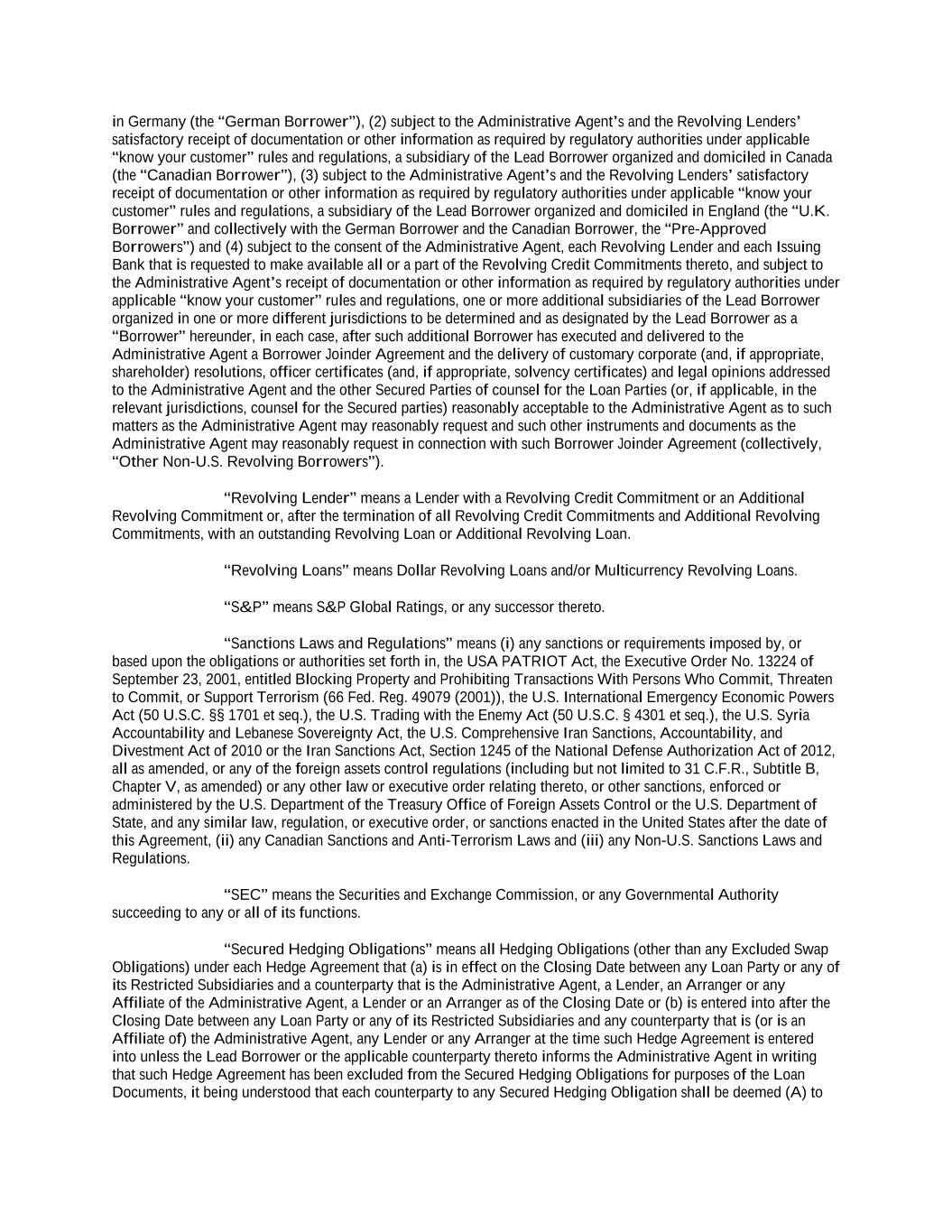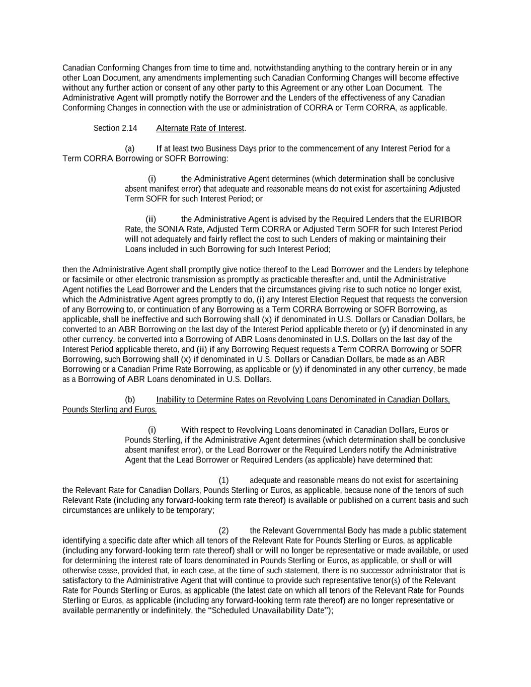 into an agreement that will include customary collateral allocation mechanism sharing provisions between such Non-U.S. Facility and the U.S. Credit Facilities that will be automatically triggered upon the occurrence of an event of default resulting from (i) bankruptcy, insolvency proceedings, etc., (ii) inability to pay debts, attachment, etc., (iii) payment default on final maturity or (iv) an acceleration of the loans or commitments under such Non-U.S. Facility; provided, further, to the extent (x) that any portion of such Non-U.S. Facility is made available in a currency other than U.S. Dollars or (y) any portion of the Revolving Facility, Incremental Revolving Facility or Revolving Facility incurred pursuant to a Refinancing Amendment may be funded in currency other than U.S. Dollars, the customary collateral allocation mechanism settlement currency will be U.S. Dollars pursuant to which Outstanding Amounts denominated in a currency other than U.S. Dollars of any Borrower will convert into, and continue as, U.S. Dollar-denominated Obligations. “Borrowing” means any Loans of the same Type and Class made, converted or continued on the same date and, in the case of Term CORRA Loans, SOFR Loans or EURIBOR Rate Revolving Loans, as to which a single Interest Period is in effect. “Borrowing Request” means a request by a Borrower for a Borrowing in accordance with Section 2.03 and substantially in the form attached hereto as Exhibit B or such other form that is reasonably acceptable to the Administrative Agent and the Lead Borrower. “Business Day” means any day that is not a Saturday, Sunday or other day on which commercial banks in New York City are authorized or required by law to remain closed; provided that, (a) when used in connection with an ABR Loan or any other Loan in an Agreed Currency, the term “Business Day” shall also exclude any day on which banks are not open for dealings in the London interbank market and/or the principal financial center of the country of such Agreed Currency (and, if the Borrowings or LC Disbursements which are the subject of a borrowing, drawing, payment, reimbursement or rate selection are denominated in Euros, the term “Business Day” shall also exclude any non-TARGET Day), (b) when used in connection with a SONIA Rate Revolving Loan, any day excluding any day which is a day on which commercial banks are authorized or required to close in London, (c) when used in connection with a Canadian Dollar Loan or a Canadian Prime Rate Loan, any day on which chartered banks are open for over-the-counter business in Toronto, Ontario, and excludes Saturday, Sunday and any other day which is a statutory holiday in Toronto, Ontario, and (d) when used in connection with a SOFR Loan, or any other calculation or determination involving SOFR, the term “Business Day” means any day that is only a U.S. Government Securities Business Day. “Canadian Sanctions and Anti-Terrorism Laws” means (i) any Canadian law, judgment, order, executive order, decree, ordinance, rule or regulation related to terrorism financing or money laundering including Part II.1 of the Criminal Code, R.S.C. 1985, c.C-46, the Proceeds of Crime (Money Laundering) and Terrorist Financing Act, S.C. 2000, c. 17, regulations promulgated pursuant to the Special Economic Measures Act, S.C. 1992, c. 17 and the United Nations Act, R.S.C. 1985, c. U-2, in each case, as amended and (ii) any economic or financial sanctions or requirements imposed, administered or enforced by the Government of Canada. “Canadian Benchmark” initially, the Term CORRA Reference Rate; provided that if a Canadian Benchmark Transition Event has occurred with respect to the Term CORRA Reference Rate, or the then-current Canadian Benchmark, then “Canadian Benchmark” means the applicable Canadian Benchmark Replacement to the extent that such Canadian Benchmark Replacement has replaced such prior benchmark rate pursuant to Section 2.28(a). “Canadian Benchmark Replacement” means, with respect to any Canadian Benchmark Transition Event, (a) where a Canadian Benchmark Transition Event has occurred with respect to Term CORRA Reference Rate, Adjusted Daily Compounded CORRA; and (b) where a Canadian Benchmark Transition Event has occurred with respect to a Canadian Benchmark other than the Term CORRA Reference Rate, the sum of: (i) the alternate benchmark rate that has been selected by the Administrative Agent and the Borrower giving due consideration to (A) any selection or recommendation of a replacement benchmark rate or the mechanism for determining such a rate by the Relevant