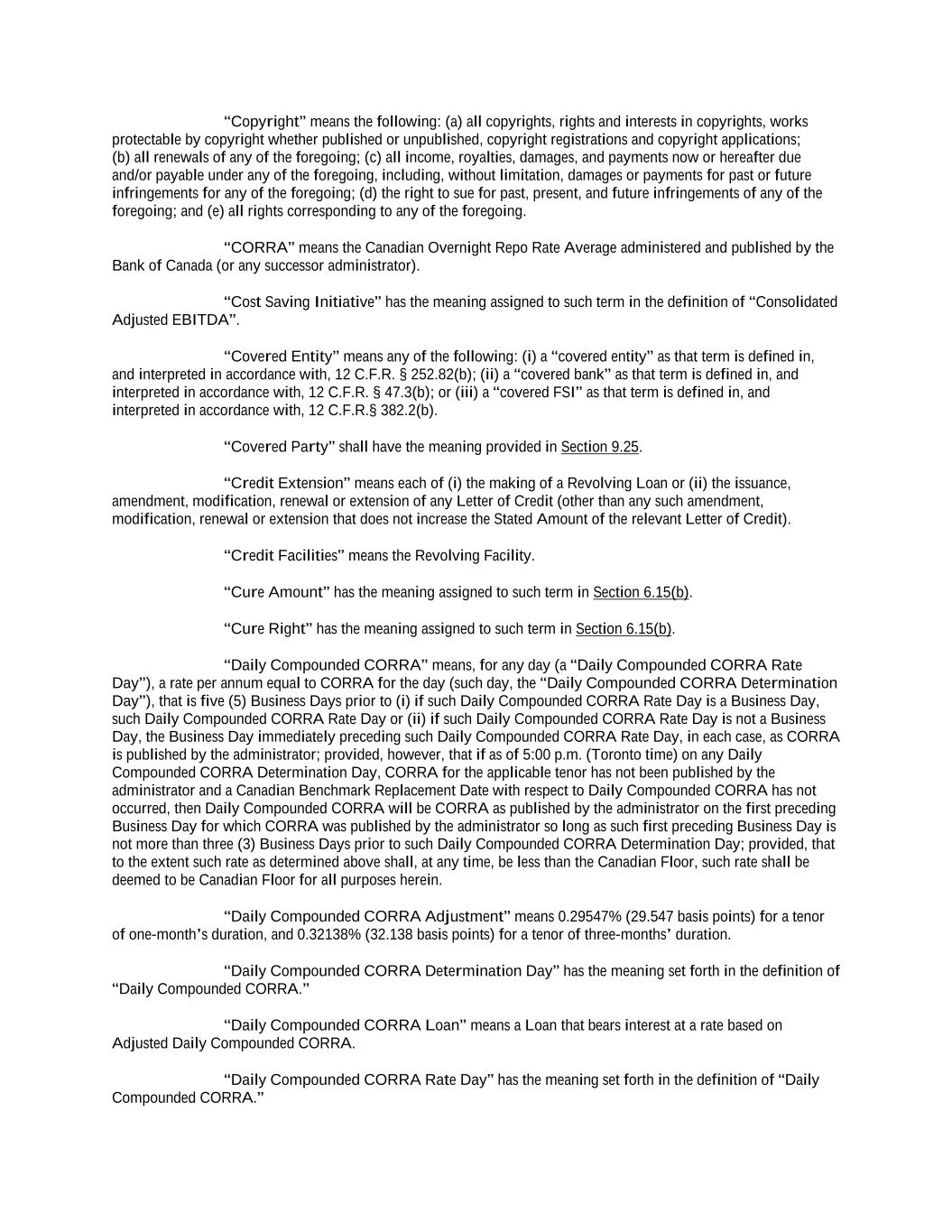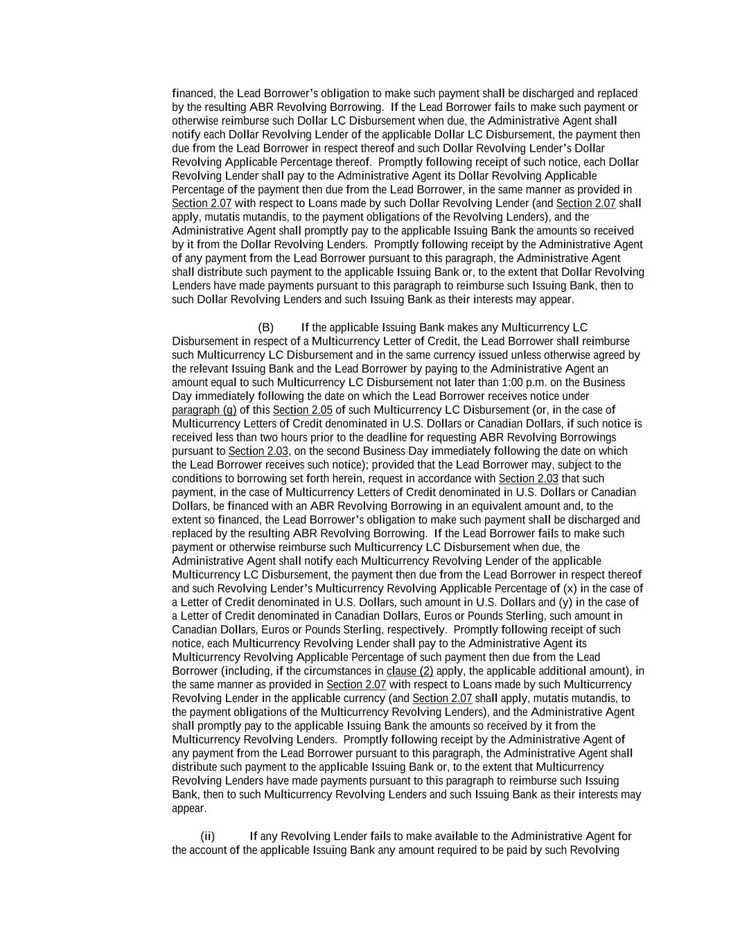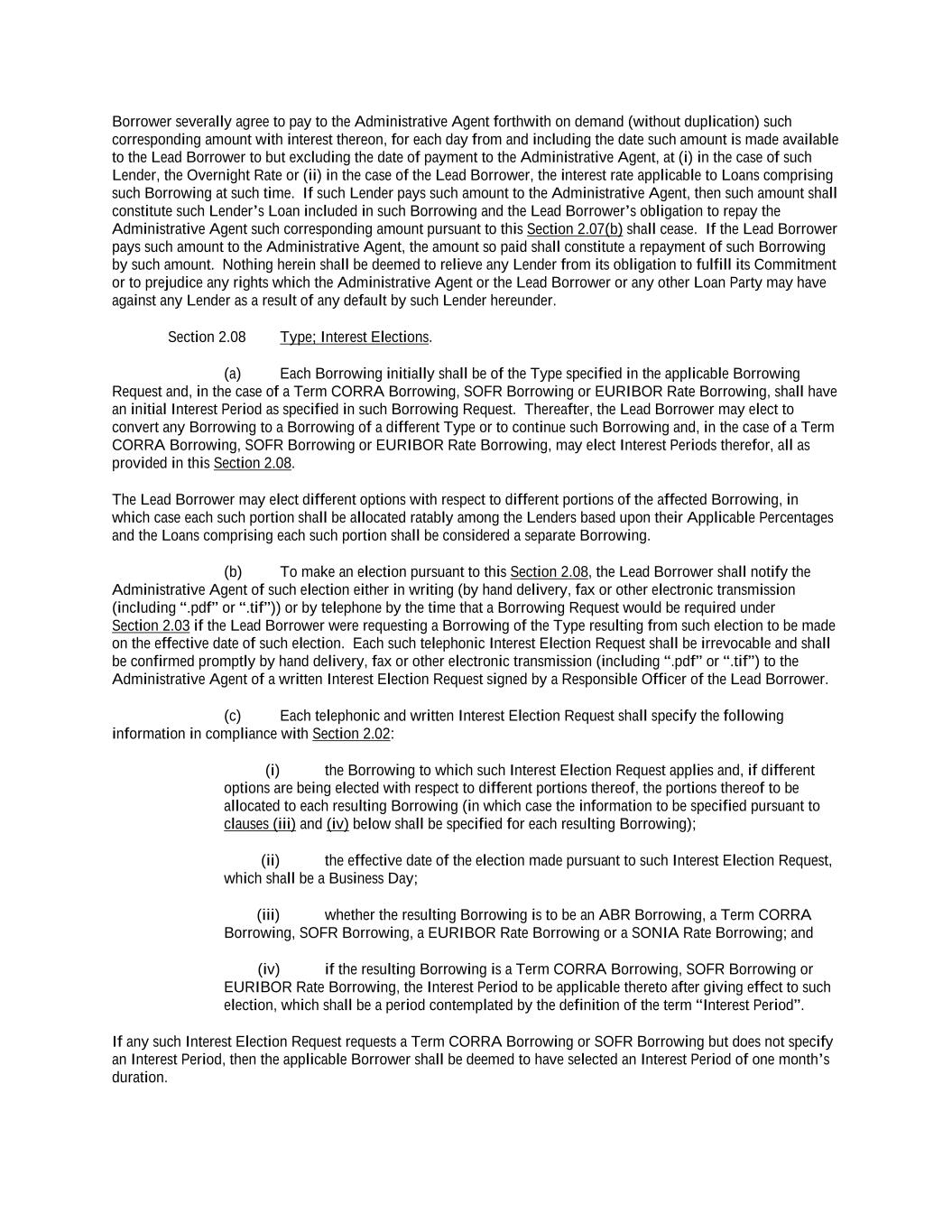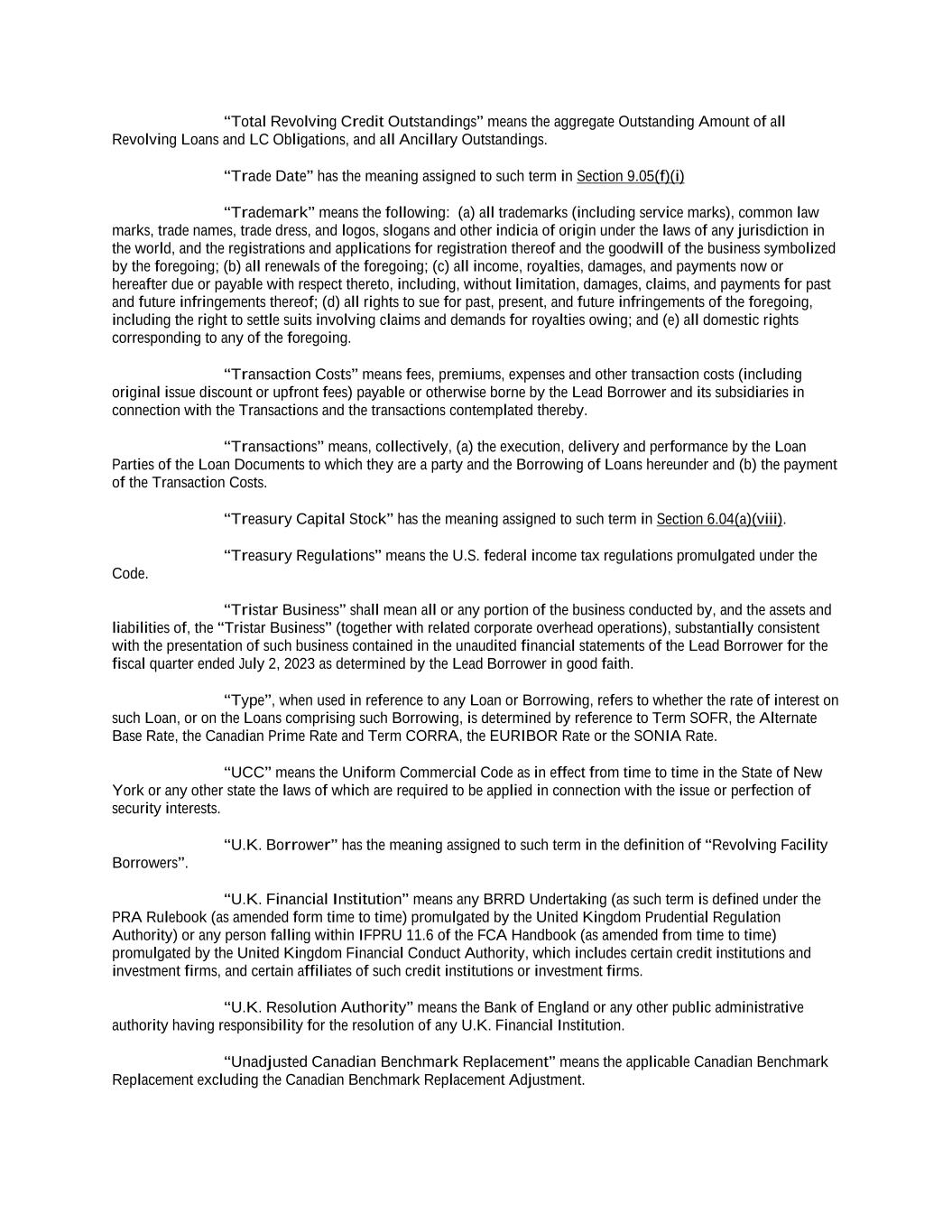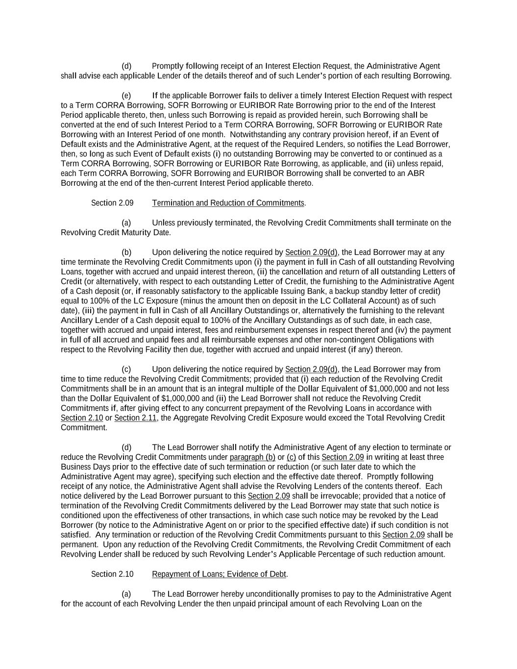 into an agreement that will include customary collateral allocation mechanism sharing provisions between such Non-U.S. Facility and the U.S. Credit Facilities that will be automatically triggered upon the occurrence of an event of default resulting from (i) bankruptcy, insolvency proceedings, etc., (ii) inability to pay debts, attachment, etc., (iii) payment default on final maturity or (iv) an acceleration of the loans or commitments under such Non-U.S. Facility; provided, further, to the extent (x) that any portion of such Non-U.S. Facility is made available in a currency other than U.S. Dollars or (y) any portion of the Revolving Facility, Incremental Revolving Facility or Revolving Facility incurred pursuant to a Refinancing Amendment may be funded in currency other than U.S. Dollars, the customary collateral allocation mechanism settlement currency will be U.S. Dollars pursuant to which Outstanding Amounts denominated in a currency other than U.S. Dollars of any Borrower will convert into, and continue as, U.S. Dollar-denominated Obligations. “Borrowing” means any Loans of the same Type and Class made, converted or continued on the same date and, in the case of Term CORRA Loans, SOFR Loans or EURIBOR Rate Revolving Loans, as to which a single Interest Period is in effect. “Borrowing Request” means a request by a Borrower for a Borrowing in accordance with Section 2.03 and substantially in the form attached hereto as Exhibit B or such other form that is reasonably acceptable to the Administrative Agent and the Lead Borrower. “Business Day” means any day that is not a Saturday, Sunday or other day on which commercial banks in New York City are authorized or required by law to remain closed; provided that, (a) when used in connection with an ABR Loan or any other Loan in an Agreed Currency, the term “Business Day” shall also exclude any day on which banks are not open for dealings in the London interbank market and/or the principal financial center of the country of such Agreed Currency (and, if the Borrowings or LC Disbursements which are the subject of a borrowing, drawing, payment, reimbursement or rate selection are denominated in Euros, the term “Business Day” shall also exclude any non-TARGET Day), (b) when used in connection with a SONIA Rate Revolving Loan, any day excluding any day which is a day on which commercial banks are authorized or required to close in London, (c) when used in connection with a Canadian Dollar Loan or a Canadian Prime Rate Loan, any day on which chartered banks are open for over-the-counter business in Toronto, Ontario, and excludes Saturday, Sunday and any other day which is a statutory holiday in Toronto, Ontario, and (d) when used in connection with a SOFR Loan, or any other calculation or determination involving SOFR, the term “Business Day” means any day that is only a U.S. Government Securities Business Day. “Canadian Sanctions and Anti-Terrorism Laws” means (i) any Canadian law, judgment, order, executive order, decree, ordinance, rule or regulation related to terrorism financing or money laundering including Part II.1 of the Criminal Code, R.S.C. 1985, c.C-46, the Proceeds of Crime (Money Laundering) and Terrorist Financing Act, S.C. 2000, c. 17, regulations promulgated pursuant to the Special Economic Measures Act, S.C. 1992, c. 17 and the United Nations Act, R.S.C. 1985, c. U-2, in each case, as amended and (ii) any economic or financial sanctions or requirements imposed, administered or enforced by the Government of Canada. “Canadian Benchmark” initially, the Term CORRA Reference Rate; provided that if a Canadian Benchmark Transition Event has occurred with respect to the Term CORRA Reference Rate, or the then-current Canadian Benchmark, then “Canadian Benchmark” means the applicable Canadian Benchmark Replacement to the extent that such Canadian Benchmark Replacement has replaced such prior benchmark rate pursuant to Section 2.28(a). “Canadian Benchmark Replacement” means, with respect to any Canadian Benchmark Transition Event, (a) where a Canadian Benchmark Transition Event has occurred with respect to Term CORRA Reference Rate, Adjusted Daily Compounded CORRA; and (b) where a Canadian Benchmark Transition Event has occurred with respect to a Canadian Benchmark other than the Term CORRA Reference Rate, the sum of: (i) the alternate benchmark rate that has been selected by the Administrative Agent and the Borrower giving due consideration to (A) any selection or recommendation of a replacement benchmark rate or the mechanism for determining such a rate by the Relevant