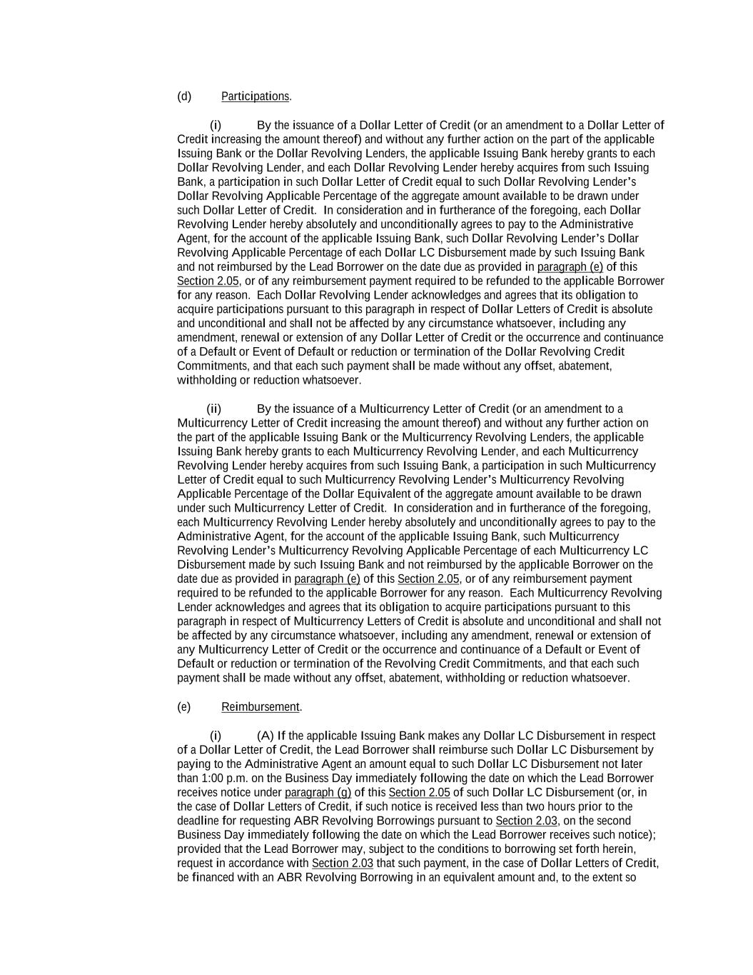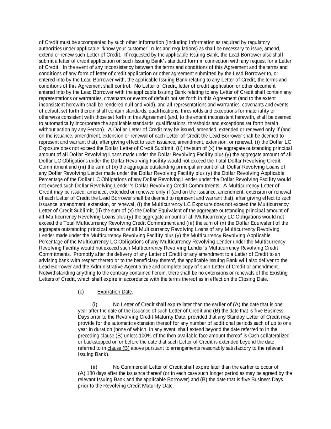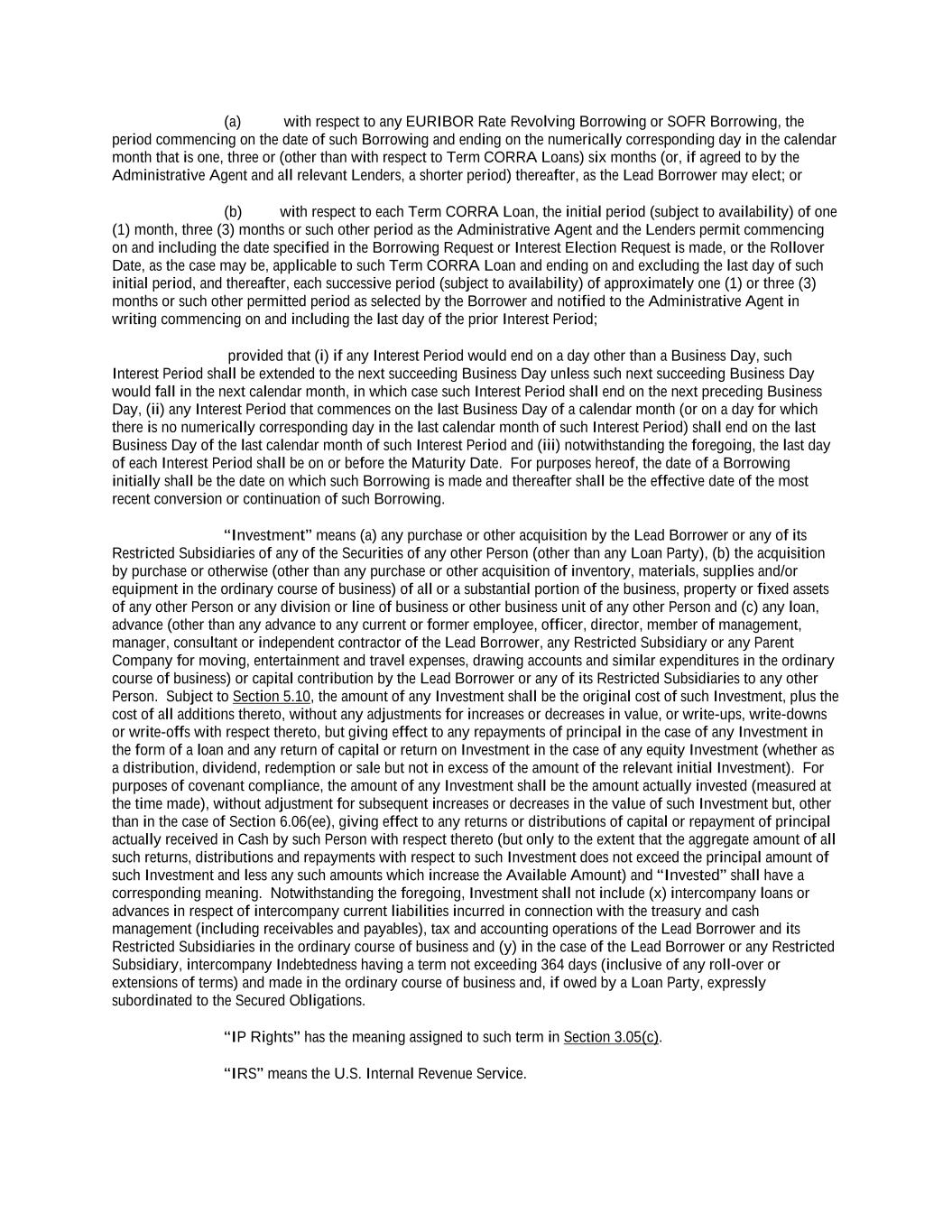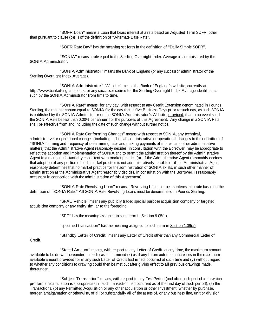 into an agreement that will include customary collateral allocation mechanism sharing provisions between such Non-U.S. Facility and the U.S. Credit Facilities that will be automatically triggered upon the occurrence of an event of default resulting from (i) bankruptcy, insolvency proceedings, etc., (ii) inability to pay debts, attachment, etc., (iii) payment default on final maturity or (iv) an acceleration of the loans or commitments under such Non-U.S. Facility; provided, further, to the extent (x) that any portion of such Non-U.S. Facility is made available in a currency other than U.S. Dollars or (y) any portion of the Revolving Facility, Incremental Revolving Facility or Revolving Facility incurred pursuant to a Refinancing Amendment may be funded in currency other than U.S. Dollars, the customary collateral allocation mechanism settlement currency will be U.S. Dollars pursuant to which Outstanding Amounts denominated in a currency other than U.S. Dollars of any Borrower will convert into, and continue as, U.S. Dollar-denominated Obligations. “Borrowing” means any Loans of the same Type and Class made, converted or continued on the same date and, in the case of Term CORRA Loans, SOFR Loans or EURIBOR Rate Revolving Loans, as to which a single Interest Period is in effect. “Borrowing Request” means a request by a Borrower for a Borrowing in accordance with Section 2.03 and substantially in the form attached hereto as Exhibit B or such other form that is reasonably acceptable to the Administrative Agent and the Lead Borrower. “Business Day” means any day that is not a Saturday, Sunday or other day on which commercial banks in New York City are authorized or required by law to remain closed; provided that, (a) when used in connection with an ABR Loan or any other Loan in an Agreed Currency, the term “Business Day” shall also exclude any day on which banks are not open for dealings in the London interbank market and/or the principal financial center of the country of such Agreed Currency (and, if the Borrowings or LC Disbursements which are the subject of a borrowing, drawing, payment, reimbursement or rate selection are denominated in Euros, the term “Business Day” shall also exclude any non-TARGET Day), (b) when used in connection with a SONIA Rate Revolving Loan, any day excluding any day which is a day on which commercial banks are authorized or required to close in London, (c) when used in connection with a Canadian Dollar Loan or a Canadian Prime Rate Loan, any day on which chartered banks are open for over-the-counter business in Toronto, Ontario, and excludes Saturday, Sunday and any other day which is a statutory holiday in Toronto, Ontario, and (d) when used in connection with a SOFR Loan, or any other calculation or determination involving SOFR, the term “Business Day” means any day that is only a U.S. Government Securities Business Day. “Canadian Sanctions and Anti-Terrorism Laws” means (i) any Canadian law, judgment, order, executive order, decree, ordinance, rule or regulation related to terrorism financing or money laundering including Part II.1 of the Criminal Code, R.S.C. 1985, c.C-46, the Proceeds of Crime (Money Laundering) and Terrorist Financing Act, S.C. 2000, c. 17, regulations promulgated pursuant to the Special Economic Measures Act, S.C. 1992, c. 17 and the United Nations Act, R.S.C. 1985, c. U-2, in each case, as amended and (ii) any economic or financial sanctions or requirements imposed, administered or enforced by the Government of Canada. “Canadian Benchmark” initially, the Term CORRA Reference Rate; provided that if a Canadian Benchmark Transition Event has occurred with respect to the Term CORRA Reference Rate, or the then-current Canadian Benchmark, then “Canadian Benchmark” means the applicable Canadian Benchmark Replacement to the extent that such Canadian Benchmark Replacement has replaced such prior benchmark rate pursuant to Section 2.28(a). “Canadian Benchmark Replacement” means, with respect to any Canadian Benchmark Transition Event, (a) where a Canadian Benchmark Transition Event has occurred with respect to Term CORRA Reference Rate, Adjusted Daily Compounded CORRA; and (b) where a Canadian Benchmark Transition Event has occurred with respect to a Canadian Benchmark other than the Term CORRA Reference Rate, the sum of: (i) the alternate benchmark rate that has been selected by the Administrative Agent and the Borrower giving due consideration to (A) any selection or recommendation of a replacement benchmark rate or the mechanism for determining such a rate by the Relevant