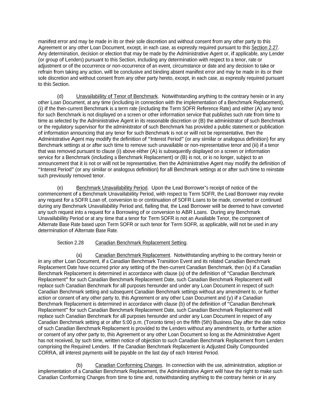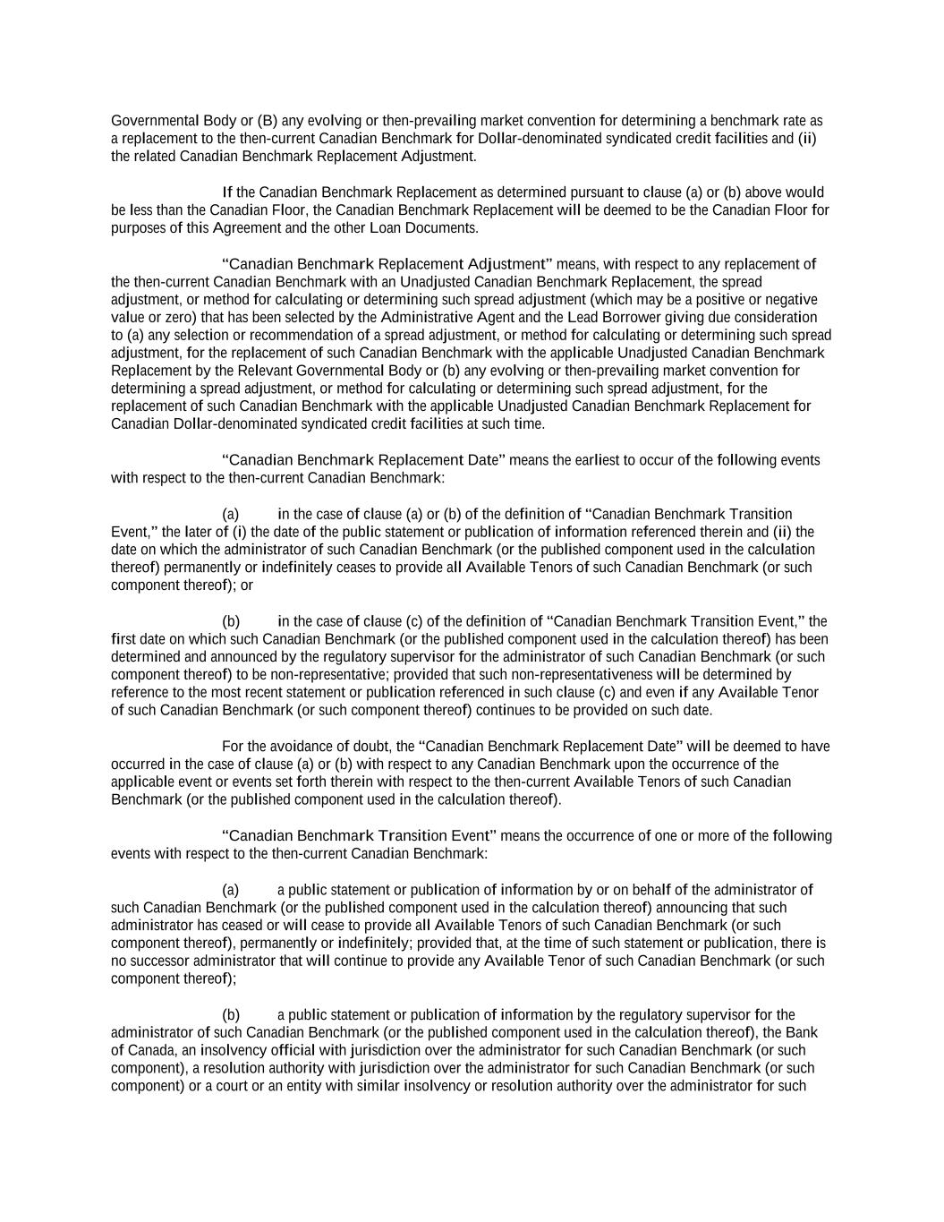 Governmental Body or (B) any evolving or then-prevailing market convention for determining a benchmark rate as a replacement to the then-current Canadian Benchmark for Dollar-denominated syndicated credit facilities and (ii) the related Canadian Benchmark Replacement Adjustment. If the Canadian Benchmark Replacement as determined pursuant to clause (a) or (b) above would be less than the Canadian Floor, the Canadian Benchmark Replacement will be deemed to be the Canadian Floor for purposes of this Agreement and the other Loan Documents. “Canadian Benchmark Replacement Adjustment” means, with respect to any replacement of the then-current Canadian Benchmark with an Unadjusted Canadian Benchmark Replacement, the spread adjustment, or method for calculating or determining such spread adjustment (which may be a positive or negative value or zero) that has been selected by the Administrative Agent and the Lead Borrower giving due consideration to (a) any selection or recommendation of a spread adjustment, or method for calculating or determining such spread adjustment, for the replacement of such Canadian Benchmark with the applicable Unadjusted Canadian Benchmark Replacement by the Relevant Governmental Body or (b) any evolving or then-prevailing market convention for determining a spread adjustment, or method for calculating or determining such spread adjustment, for the replacement of such Canadian Benchmark with the applicable Unadjusted Canadian Benchmark Replacement for Canadian Dollar-denominated syndicated credit facilities at such time. “Canadian Benchmark Replacement Date” means the earliest to occur of the following events with respect to the then-current Canadian Benchmark: (a) in the case of clause (a) or (b) of the definition of “Canadian Benchmark Transition Event,” the later of (i) the date of the public statement or publication of information referenced therein and (ii) the date on which the administrator of such Canadian Benchmark (or the published component used in the calculation thereof) permanently or indefinitely ceases to provide all Available Tenors of such Canadian Benchmark (or such component thereof); or (b) in the case of clause (c) of the definition of “Canadian Benchmark Transition Event,” the first date on which such Canadian Benchmark (or the published component used in the calculation thereof) has been determined and announced by the regulatory supervisor for the administrator of such Canadian Benchmark (or such component thereof) to be non-representative; provided that such non-representativeness will be determined by reference to the most recent statement or publication referenced in such clause (c) and even if any Available Tenor of such Canadian Benchmark (or such component thereof) continues to be provided on such date. For the avoidance of doubt, the “Canadian Benchmark Replacement Date” will be deemed to have occurred in the case of clause (a) or (b) with respect to any Canadian Benchmark upon the occurrence of the applicable event or events set forth therein with respect to the then-current Available Tenors of such Canadian Benchmark (or the published component used in the calculation thereof). “Canadian Benchmark Transition Event” means the occurrence of one or more of the following events with respect to the then-current Canadian Benchmark: (a) a public statement or publication of information by or on behalf of the administrator of such Canadian Benchmark (or the published component used in the calculation thereof) announcing that such administrator has ceased or will cease to provide all Available Tenors of such Canadian Benchmark (or such component thereof), permanently or indefinitely; provided that, at the time of such statement or publication, there is no successor administrator that will continue to provide any Available Tenor of such Canadian Benchmark (or such component thereof); (b) a public statement or publication of information by the regulatory supervisor for the administrator of such Canadian Benchmark (or the published component used in the calculation thereof), the Bank of Canada, an insolvency official with jurisdiction over the administrator for such Canadian Benchmark (or such component), a resolution authority with jurisdiction over the administrator for such Canadian Benchmark (or such component) or a court or an entity with similar insolvency or resolution authority over the administrator for such