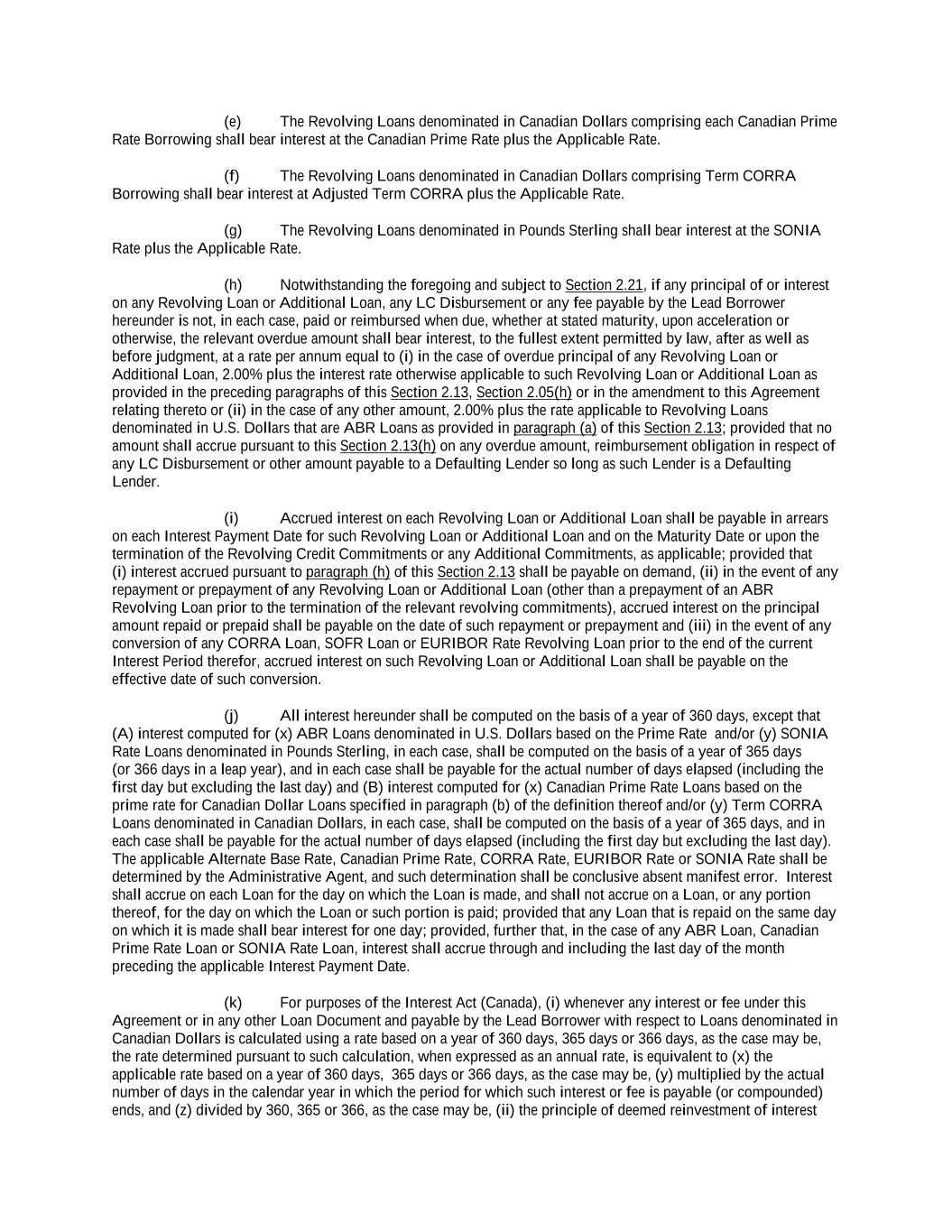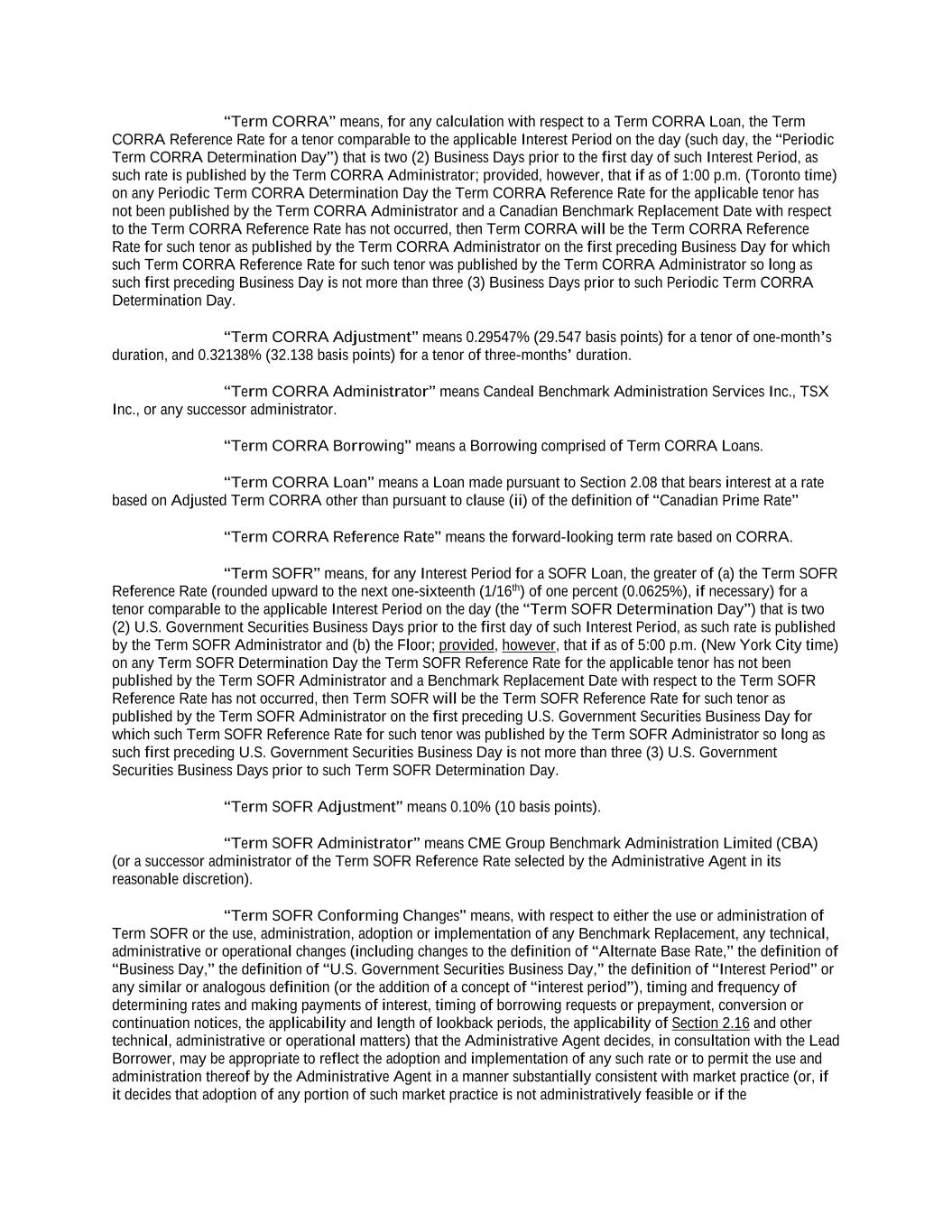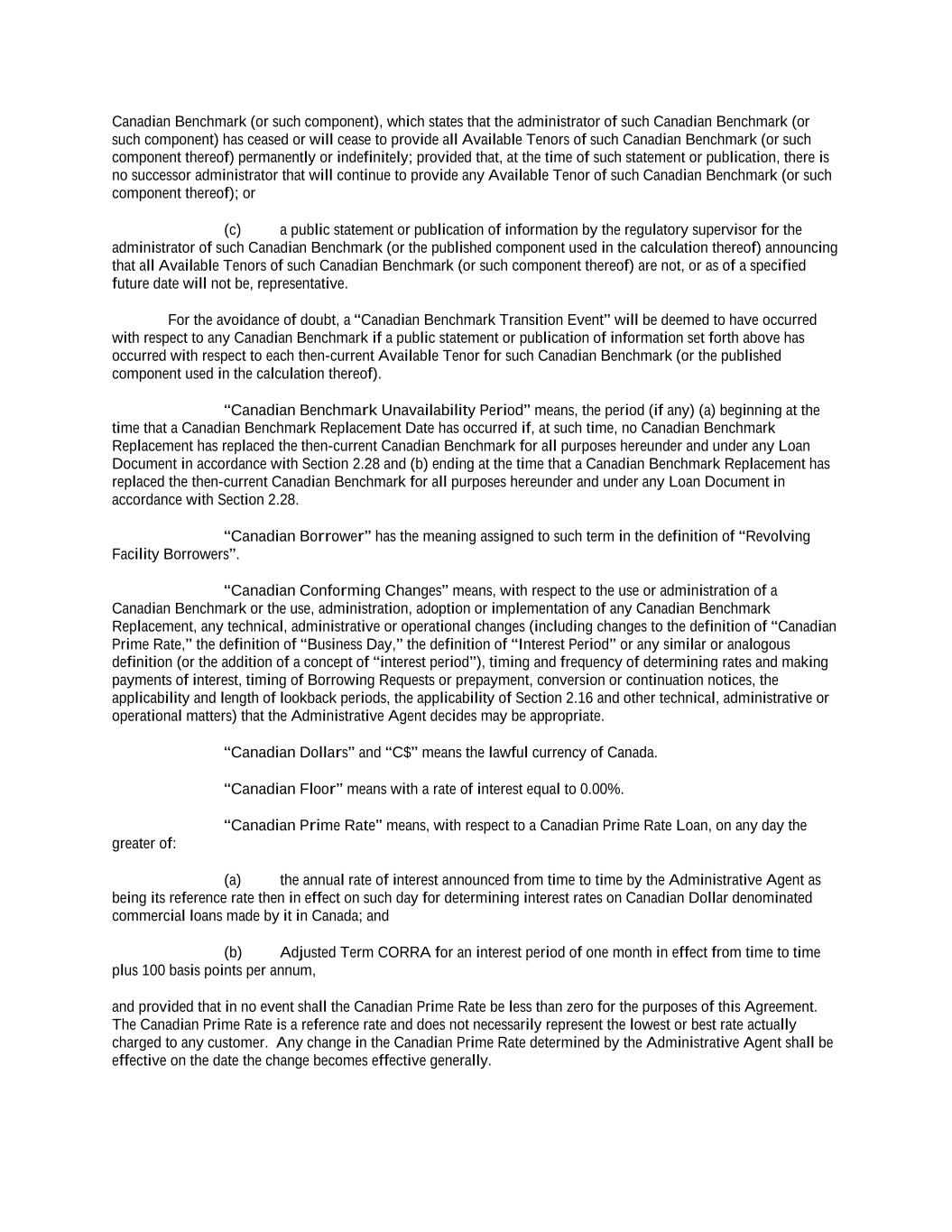 Canadian Benchmark (or such component), which states that the administrator of such Canadian Benchmark (or such component) has ceased or will cease to provide all Available Tenors of such Canadian Benchmark (or such component thereof) permanently or indefinitely; provided that, at the time of such statement or publication, there is no successor administrator that will continue to provide any Available Tenor of such Canadian Benchmark (or such component thereof); or (c) a public statement or publication of information by the regulatory supervisor for the administrator of such Canadian Benchmark (or the published component used in the calculation thereof) announcing that all Available Tenors of such Canadian Benchmark (or such component thereof) are not, or as of a specified future date will not be, representative. For the avoidance of doubt, a “Canadian Benchmark Transition Event” will be deemed to have occurred with respect to any Canadian Benchmark if a public statement or publication of information set forth above has occurred with respect to each then-current Available Tenor for such Canadian Benchmark (or the published component used in the calculation thereof). “Canadian Benchmark Unavailability Period” means, the period (if any) (a) beginning at the time that a Canadian Benchmark Replacement Date has occurred if, at such time, no Canadian Benchmark Replacement has replaced the then-current Canadian Benchmark for all purposes hereunder and under any Loan Document in accordance with Section 2.28 and (b) ending at the time that a Canadian Benchmark Replacement has replaced the then-current Canadian Benchmark for all purposes hereunder and under any Loan Document in accordance with Section 2.28. “Canadian Borrower” has the meaning assigned to such term in the definition of “Revolving Facility Borrowers”. “Canadian Conforming Changes” means, with respect to the use or administration of a Canadian Benchmark or the use, administration, adoption or implementation of any Canadian Benchmark Replacement, any technical, administrative or operational changes (including changes to the definition of “Canadian Prime Rate,” the definition of “Business Day,” the definition of “Interest Period” or any similar or analogous definition (or the addition of a concept of “interest period”), timing and frequency of determining rates and making payments of interest, timing of Borrowing Requests or prepayment, conversion or continuation notices, the applicability and length of lookback periods, the applicability of Section 2.16 and other technical, administrative or operational matters) that the Administrative Agent decides may be appropriate. “Canadian Dollars” and “C$” means the lawful currency of Canada. “Canadian Floor” means with a rate of interest equal to 0.00%. “Canadian Prime Rate” means, with respect to a Canadian Prime Rate Loan, on any day the greater of: (a) the annual rate of interest announced from time to time by the Administrative Agent as being its reference rate then in effect on such day for determining interest rates on Canadian Dollar denominated commercial loans made by it in Canada; and (b) Adjusted Term CORRA for an interest period of one month in effect from time to time plus 100 basis points per annum, and provided that in no event shall the Canadian Prime Rate be less than zero for the purposes of this Agreement. The Canadian Prime Rate is a reference rate and does not necessarily represent the lowest or best rate actually charged to any customer. Any change in the Canadian Prime Rate determined by the Administrative Agent shall be effective on the date the change becomes effective generally.