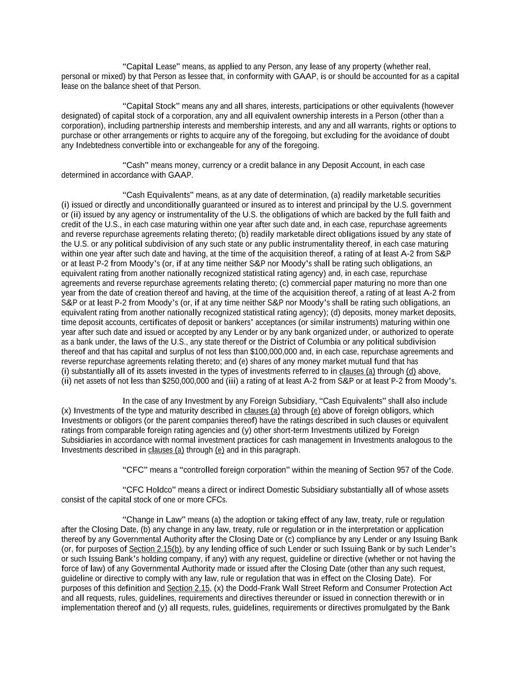 “Capital Lease” means, as applied to any Person, any lease of any property (whether real, personal or mixed) by that Person as lessee that, in conformity with GAAP, is or should be accounted for as a capital lease on the balance sheet of that Person. “Capital Stock” means any and all shares, interests, participations or other equivalents (however designated) of capital stock of a corporation, any and all equivalent ownership interests in a Person (other than a corporation), including partnership interests and membership interests, and any and all warrants, rights or options to purchase or other arrangements or rights to acquire any of the foregoing, but excluding for the avoidance of doubt any Indebtedness convertible into or exchangeable for any of the foregoing. “Cash” means money, currency or a credit balance in any Deposit Account, in each case determined in accordance with GAAP. “Cash Equivalents” means, as at any date of determination, (a) readily marketable securities (i) issued or directly and unconditionally guaranteed or insured as to interest and principal by the U.S. government or (ii) issued by any agency or instrumentality of the U.S. the obligations of which are backed by the full faith and credit of the U.S., in each case maturing within one year after such date and, in each case, repurchase agreements and reverse repurchase agreements relating thereto; (b) readily marketable direct obligations issued by any state of the U.S. or any political subdivision of any such state or any public instrumentality thereof, in each case maturing within one year after such date and having, at the time of the acquisition thereof, a rating of at least A-2 from S&P or at least P-2 from Moody’s (or, if at any time neither S&P nor Moody’s shall be rating such obligations, an equivalent rating from another nationally recognized statistical rating agency) and, in each case, repurchase agreements and reverse repurchase agreements relating thereto; (c) commercial paper maturing no more than one year from the date of creation thereof and having, at the time of the acquisition thereof, a rating of at least A-2 from S&P or at least P-2 from Moody’s (or, if at any time neither S&P nor Moody’s shall be rating such obligations, an equivalent rating from another nationally recognized statistical rating agency); (d) deposits, money market deposits, time deposit accounts, certificates of deposit or bankers’ acceptances (or similar instruments) maturing within one year after such date and issued or accepted by any Lender or by any bank organized under, or authorized to operate as a bank under, the laws of the U.S., any state thereof or the District of Columbia or any political subdivision thereof and that has capital and surplus of not less than $100,000,000 and, in each case, repurchase agreements and reverse repurchase agreements relating thereto; and (e) shares of any money market mutual fund that has (i) substantially all of its assets invested in the types of investments referred to in clauses (a) through (d) above, (ii) net assets of not less than $250,000,000 and (iii) a rating of at least A-2 from S&P or at least P-2 from Moody’s. In the case of any Investment by any Foreign Subsidiary, “Cash Equivalents” shall also include (x) Investments of the type and maturity described in clauses (a) through (e) above of foreign obligors, which Investments or obligors (or the parent companies thereof) have the ratings described in such clauses or equivalent ratings from comparable foreign rating agencies and (y) other short-term Investments utilized by Foreign Subsidiaries in accordance with normal investment practices for cash management in Investments analogous to the Investments described in clauses (a) through (e) and in this paragraph. “CFC” means a “controlled foreign corporation” within the meaning of Section 957 of the Code. “CFC Holdco” means a direct or indirect Domestic Subsidiary substantially all of whose assets consist of the capital stock of one or more CFCs. “Change in Law” means (a) the adoption or taking effect of any law, treaty, rule or regulation after the Closing Date, (b) any change in any law, treaty, rule or regulation or in the interpretation or application thereof by any Governmental Authority after the Closing Date or (c) compliance by any Lender or any Issuing Bank (or, for purposes of Section 2.15(b), by any lending office of such Lender or such Issuing Bank or by such Lender’s or such Issuing Bank’s holding company, if any) with any request, guideline or directive (whether or not having the force of law) of any Governmental Authority made or issued after the Closing Date (other than any such request, guideline or directive to comply with any law, rule or regulation that was in effect on the Closing Date). For purposes of this definition and Section 2.15, (x) the Dodd-Frank Wall Street Reform and Consumer Protection Act and all requests, rules, guidelines, requirements and directives thereunder or issued in connection therewith or in implementation thereof and (y) all requests, rules, guidelines, requirements or directives promulgated by the Bank