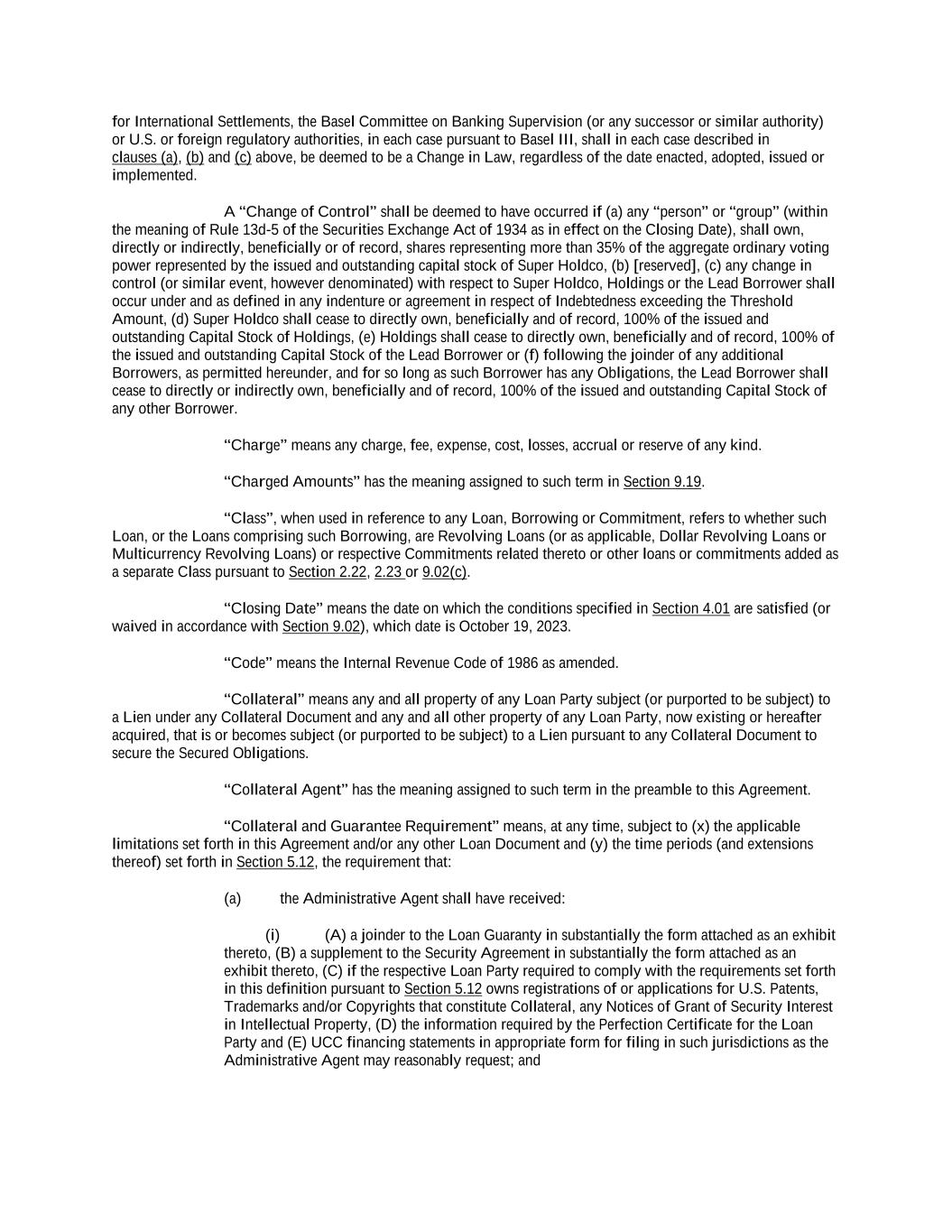 for International Settlements, the Basel Committee on Banking Supervision (or any successor or similar authority) or U.S. or foreign regulatory authorities, in each case pursuant to Basel III, shall in each case described in clauses (a), (b) and (c) above, be deemed to be a Change in Law, regardless of the date enacted, adopted, issued or implemented. A “Change of Control” shall be deemed to have occurred if (a) any “person” or “group” (within the meaning of Rule 13d-5 of the Securities Exchange Act of 1934 as in effect on the Closing Date), shall own, directly or indirectly, beneficially or of record, shares representing more than 35% of the aggregate ordinary voting power represented by the issued and outstanding capital stock of Super Holdco, (b) [reserved], (c) any change in control (or similar event, however denominated) with respect to Super Holdco, Holdings or the Lead Borrower shall occur under and as defined in any indenture or agreement in respect of Indebtedness exceeding the Threshold Amount, (d) Super Holdco shall cease to directly own, beneficially and of record, 100% of the issued and outstanding Capital Stock of Holdings, (e) Holdings shall cease to directly own, beneficially and of record, 100% of the issued and outstanding Capital Stock of the Lead Borrower or (f) following the joinder of any additional Borrowers, as permitted hereunder, and for so long as such Borrower has any Obligations, the Lead Borrower shall cease to directly or indirectly own, beneficially and of record, 100% of the issued and outstanding Capital Stock of any other Borrower. “Charge” means any charge, fee, expense, cost, losses, accrual or reserve of any kind. “Charged Amounts” has the meaning assigned to such term in Section 9.19. “Class”, when used in reference to any Loan, Borrowing or Commitment, refers to whether such Loan, or the Loans comprising such Borrowing, are Revolving Loans (or as applicable, Dollar Revolving Loans or Multicurrency Revolving Loans) or respective Commitments related thereto or other loans or commitments added as a separate Class pursuant to Section 2.22, 2.23 or 9.02(c). “Closing Date” means the date on which the conditions specified in Section 4.01 are satisfied (or waived in accordance with Section 9.02), which date is October 19, 2023. “Code” means the Internal Revenue Code of 1986 as amended. “Collateral” means any and all property of any Loan Party subject (or purported to be subject) to a Lien under any Collateral Document and any and all other property of any Loan Party, now existing or hereafter acquired, that is or becomes subject (or purported to be subject) to a Lien pursuant to any Collateral Document to secure the Secured Obligations. “Collateral Agent” has the meaning assigned to such term in the preamble to this Agreement. “Collateral and Guarantee Requirement” means, at any time, subject to (x) the applicable limitations set forth in this Agreement and/or any other Loan Document and (y) the time periods (and extensions thereof) set forth in Section 5.12, the requirement that: (a) the Administrative Agent shall have received: (i) (A) a joinder to the Loan Guaranty in substantially the form attached as an exhibit thereto, (B) a supplement to the Security Agreement in substantially the form attached as an exhibit thereto, (C) if the respective Loan Party required to comply with the requirements set forth in this definition pursuant to Section 5.12 owns registrations of or applications for U.S. Patents, Trademarks and/or Copyrights that constitute Collateral, any Notices of Grant of Security Interest in Intellectual Property, (D) the information required by the Perfection Certificate for the Loan Party and (E) UCC financing statements in appropriate form for filing in such jurisdictions as the Administrative Agent may reasonably request; and