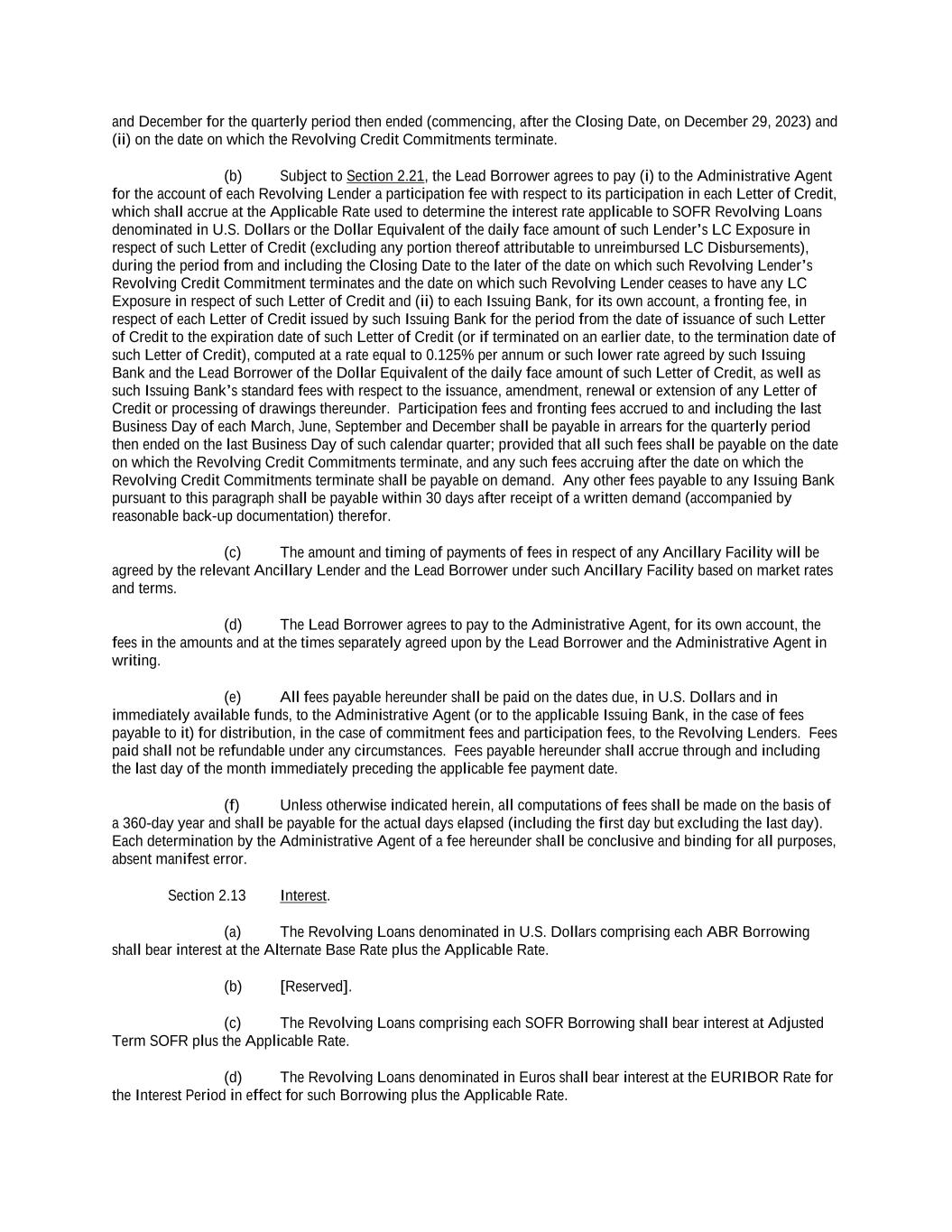 All outstanding amounts under the U.S. dollar tranche (if funded in U.S. dollars) will bear interest, at the option of the Company, at a rate per annum equal to (x) Term SOFR (as defined in the Credit Agreement), plus a margin ranging between 1.00% to 2.00% per annum or (y) the Alternate Base Rate (as defined in the Credit Agreement), plus a margin ranging between 0.00% to 1.00% per annum.