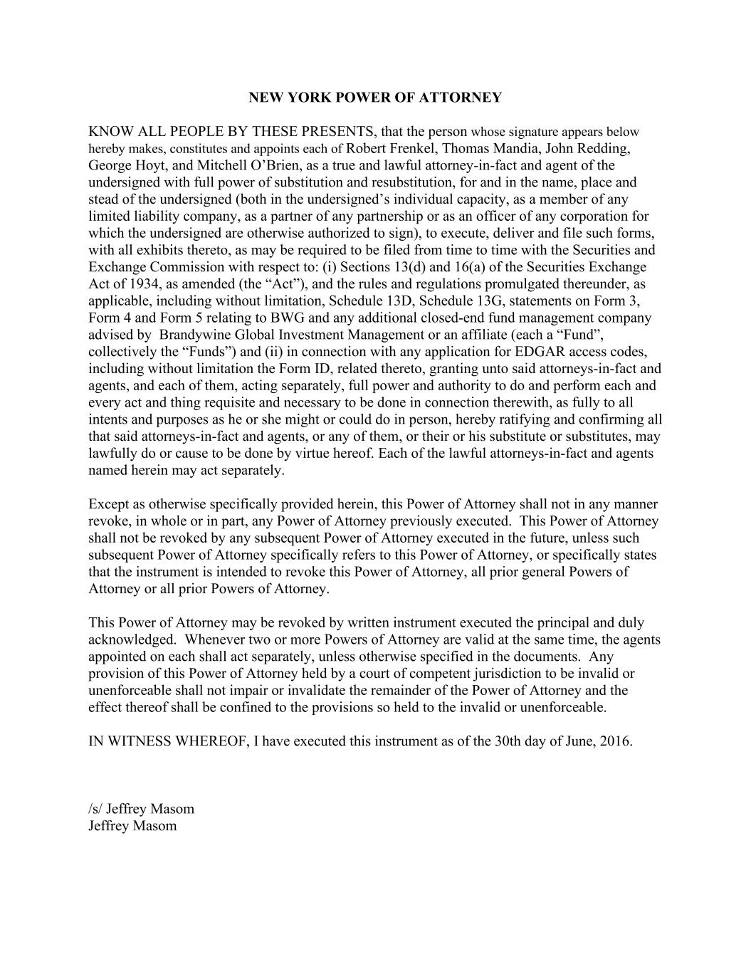 NEW YORK POWER OF ATTORNEY KNOW ALL PEOPLE BY THESE PRESENTS, that the person whose signature appears below hereby makes, constitutes and appoints each of Robert Frenkel, Thomas Mandia, John Redding, George Hoyt, and Mitchell O’Brien, as a true and lawful attorney-in-fact and agent of the undersigned with full power of substitution and resubstitution, for and in the name, place and stead of the undersigned (both in the undersigned’s individual capacity, as a member of any limited liability company, as a partner of any partnership or as an officer of any corporation for which the undersigned are otherwise authorized to sign), to execute, deliver and file such forms, with all exhibits thereto, as may be required to be filed from time to time with the Securities and Exchange Commission with respect to: (i) Sections 13(d) and 16(a) of the Securities Exchange Act of 1934, as amended (the “Act”), and the rules and regulations promulgated thereunder, as applicable, including without limitation, Schedule 13D, Schedule 13G, statements on Form 3, Form 4 and Form 5 relating to BWG and any additional closed-end fund management company advised by Brandywine Global Investment Management or an affiliate (each a “Fund”, collectively the “Funds”) and (ii) in connection with any application for EDGAR access codes, including without limitation the Form ID, related thereto, granting unto said attorneys-in-fact and agents, and each of them, acting separately, full power and authority to do and perform each and every act and thing requisite and necessary to be done in connection therewith, as fully to all intents and purposes as he or she might or could do in person, hereby ratifying and confirming all that said attorneys-in-fact and agents, or any of them, or their or his substitute or substitutes, may lawfully do or cause to be done by virtue hereof. Each of the lawful attorneys-in-fact and agents named herein may act separately. Except as otherwise specifically provided herein, this Power of Attorney shall not in any manner revoke, in whole or in part, any Power of Attorney previously executed. This Power of Attorney shall not be revoked by any subsequent Power of Attorney executed in the future, unless such subsequent Power of Attorney specifically refers to this Power of Attorney, or specifically states that the instrument is intended to revoke this Power of Attorney, all prior general Powers of Attorney or all prior Powers of Attorney. This Power of Attorney may be revoked by written instrument executed the principal and duly acknowledged. Whenever two or more Powers of Attorney are valid at the same time, the agents appointed on each shall act separately, unless otherwise specified in the documents. Any provision of this Power of Attorney held by a court of competent jurisdiction to be invalid or unenforceable shall not impair or invalidate the remainder of the Power of Attorney and the effect thereof shall be confined to the provisions so held to the invalid or unenforceable. IN WITNESS WHEREOF, I have executed this instrument as of the 30th day of June, 2016. /s/ Jeffrey Masom Jeffrey Masom
