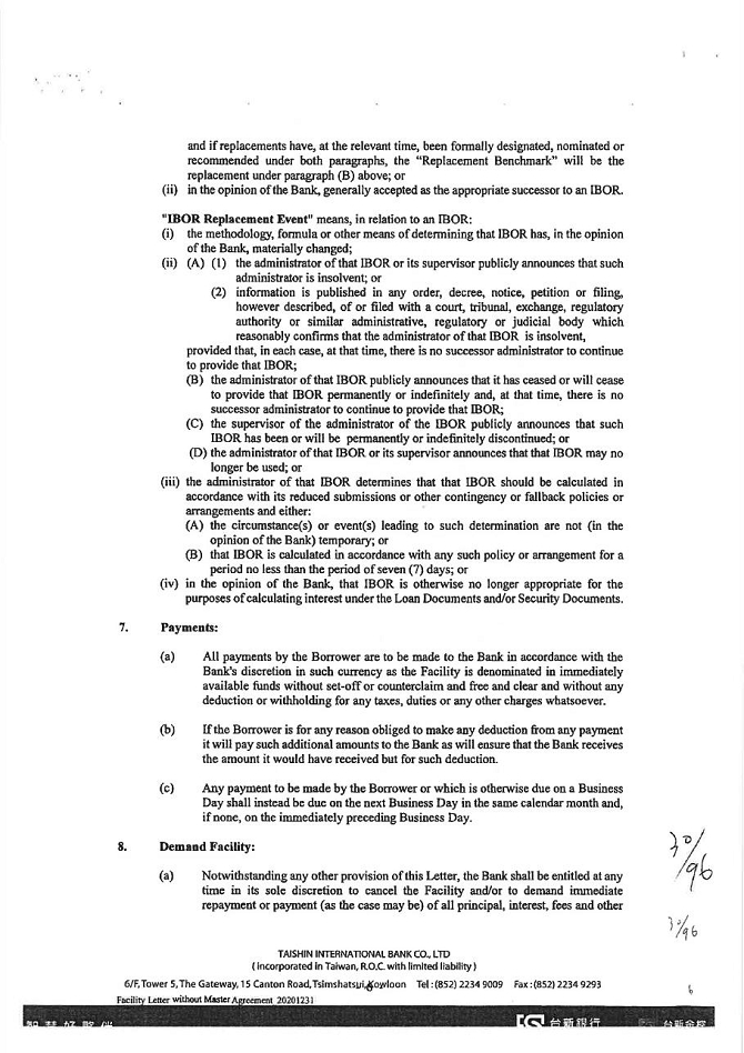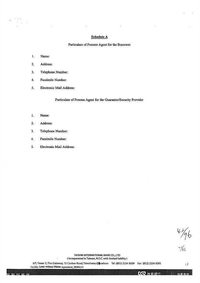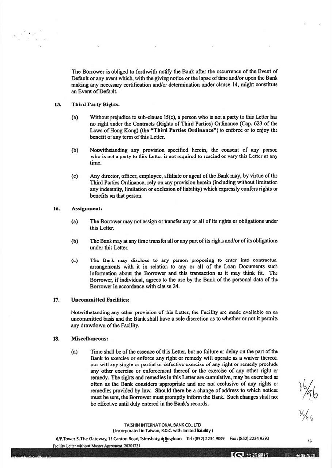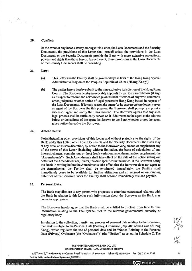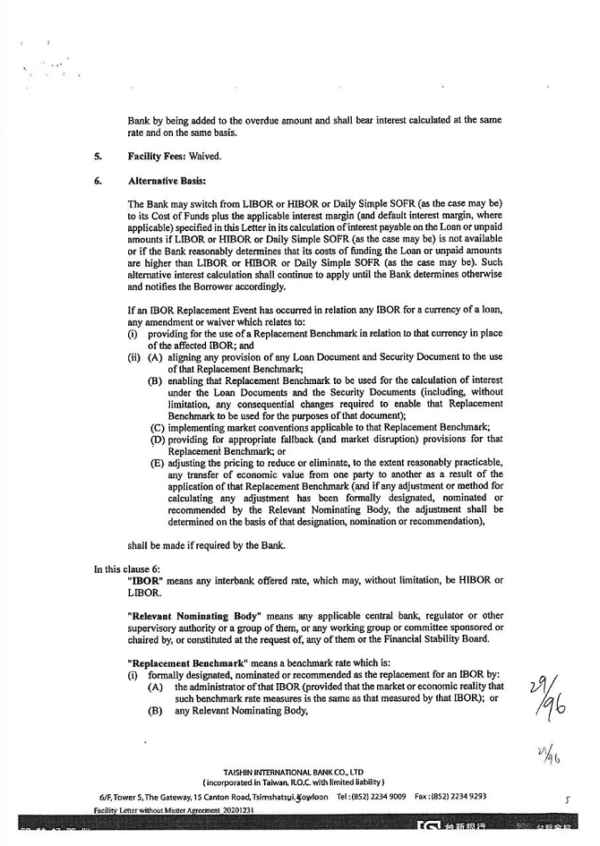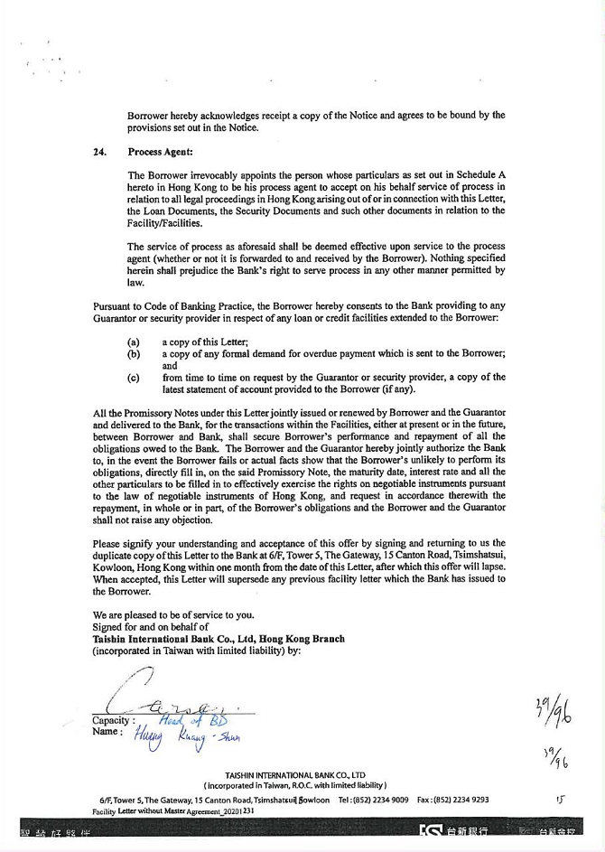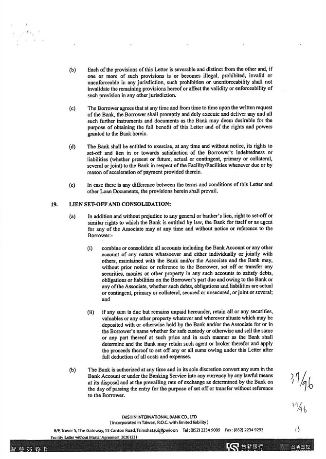 5. To the extent permitted by law, waive all other powers and interests conferred to the guarantor under the Civil Law of the Republic of China.