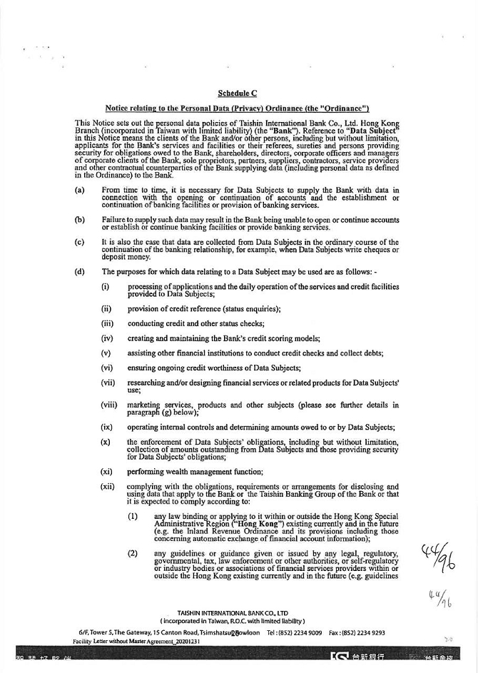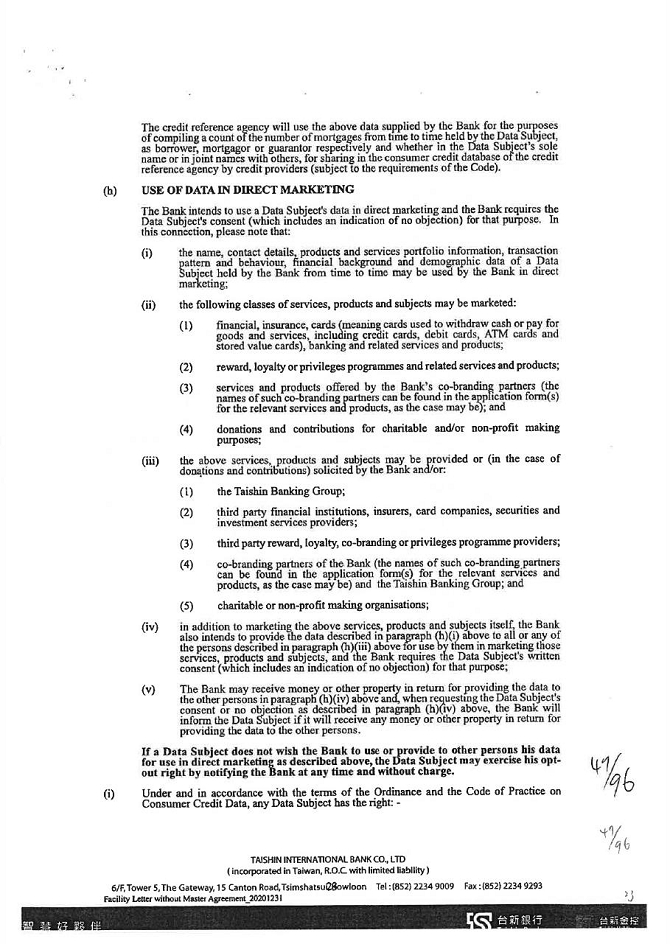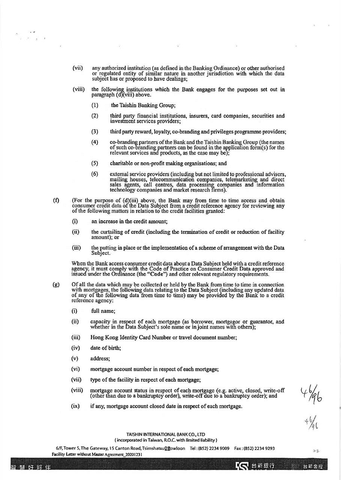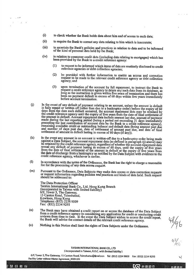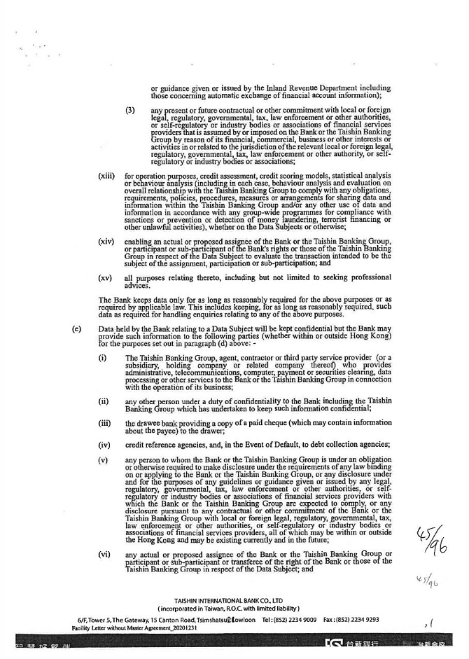 2. The guarantor agrees that KTB shall provide the capital information, credit information, and other personal information (including name, title, date of birth, ID/business registration number, passport number, phone number, website and address etc.) related to guarantor for specific purposes such as understanding the guarantor’s credit information, credit judgment (including records of overdue bills, urgent collection and bad debt) and other information relevant to the contract of guarantee as determined by the KTB business registration project to KTB, interbank financial institutions, consortium financial joint credit investigation center, small and medium-sized enterprise credit guarantee fund, agricultural credit guarantee fund, consortium information co., Ltd., Taiwan clearing house and other designated economic and financial departments to participate in KTB creditor’s rights entrusted to deal with the matter on behalf of KTB or organizations that need a contract for business needs, in the scope of a specific purpose, such as business registration project or charter, to gather, process by computer, international transmission and use of personal data, and formerly revealed agencies to provide personal information to KTB.