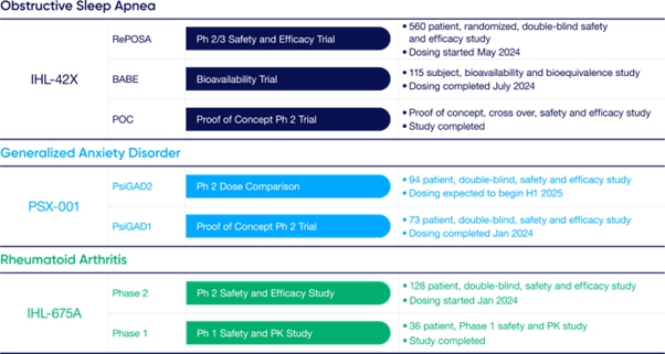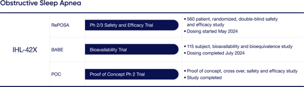 IHL-42X, our drug candidate in a pivotal Phase 2/3 for the treatment of obstructive sleep apnea (“OSA”) is an oral fixed dose combination of dronabinol and acetazolamide designed to act synergistically, targeting two different physiological pathways associated with the intermittent hypoxia and hypercapnia that characterize OSA. In a proof-of-concept Australian Phase 2 clinical trial, we observed that IHL-42X reduced apnea hypopnea index (“AHI") and was well tolerated in OSA patients. The ongoing Phase 2/3 clinical trial further investigates the safety and efficacy of IHL-42X for the treatment of OSA. The Phase 2 portion is being conducted in the United States, and the expanded Phase 3 portion will include the United Kingdom and European Union. We expect to report top-line data from the Phase 2 portion this pivotal U.S. Phase 2/3 clinical trial in the first half of 2025 and to release top-line results from our pharmacokinetic and safety study in 2024.