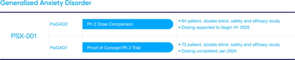 PSX-001, our drug candidate in Phase 2b clinical development, is an oral synthetic psilocybin treatment, administered in combination with psychological therapy for patients with moderate-to-severe generalized anxiety disorder (“GAD”). We completed a proof-of-concept clinical trial, known as PsiGAD1, in the top-line results of which we observed that the combination of synthetic psilocybin with psychotherapy significantly reduced anxiety scores and was well tolerated in GAD patients. We have received clearance of an Investigational New Drug (“IND”) application from the U.S. Food and Drug Administration (“FDA”) to conduct a Phase 2b clinical trial to further investigate the safety and efficacy of PSX-001 for treatment of GAD. We anticipate reporting full data results from PsiGAD1 in the first half of 2025.