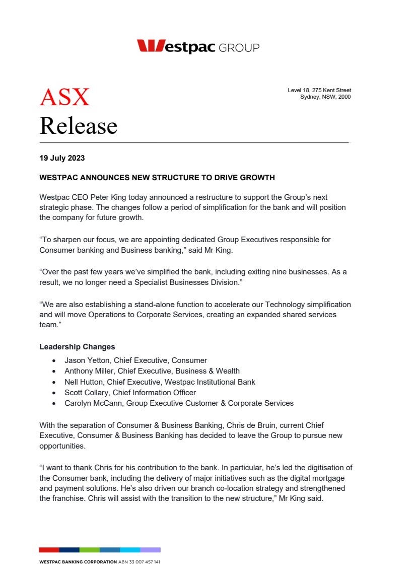 ![]() | ASX Release 19 July 2023 WESTPAC ANNOUNCES NEW STRUCTURE TO DRIVE GROWTH Westpac CEO Peter King today announced a restructure to support the Group’s next strategic phase. The changes follow a period of simplification for the bank and will position the company for future growth. “To sharpen our focus, we are appointing dedicated Group Executives responsible for Consumer banking and Business banking,” said Mr King. “Over the past few years we’ve simplified the bank, including exiting nine businesses. As a result, we no longer need a Specialist Businesses Division.” “We are also establishing a stand-alone function to accelerate our Technology simplification and will move Operations to Corporate Services, creating an expanded shared services team.” Leadership Changes Jason Yetton, Chief Executive, Consumer Anthony Miller, Chief Executive, Business & Wealth Nell Hutton, Chief Executive, Westpac Institutional Bank Scott Collary, Chief Information Officer Carolyn McCann, Group Executive Customer & Corporate Services With the separation of Consumer & Business Banking, Chris de Bruin, current Chief Executive, Consumer & Business Banking has decided to leave the Group to pursue new opportunities. “I want to thank Chris for his contribution to the bank. In particular, he’s led the digitisation of the Consumer bank, including the delivery of major initiatives such as the digital mortgage and payment solutions. He’s also driven our branch co-location strategy and strengthened the franchise. Chris will assist with the transition to the new structure,” Mr King said. Level 18, 275 Kent Street Sydney, NSW, 2000 |