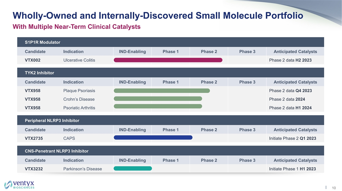 Disrupting Biologic-Dominated Immunology Markets With Differentiated Safe and Effective Oral Agents • Target indications remain underpenetrated • Paucity of oral agents with attractive risk/benefit profiles • Chronic disease populations - patients commonly cycle through therapies: – Suboptimal response rates in many autoimmune diseases (IBD, PsA, lupus) – Loss of response to biologic therapies over time (e.g. anti-drug antibodies) – Aversion to administration profile of available biologic therapies $70B 2 >11 million US patients $51B Dominated by injectable biologics High demand for oral agents 2021 2022 2023 2024 2025 2026 2027 2028 PsO CD UC PsA SLE PsO: plaque psoriasis; PsA: psoriatic arthritis; SLE: systemic lupus erythematosus; UC: ulcerative colitis; CD: Crohn’s disease. 1. 2021 total WW sales in PsO, PsA, SLE, UC, and CD per EvaluatePharma sourced in December 2022. 2. Epidemiology from CCFA, National Psoriasis Foundation, Lupus Foundation of America. 9