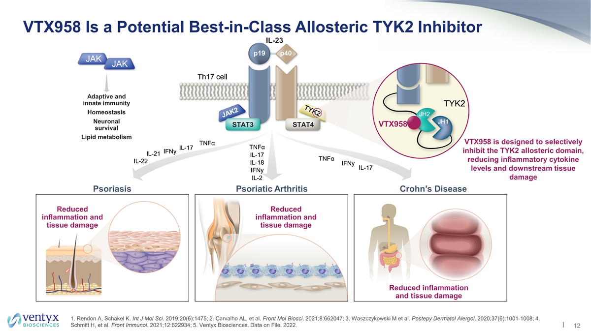 VTX958 Is a Potential Best-in-Class Allosteric TYK2 Inhibitor IL-23 p19 p40 JAK JAK Th17 cell Adaptive and innate immunity TYK2 Homeostasis JH2 Neuronal JH1 VTX958 STAT3 STAT4 survival Lipid metabolism VTX958 is designed to selectively TNFα TNFα IL-17 inhibit the TYK2 allosteric domain, IFNy IL-21 IL-17 TNFα reducing inflammatory cytokine IL-22 IL-18 IFNy IL-17 levels and downstream tissue IFNy IL-2 damage Psoriasis Psoriatic Arthritis Crohn’s Disease Reduced Reduced inflammation and inflammation and tissue damage tissue damage Reduced inflammation and tissue damage 1. Rendon A, Schäkel K. Int J Mol Sci. 2019;20(6):1475; 2. Carvalho AL, et al. Front Mol Biosci. 2021;8:662047; 3. Waszczykowski M et al. Postepy Dermatol Alergol. 2020;37(6):1001-1008; 4. Schmitt H, et al. Front Immunol. 2021;12:622934; 5. Ventyx Biosciences. Data on File. 2022. 12