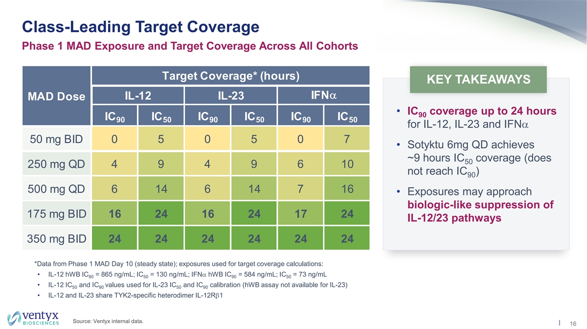 Selectively Inhibits IL-12, IL-23 and IFNα Signaling Potently Inhibits TYK2 Pathways No Measurable Inhibition of JAK1-Mediated Pathways Selective and potent inhibition of IL-12/23 and IFNα Lack of inhibition of IL-6, IL-10, IL-22 and other protective axis allows targeting pathways driving immune- cytokines may avoid potential adverse events associated mediated diseases with less selective inhibitors PROINFLAMMATORY INNATE & TH1/TH17 CYTOKINES PLEIOTROPIC CYTOKINES WITH PROTECTIVE FUNCTIONS Psoriasis Patient PBMC IL-23 IL-22 IL-10 IFNγ IL-4 IL-6 IL-12 IFNα DRUG DRUG IC (nM) IC (nM) IC (nM) IC (nM) IC (nM) IC (nM) IC (nM) IC (nM) 50 50 50 50 50 50 50 50 VTX958 VTX958 >10,000 >10,000 >10,000 >10,000 >10,000 35 5 12 deucravacitinib 10 10 5 deucravacitinib 114 20 350 249 464 • Potent activity against IL-23, a key cytokine implicated in several large immune/inflammatory indications KEY • Broad therapeutic window of VTX958 may allow for biologic-like target coverage in Phase 2/Phase 3 TAKEAWAYS • Selectivity advantages vs. Sotyktu expected to drive differentiated clinical profile Source: Ventyx internal data; assays conducted in peripheral blood mononuclear cells (PBMC) 15