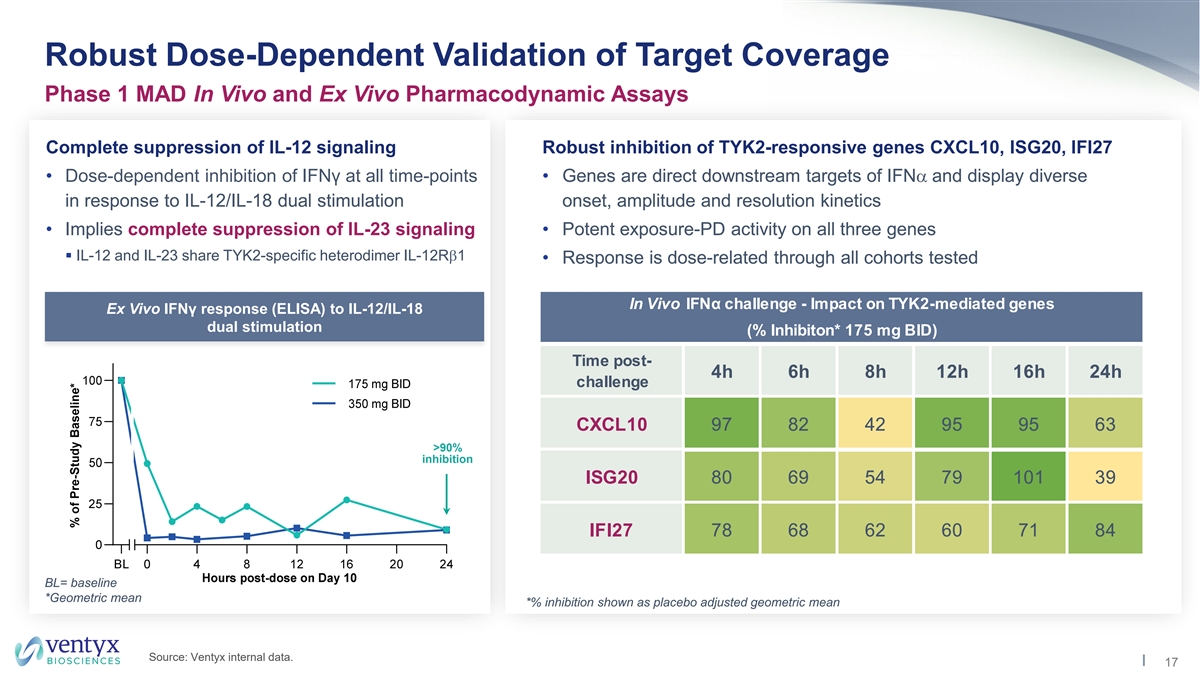 Class-Leading Target Coverage Phase 1 MAD Exposure and Target Coverage Across All Cohorts Target Coverage* (hours) KEY TAKEAWAYS IFNa IL-12 IL-23 MAD Dose • IC coverage up to 24 hours 90 IC IC IC IC IC IC 90 50 90 50 90 50 for IL-12, IL-23 and IFNa 50 mg BID 0 5 0 5 0 7 • Sotyktu 6mg QD achieves ~9 hours IC coverage (does 50 250 mg QD 4 9 4 9 6 10 not reach IC ) 90 500 mg QD 6 14 6 14 7 16 • Exposures may approach biologic-like suppression of 175 mg BID 16 24 16 24 17 24 IL-12/23 pathways 350 mg BID 24 24 24 24 24 24 *Data from Phase 1 MAD Day 10 (steady state); exposures used for target coverage calculations: • IL-12 hWB IC = 865 ng/mL; IC = 130 ng/mL; IFNa hWB IC = 584 ng/mL; IC = 73 ng/mL 90 50 90 50 • IL-12 IC and IC values used for IL-23 IC and IC calibration (hWB assay not available for IL-23) 50 90 50 90 • IL-12 and IL-23 share TYK2-specific heterodimer IL-12Rb1 Source: Ventyx internal data. 16