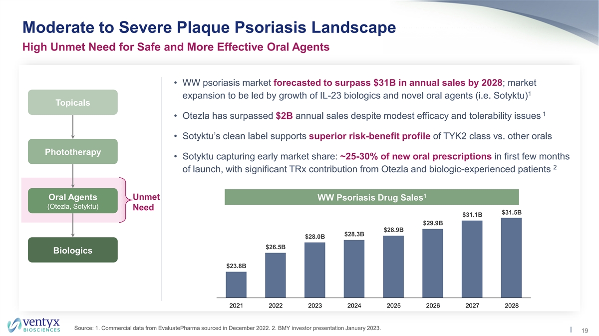 Moderate to Severe Plaque Psoriasis Landscape High Unmet Need for Safe and More Effective Oral Agents • WW psoriasis market forecasted to surpass $31B in annual sales by 2028; market 1 expansion to be led by growth of IL-23 biologics and novel oral agents (i.e. Sotyktu) Topicals 1 • Otezla has surpassed $2B annual sales despite modest efficacy and tolerability issues • Sotyktu’s clean label supports superior risk-benefit profile of TYK2 class vs. other orals Phototherapy • Sotyktu capturing early market share: ~25-30% of new oral prescriptions in first few months 2 of launch, with significant TRx contribution from Otezla and biologic-experienced patients 1 Oral Agents Unmet WW Psoriasis Drug Sales (Otezla, Sotyktu) Need $31.5B $31.1B $29.9B $28.9B $28.3B $28.0B $26.5B Biologics $23.8B 2021 2022 2023 2024 2025 2026 2027 2028 Source: 1. Commercial data from EvaluatePharma sourced in December 2022. 2. BMY investor presentation January 2023. 19