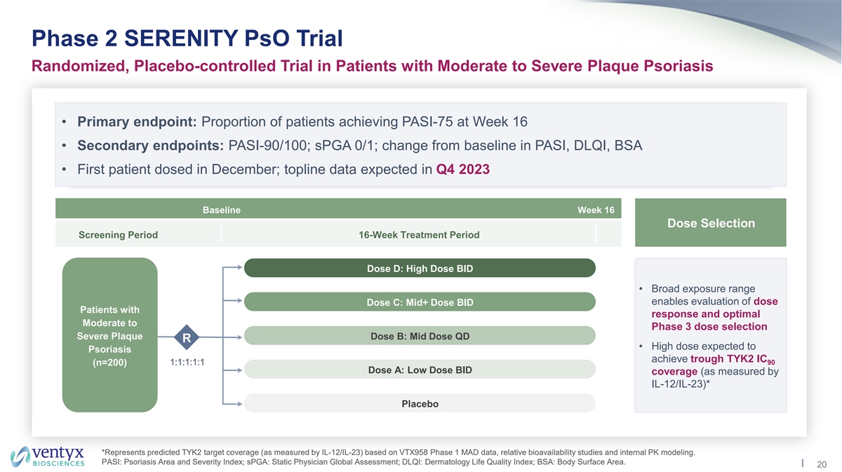 Phase 2 SERENITY PsO Trial Randomized, Placebo-controlled Trial in Patients with Moderate to Severe Plaque Psoriasis • Primary endpoint: Proportion of patients achieving PASI-75 at Week 16 • Secondary endpoints: PASI-90/100; sPGA 0/1; change from baseline in PASI, DLQI, BSA • First patient dosed in December; topline data expected in Q4 2023 Baseline Week 16 Dose Selection Screening Period 16-Week Treatment Period Dose D: High Dose BID • Broad exposure range enables evaluation of dose Dose C: Mid+ Dose BID Patients with response and optimal Moderate to Phase 3 dose selection Severe Plaque Dose B: Mid Dose QD R • High dose expected to Psoriasis achieve trough TYK2 IC 1:1:1:1:1 90 (n=200) Dose A: Low Dose BID coverage (as measured by IL-12/IL-23)* Placebo *Represents predicted TYK2 target coverage (as measured by IL-12/IL-23) based on VTX958 Phase 1 MAD data, relative bioavailability studies and internal PK modeling. PASI: Psoriasis Area and Severity Index; sPGA: Static Physician Global Assessment; DLQI: Dermatology Life Quality Index; BSA: Body Surface Area. 20