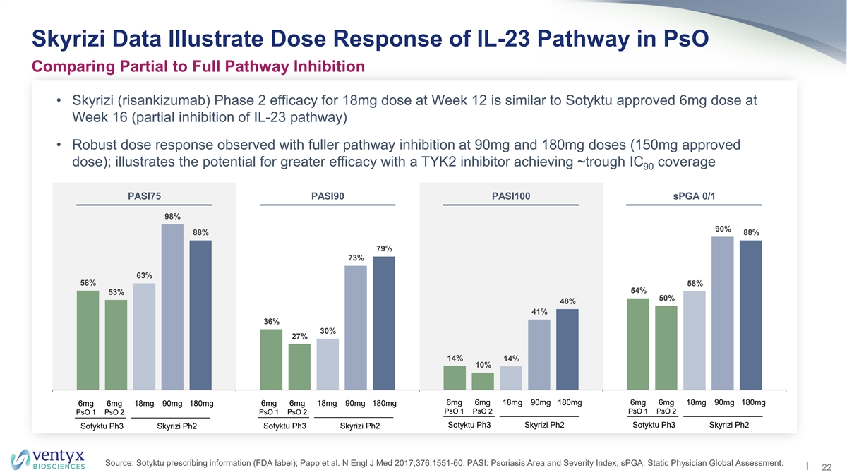 Target Profile Expected to Drive Clinical Differentiation Best-in-Disease Oral Potential in the ~$24B WW Annual Psoriasis Market Psoriasis Competitive Landscape 100% 86-91% 76-90% VTX958 Target Profile 80% Greater TYK2 suppression may produce improved efficacy compared to other 54-59% 60% oral agents, with potential to approach leading biologics 71-87% 78-85% 40% 29-33% 44-46% 20% 23-28% 0% IL-17 IL-23 p19 Otezla Deucravacitinib Next-Gen Allosteric (Biologic) (Biologic) PDE4 (Oral) TYK2 (Oral) TYK2 Inhibitors (Oral) Note: Solid area represents placebo-adjusted response rate; dashed area indicates total observed response rate; primary endpoint cut-off ranges from Week 10 to Week 16. Sources: Company reports and FDA labels for approved anti-IL-17 and anti-IL-23 biologics; market statistics sourced from EvaluatePharma. 21 PASI-75 (% responders) at Primary Endpoint Cut-off