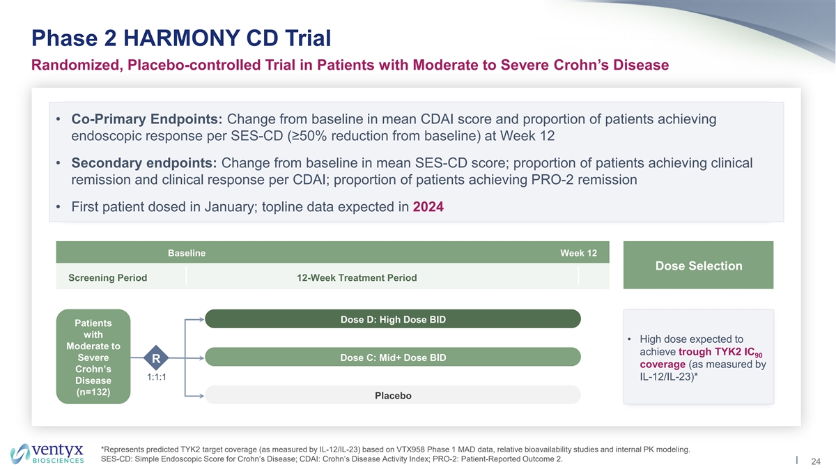 Moderate to Severe Crohn’s Disease Landscape Significant Opportunity Due to Lack of Safe and Effective Oral Agents • Crohn’s disease is a ~$13-15B+ annual market despite lack of safe and effective Aminosalicylates 1 (mild disease) oral agents available to treat moderate/severe disease • IL-23 mechanism is considered most efficacious by KOLs (same pathway targeted by TYK2 inhibition) Corticosteroids (induction) • Highly attractive opportunity for VTX958 based on broad therapeutic window and Unmet Need for first-mover advantage. Safe & Effective • Safe and effective oral agent could drive significant market expansion Oral Drugs Biologics 1 WW Crohn’s Disease Drug Sales $15.5B Humira LoE $14.8B JAKi / Oral $14.5B $14.0B $13.9B Immunosuppressants $13.4B $13.3B $12.5B Surgical Intervention 2021 2022 2023 2024 2025 2026 2027 2028 Source: 1. Commercial data from EvaluatePharma sourced in December 2022; Ventyx internal data. 23
