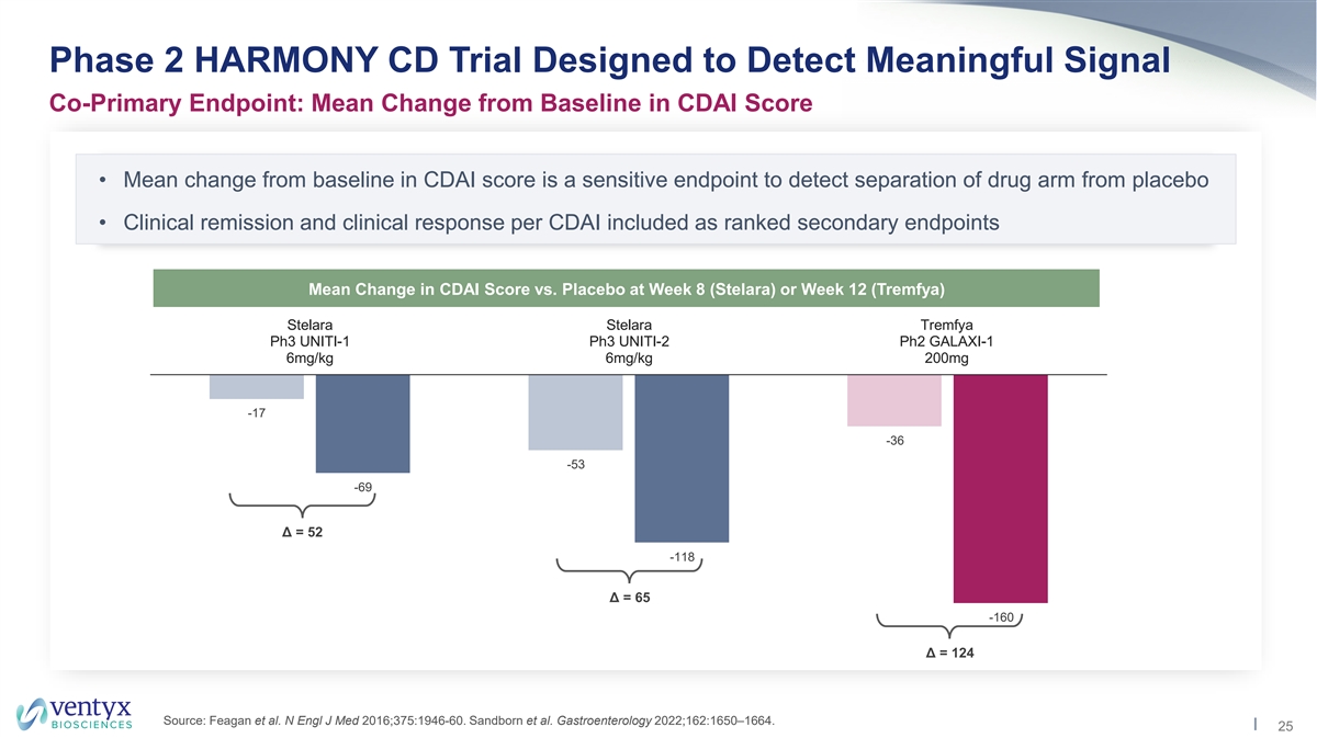 Phase 2 HARMONY CD Trial Randomized, Placebo-controlled Trial in Patients with Moderate to Severe Crohn’s Disease • Co-Primary Endpoints: Change from baseline in mean CDAI score and proportion of patients achieving endoscopic response per SES-CD (≥50% reduction from baseline) at Week 12 • Secondary endpoints: Change from baseline in mean SES-CD score; proportion of patients achieving clinical remission and clinical response per CDAI; proportion of patients achieving PRO-2 remission • First patient dosed in January; topline data expected in 2024 Baseline Week 12 Dose Selection Screening Period 12-Week Treatment Period Dose D: High Dose BID Patients with • High dose expected to Moderate to achieve trough TYK2 IC 90 Severe Dose C: Mid+ Dose BID R coverage (as measured by Crohn’s 1:1:1 IL-12/IL-23)* Disease (n=132) Placebo *Represents predicted TYK2 target coverage (as measured by IL-12/IL-23) based on VTX958 Phase 1 MAD data, relative bioavailability studies and internal PK modeling. SES-CD: Simple Endoscopic Score for Crohn’s Disease; CDAI: Crohn’s Disease Activity Index; PRO-2: Patient-Reported Outcome 2. 24