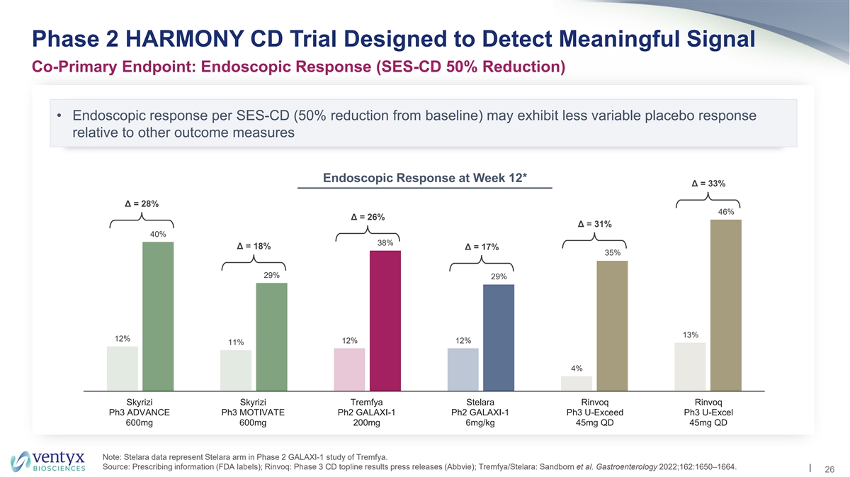 Phase 2 HARMONY CD Trial Designed to Detect Meaningful Signal Co-Primary Endpoint: Mean Change from Baseline in CDAI Score • Mean change from baseline in CDAI score is a sensitive endpoint to detect separation of drug arm from placebo • Clinical remission and clinical response per CDAI included as ranked secondary endpoints Mean Change in CDAI Score vs. Placebo at Week 8 (Stelara) or Week 12 (Tremfya) Stelara Stelara Tremfya Ph3 UNITI-1 Ph3 UNITI-2 Ph2 GALAXI-1 6mg/kg 6mg/kg 200mg -17 -36 -53 -69 Δ = 52 -118 Δ = 65 -160 Δ = 124 Source: Feagan et al. N Engl J Med 2016;375:1946-60. Sandborn et al. Gastroenterology 2022;162:1650–1664. 25