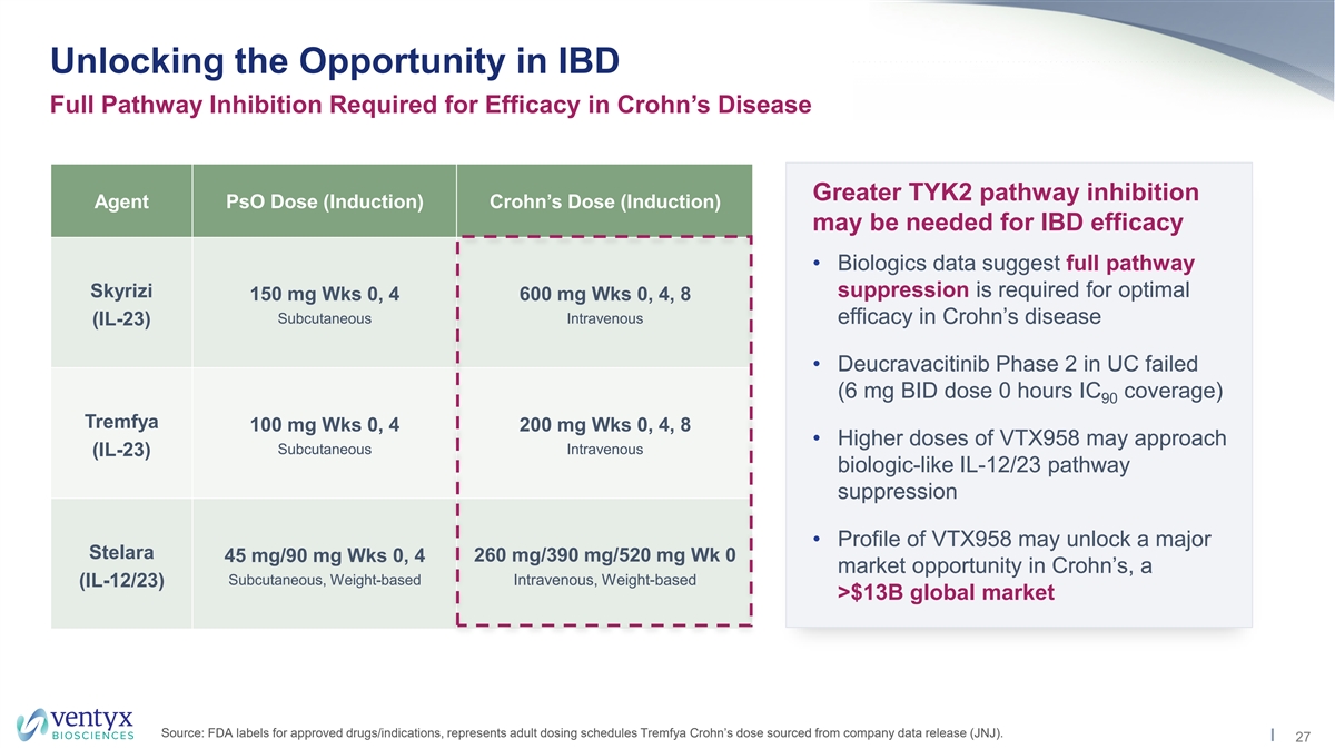 Phase 2 HARMONY CD Trial Designed to Detect Meaningful Signal Co-Primary Endpoint: Endoscopic Response (SES-CD 50% Reduction) • Endoscopic response per SES-CD (50% reduction from baseline) may exhibit less variable placebo response relative to other outcome measures Endoscopic Response at Week 12* Δ = 33% Δ = 28% 46% Δ = 26% Δ = 31% 40% 38% Δ = 18% Δ = 17% 35% 29% 29% 13% 12% 12% 12% 11% 4% Skyrizi Skyrizi Tremfya Stelara Rinvoq Rinvoq Ph3 ADVANCE Ph3 MOTIVATE Ph2 GALAXI-1 Ph2 GALAXI-1 Ph3 U-Exceed Ph3 U-Excel 600mg 600mg 200mg 6mg/kg 45mg QD 45mg QD Note: Stelara data represent Stelara arm in Phase 2 GALAXI-1 study of Tremfya. Source: Prescribing information (FDA labels); Rinvoq: Phase 3 CD topline results press releases (Abbvie); Tremfya/Stelara: Sandborn et al. Gastroenterology 2022;162:1650–1664. 26
