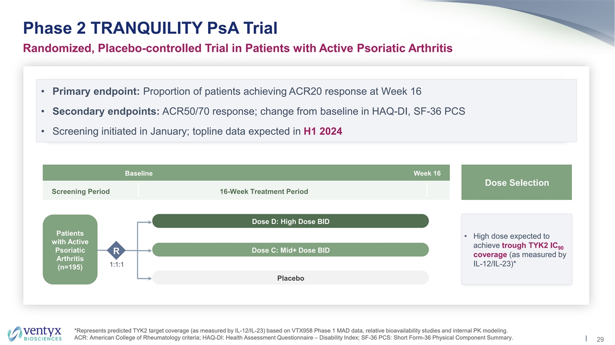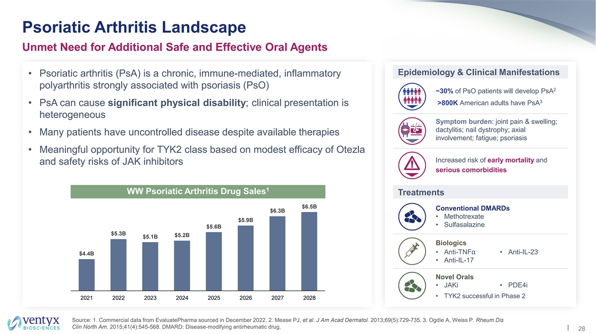 Psoriatic Arthritis Landscape Unmet Need for Additional Safe and Effective Oral Agents Epidemiology & Clinical Manifestations • Psoriatic arthritis (PsA) is a chronic, immune-mediated, inflammatory polyarthritis strongly associated with psoriasis (PsO) 2 ~30% of PsO patients will develop PsA 3 >800K American adults have PsA • PsA can cause significant physical disability; clinical presentation is heterogeneous Symptom burden: joint pain & swelling; dactylitis; nail dystrophy; axial • Many patients have uncontrolled disease despite available therapies involvement; fatigue; psoriasis • Meaningful opportunity for TYK2 class based on modest efficacy of Otezla Increased risk of early mortality and and safety risks of JAK inhibitors serious comorbidities 1 WW Psoriatic Arthritis Drug Sales Treatments $6.5B Conventional DMARDs $6.3B • Methotrexate $5.9B • Sulfasalazine $5.6B $5.3B $5.2B $5.1B Biologics • Anti-TNFα • Anti-IL-23 $4.4B • Anti-IL-17 Novel Orals • JAKi • PDE4i • TYK2 successful in Phase 2 2021 2022 2023 2024 2025 2026 2027 2028 Source: 1. Commercial data from EvaluatePharma sourced in December 2022. 2. Mease PJ, et al. J Am Acad Dermatol. 2013;69(5):729-735. 3. Ogdie A, Weiss P. Rheum Dis Clin North Am. 2015;41(4):545-568. DMARD: Disease-modifying antirheumatic drug. 28