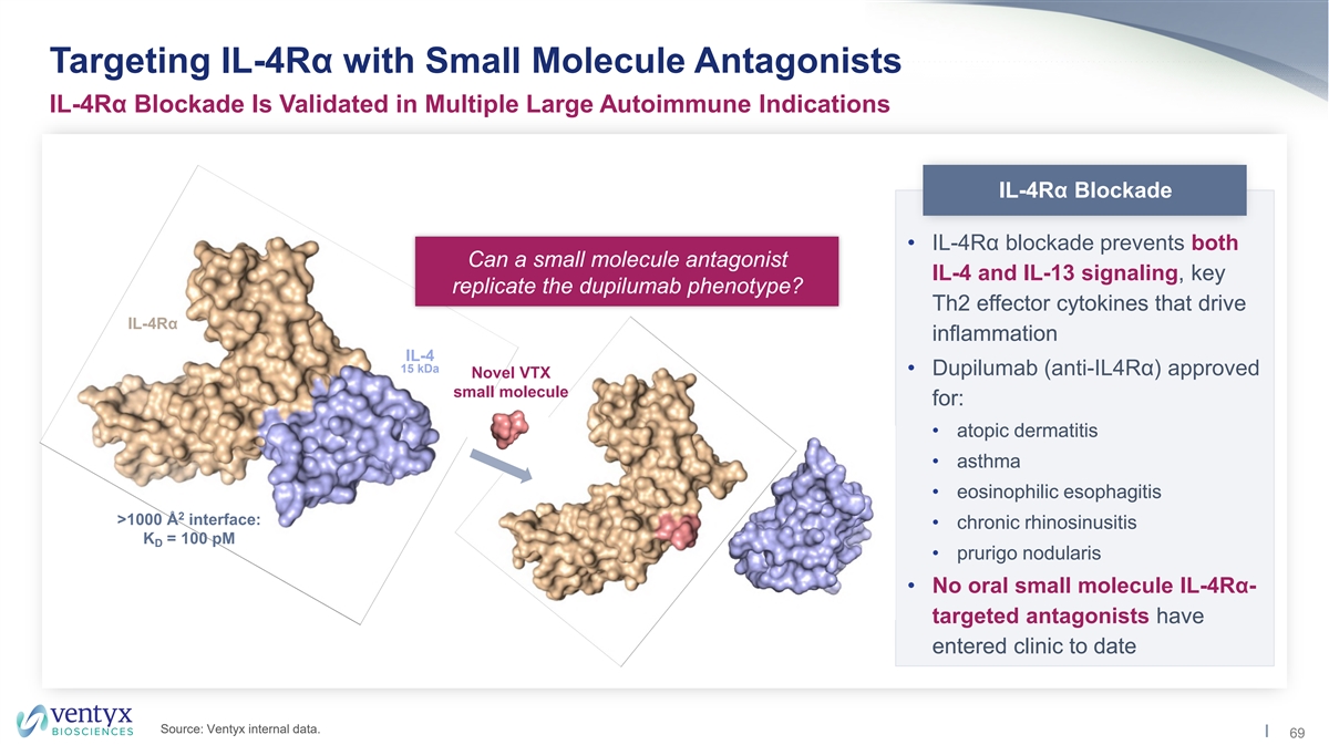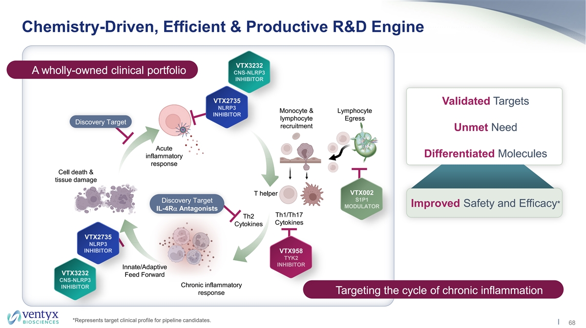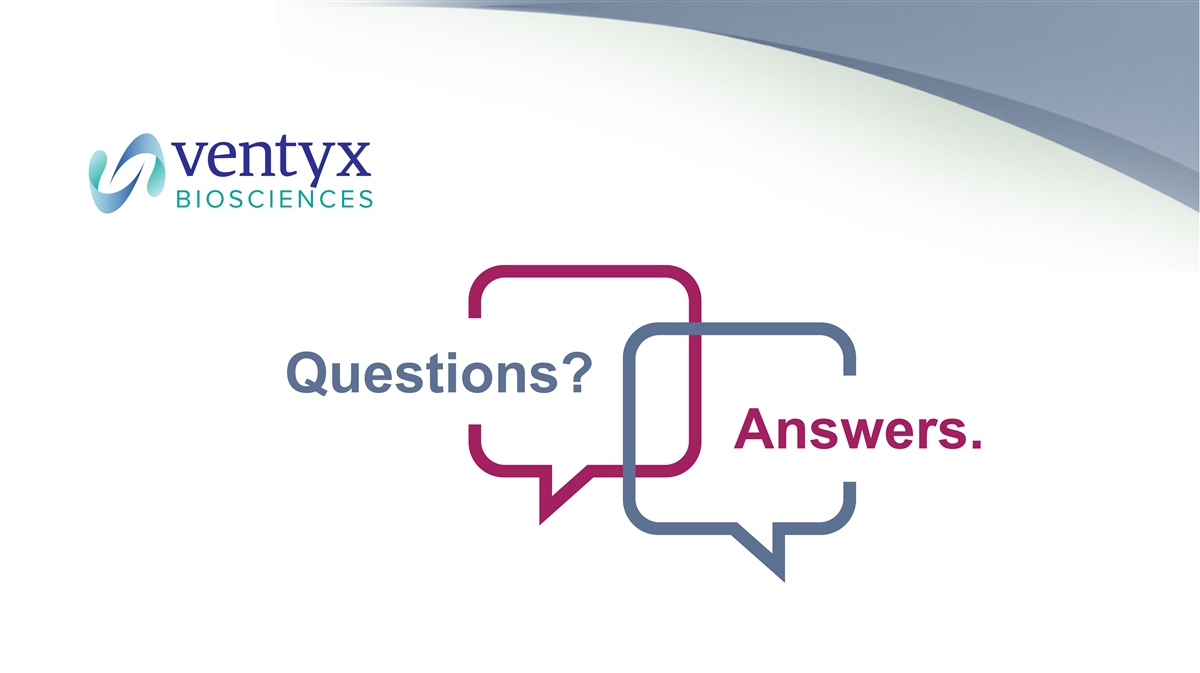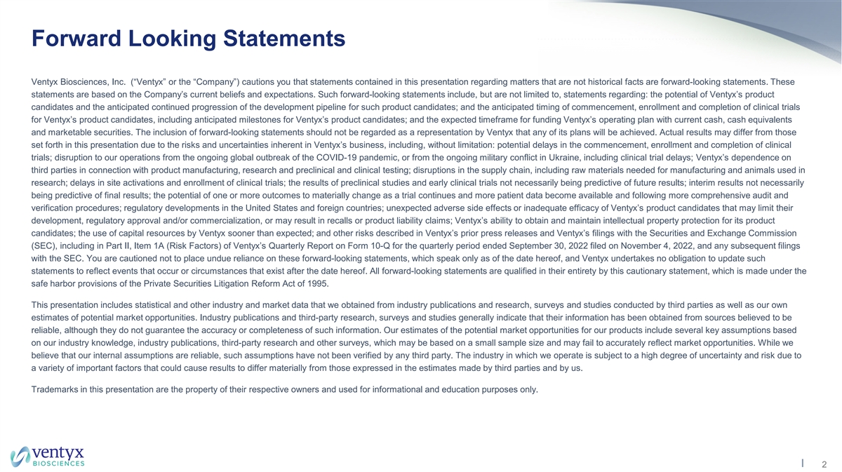 Forward Looking Statements Ventyx Biosciences, Inc. (“Ventyx” or the “Company”) cautions you that statements contained in this presentation regarding matters that are not historical facts are forward-looking statements. These statements are based on the Company’s current beliefs and expectations. Such forward-looking statements include, but are not limited to, statements regarding: the potential of Ventyx’s product candidates and the anticipated continued progression of the development pipeline for such product candidates; and the anticipated timing of commencement, enrollment and completion of clinical trials for Ventyx’s product candidates, including anticipated milestones for Ventyx’s product candidates; and the expected timeframe for funding Ventyx’s operating plan with current cash, cash equivalents and marketable securities. The inclusion of forward-looking statements should not be regarded as a representation by Ventyx that any of its plans will be achieved. Actual results may differ from those set forth in this presentation due to the risks and uncertainties inherent in Ventyx’s business, including, without limitation: potential delays in the commencement, enrollment and completion of clinical trials; disruption to our operations from the ongoing global outbreak of the COVID-19 pandemic, or from the ongoing military conflict in Ukraine, including clinical trial delays; Ventyx’s dependence on third parties in connection with product manufacturing, research and preclinical and clinical testing; disruptions in the supply chain, including raw materials needed for manufacturing and animals used in research; delays in site activations and enrollment of clinical trials; the results of preclinical studies and early clinical trials not necessarily being predictive of future results; interim results not necessarily being predictive of final results; the potential of one or more outcomes to materially change as a trial continues and more patient data become available and following more comprehensive audit and verification procedures; regulatory developments in the United States and foreign countries; unexpected adverse side effects or inadequate efficacy of Ventyx’s product candidates that may limit their development, regulatory approval and/or commercialization, or may result in recalls or product liability claims; Ventyx’s ability to obtain and maintain intellectual property protection for its product candidates; the use of capital resources by Ventyx sooner than expected; and other risks described in Ventyx’s prior press releases and Ventyx’s filings with the Securities and Exchange Commission (SEC), including in Part II, Item 1A (Risk Factors) of Ventyx’s Quarterly Report on Form 10-Q for the quarterly period ended September 30, 2022 filed on November 4, 2022, and any subsequent filings with the SEC. You are cautioned not to place undue reliance on these forward-looking statements, which speak only as of the date hereof, and Ventyx undertakes no obligation to update such statements to reflect events that occur or circumstances that exist after the date hereof. All forward-looking statements are qualified in their entirety by this cautionary statement, which is made under the safe harbor provisions of the Private Securities Litigation Reform Act of 1995. This presentation includes statistical and other industry and market data that we obtained from industry publications and research, surveys and studies conducted by third parties as well as our own estimates of potential market opportunities. Industry publications and third-party research, surveys and studies generally indicate that their information has been obtained from sources believed to be reliable, although they do not guarantee the accuracy or completeness of such information. Our estimates of the potential market opportunities for our products include several key assumptions based on our industry knowledge, industry publications, third-party research and other surveys, which may be based on a small sample size and may fail to accurately reflect market opportunities. While we believe that our internal assumptions are reliable, such assumptions have not been verified by any third party. The industry in which we operate is subject to a high degree of uncertainty and risk due to a variety of important factors that could cause results to differ materially from those expressed in the estimates made by third parties and by us. Trademarks in this presentation are the property of their respective owners and used for informational and education purposes only. 2