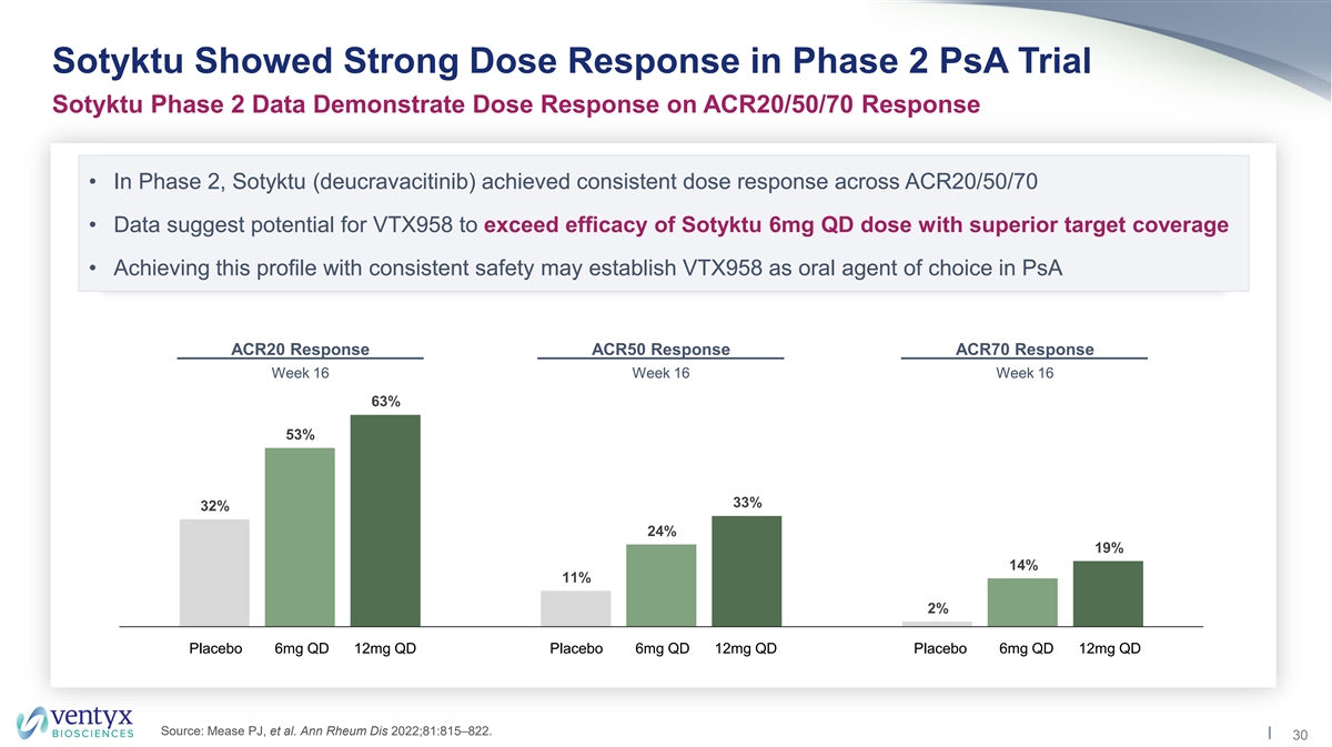 Sotyktu Phase 2 Efficacy (12mg) Competitive with Best Oral Agents Psoriatic Arthritis Landscape (Oral Agents) – ACR20 and ACR50 Response • Sotyktu 12mg QD dose achieved efficacy comparable to best available oral agents in Phase 2 (12mg QD achieves ~18 hours IC coverage; does not achieve IC coverage) 50 90 • Data suggest potential for VTX958 to achieve best-in-disease oral efficacy with greater pathway suppression (up to trough IC coverage) 90 Placebo-Adjusted ACR20 Response Placebo-Adjusted ACR50 Response Phase 3 Trials and Sotyktu Phase 2 Phase 3 Trials and Sotyktu Phase 2 35% 33% 31% 27% 26% 24% 22% 22% 21% 19% 19% 17% 15% 14% 13% 10% 7% 6% Xeljanz Xeljanz Rinvoq Rinvoq Otezla Otezla Otezla Sotyktu Ph2 Sotyktu Ph2 Xeljanz Xeljanz Rinvoq Rinvoq Otezla Otezla Otezla Sotyktu Ph2 Sotyktu Ph2 PsA 1 PsA 2 PsA 1 PsA 2 PsA 1 PsA 2 PsA 3 6mg QD 12mg QD PsA 1 PsA 2 PsA 1 PsA 2 PsA 1 PsA 2 PsA 3 6mg QD 12mg QD Month 3 Month 3 Week 12 Week 12 Week 16 Week 16 Week 16 Week 16 Week 16 Month 3 Month 3 Week 12 Week 12 Week 16 Week 16 Week 16 Week 16 Week 16 Source: Prescribing information (FDA label) for each approved agent; Sotyktu: Mease PJ, et al. Ann Rheum Dis 2022;81:815–822. 32