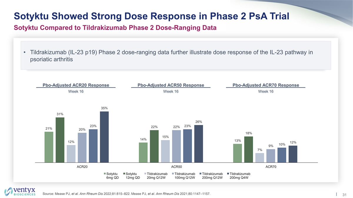 Sotyktu Showed Strong Dose Response in Phase 2 PsA Trial Sotyktu Phase 2 Data Demonstrate Dose Response on ACR20/50/70 Response • In Phase 2, Sotyktu (deucravacitinib) achieved consistent dose response across ACR20/50/70 • Data suggest potential for VTX958 to exceed efficacy of Sotyktu 6mg QD dose with superior target coverage • Achieving this profile with consistent safety may establish VTX958 as oral agent of choice in PsA ACR20 Response ACR50 Response ACR70 Response Week 16 Week 16 Week 16 63% 53% 33% 32% 24% 19% 14% 11% 2% ACR20 ACR50 ACR70 Placebo 6mg QD 12mg QD Placebo 6mg QD 12mg QD Placebo 6mg QD 12mg QD Source: Mease PJ, et al. Ann Rheum Dis 2022;81:815–822. 30